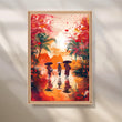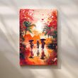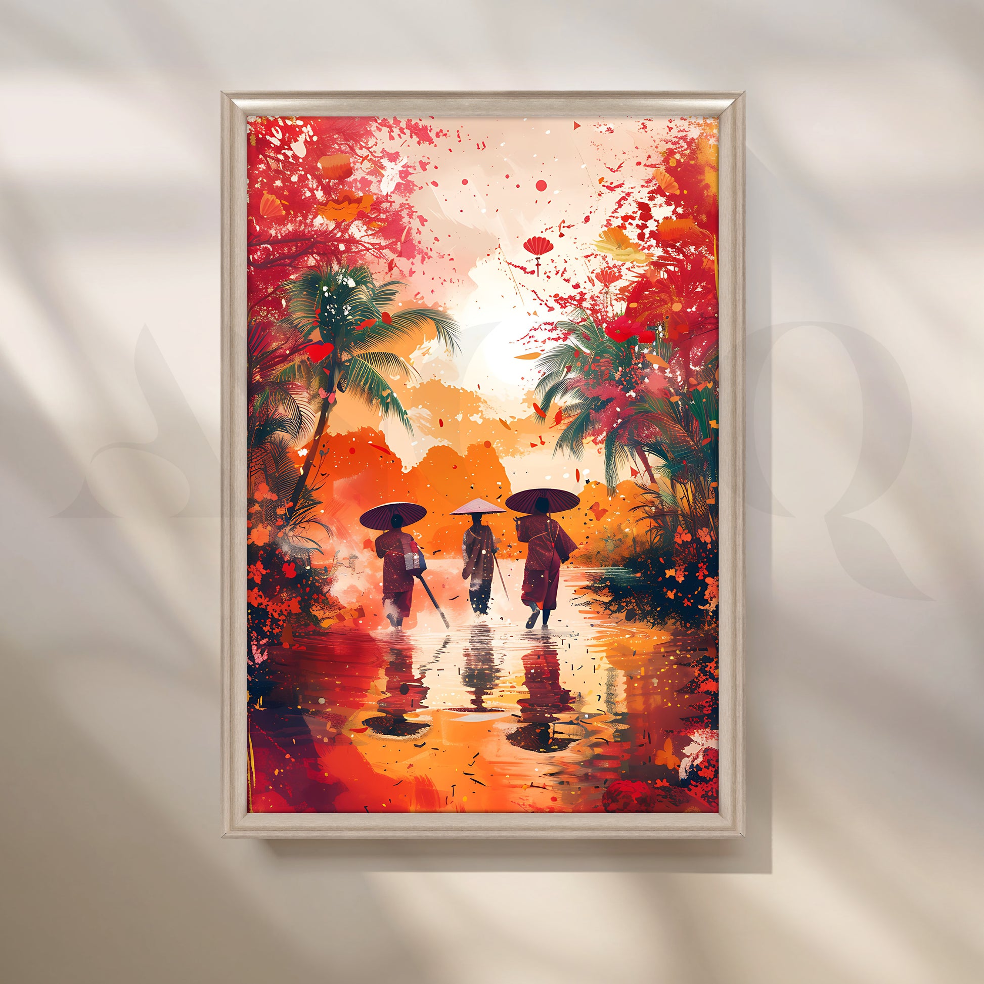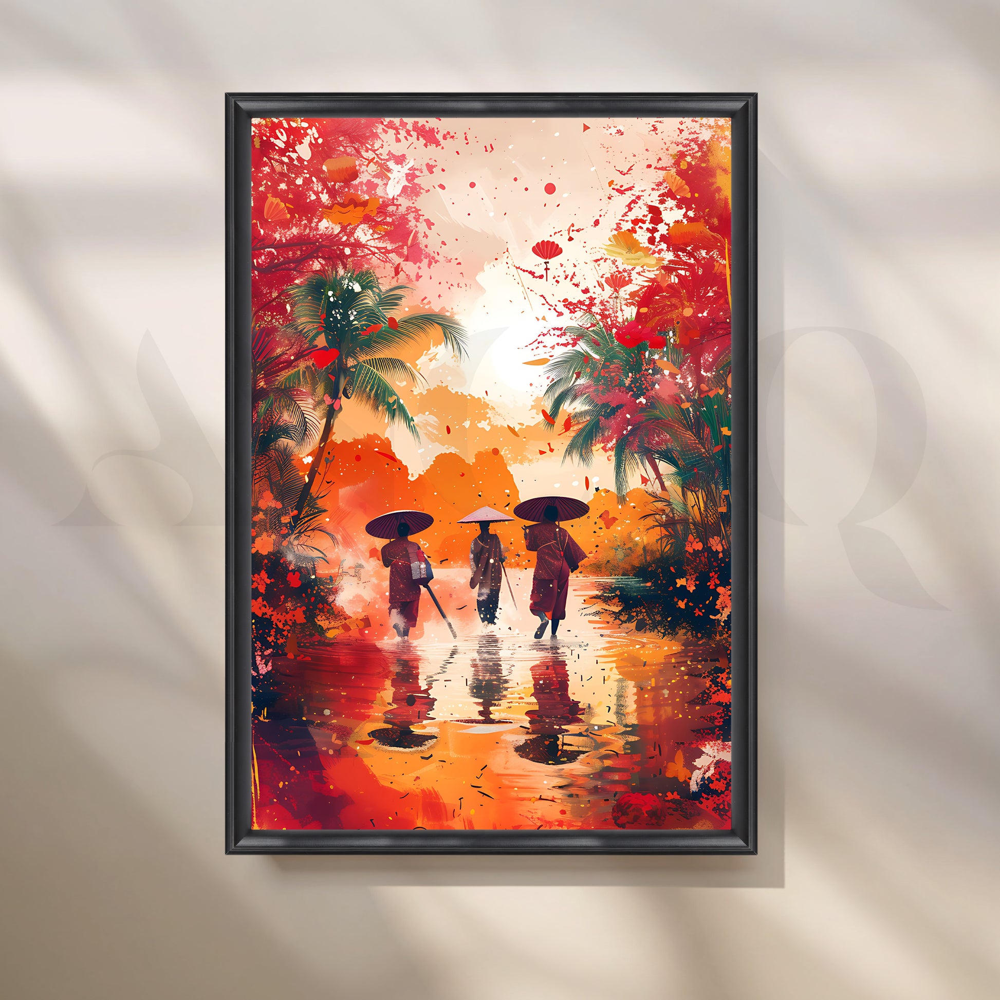 Anciq’s Monsoon Reflections canvas artwork bursts with energy and colour. Three figures in traditional attire and conical hats walk through shimmering water, framed by palm trees and an expressive splash of orange, red and coral tones. Painterly splatters and reflections create a dynamic, contemporary take on Asian landscape art.