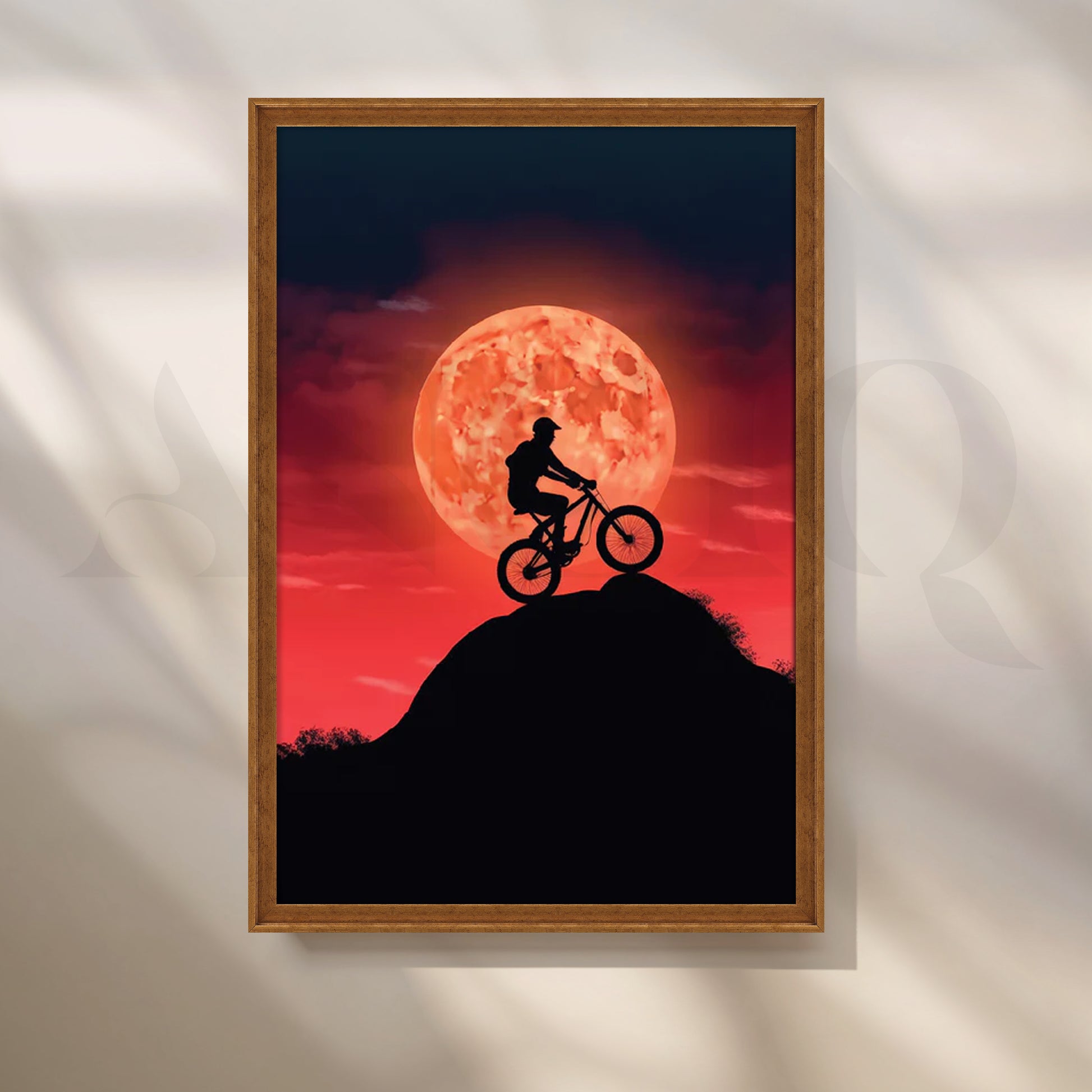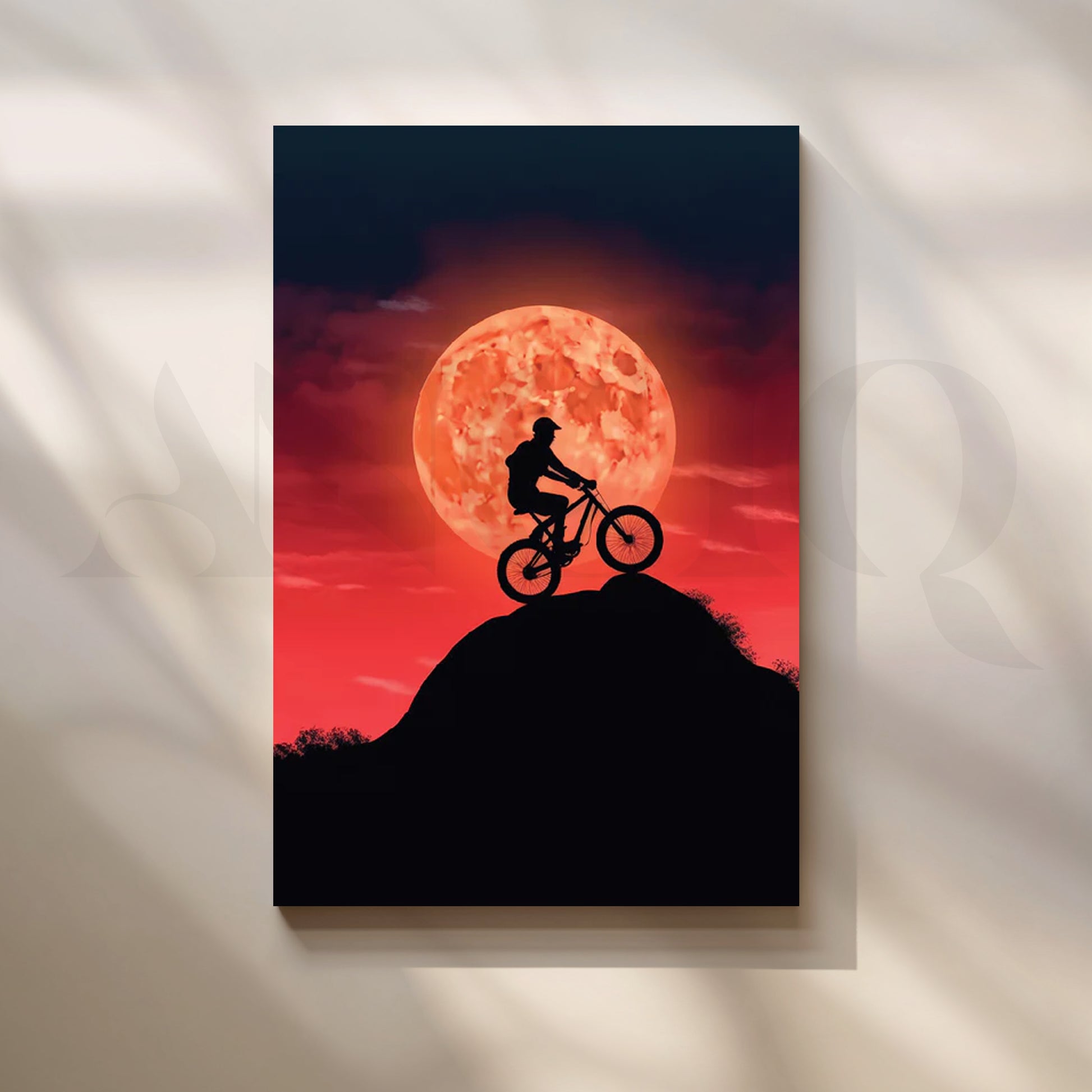 “Moonrise Rider” captures a lone cyclist in crisp black silhouette cresting a hill beneath a glowing harvest moon and fiery red dusk sky. The bold contrast, minimalist composition, and cinematic nightscape palette (ember reds, warm orange, deep charcoal) create striking modern wall art that energizes any space. Perfect for a modern living room, home office, gaming room, or teen bedroom, this abstract landscape doubles as cycling wall art and adventure décor. Style it as a large canvas painting for a statement gallery wall—search-friendly: modern wall art, moon art canvas, cyclist artwork, minimalist canvas painting, large living room art, office wall décor, gift for bikers.