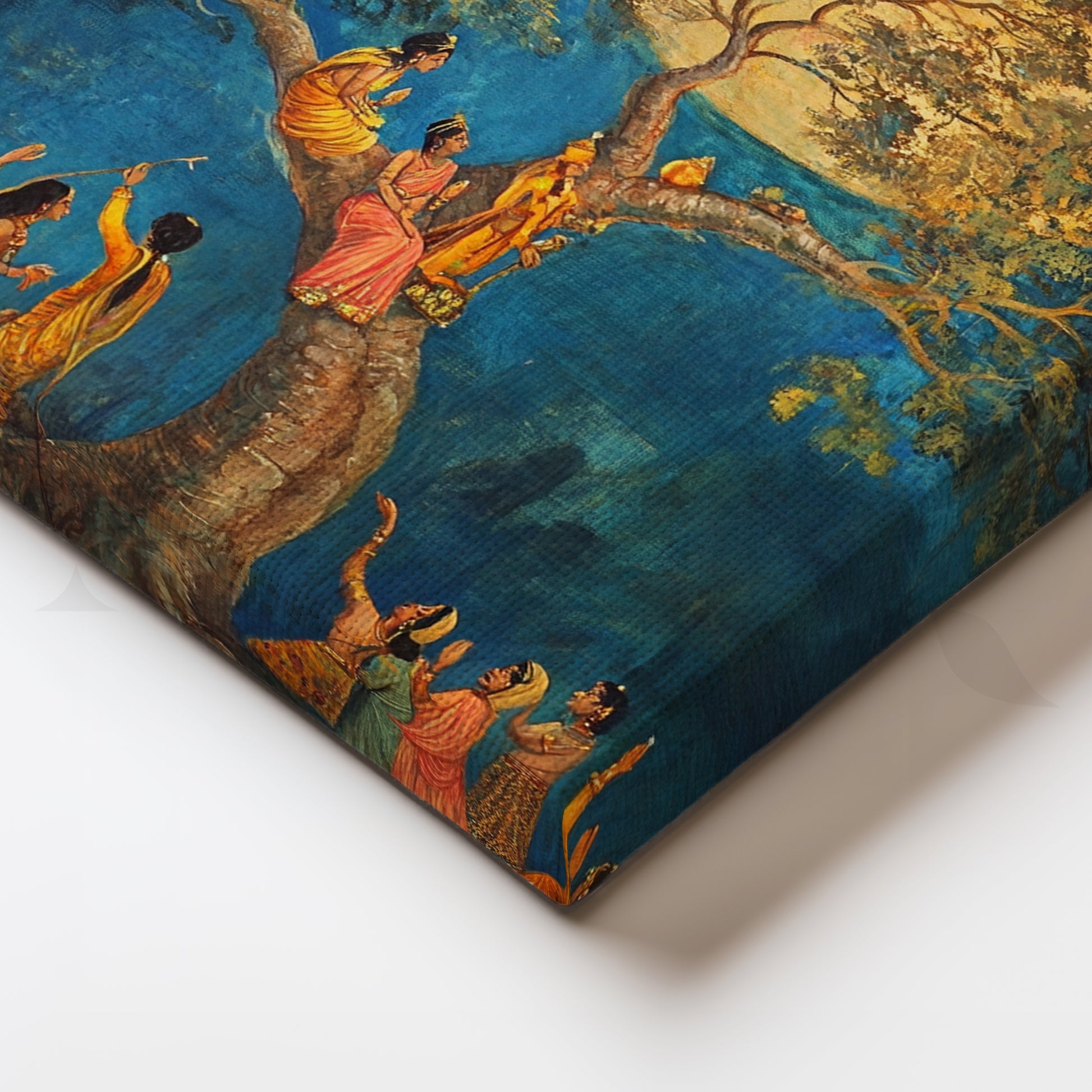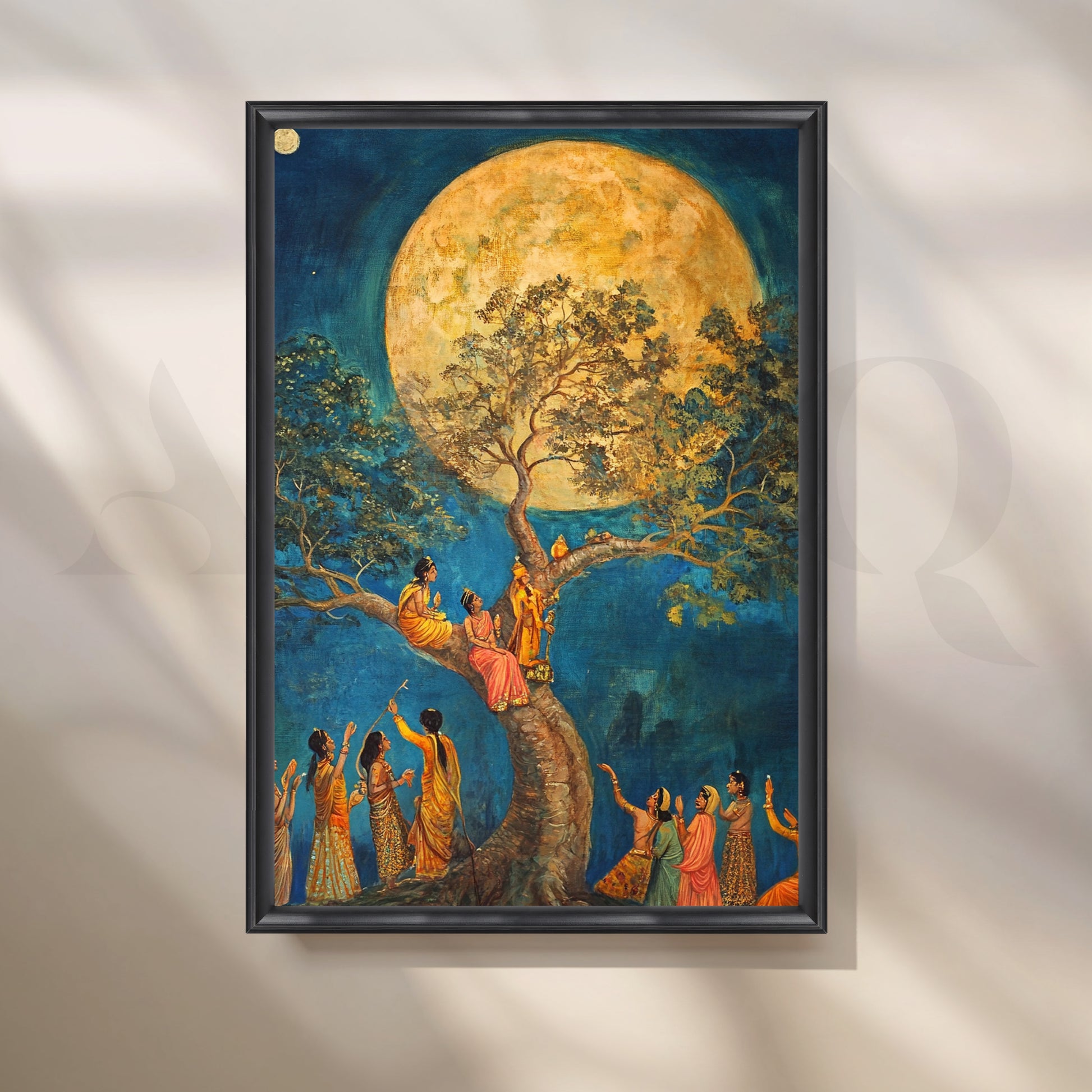Anciq ‘Moonlit Gathering’ Canvas Artwork for Living Room captures a mystical scene of women beneath a full moon, symbolizing celebration and connection with nature. The deep blues and golden tones evoke serenity, making it perfect for spiritual or boho-themed interiors. Ideal for living rooms, meditation corners, or art-focused entryways, this painting blends storytelling with rich Indian folk influences—an elegant choice for those searching for Indian mythology wall art or celestial-themed canvas paintings.