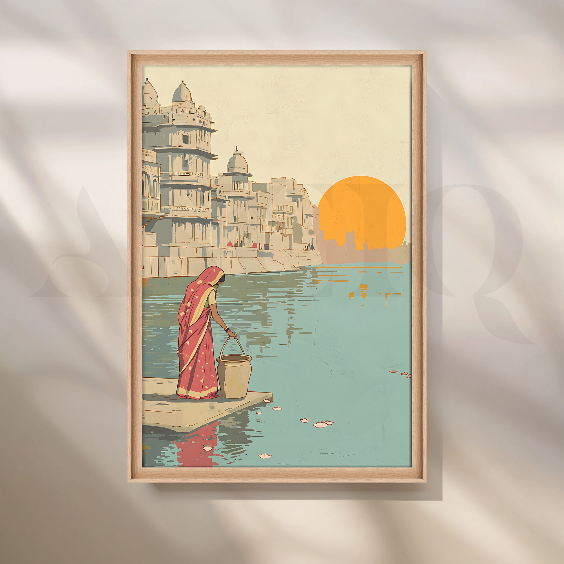 Anciq ‘Morning by the Ghats’ Canvas Artwork for Entryway portrays a woman in a red saree collecting water by the river, set against traditional architecture and a rising sun. The pastel palette of beige, orange, and teal adds cultural warmth to your space