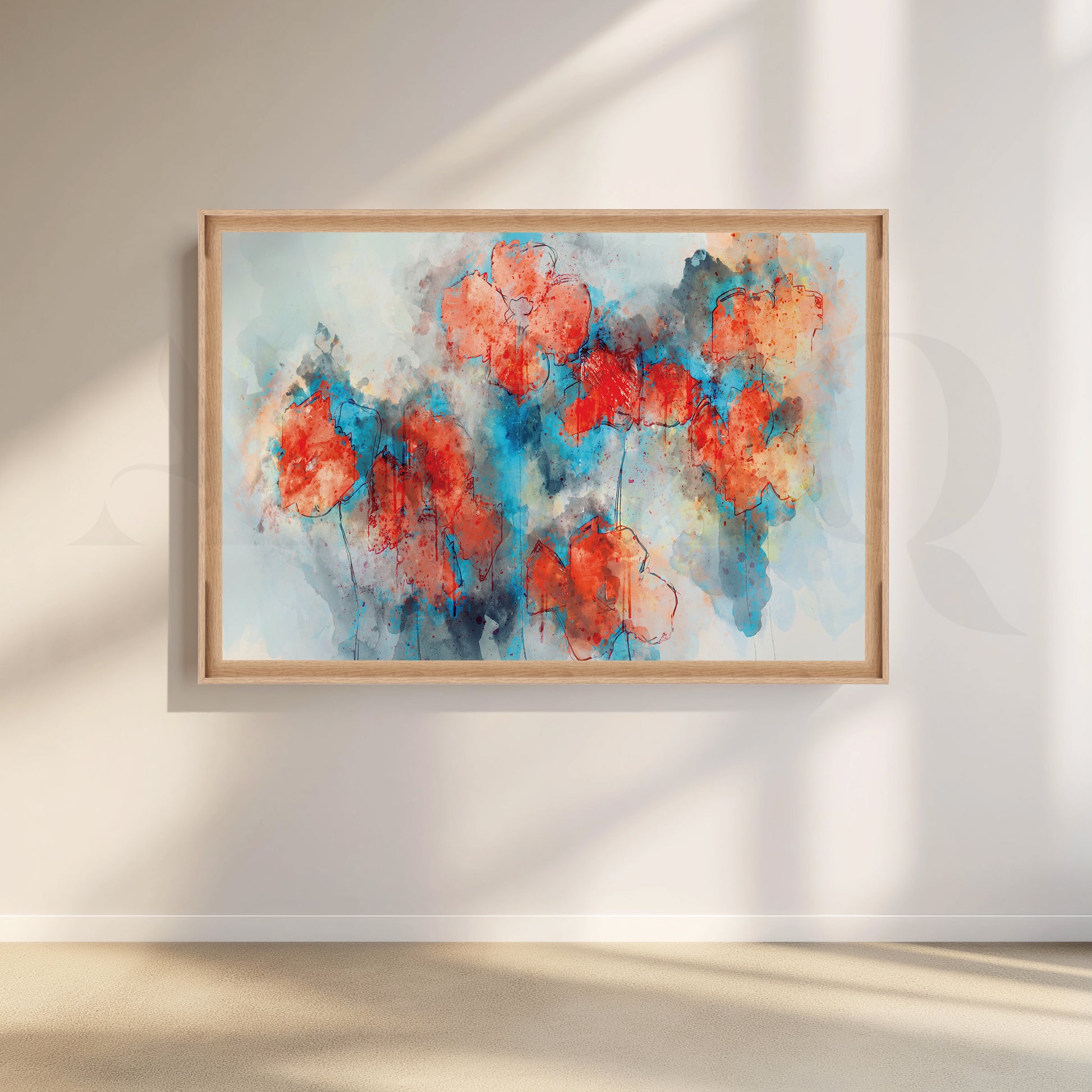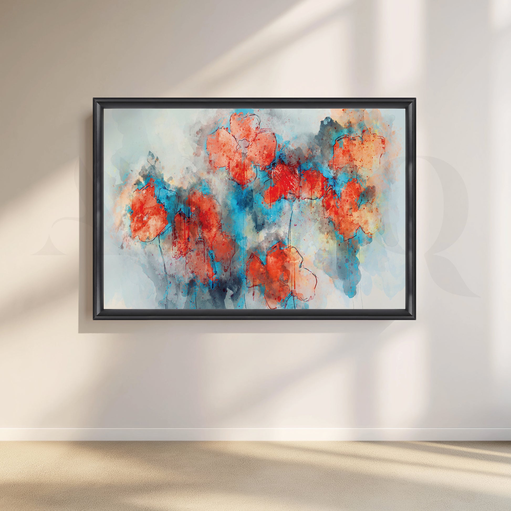 This vibrant floiral canvas features a stunning beauty of red and blue flowers cohesive to a white background. The painting strokes add a pop of color and give the piece a lively and energetic feel. This would be a great addition to a contemporary living room or bedroom.