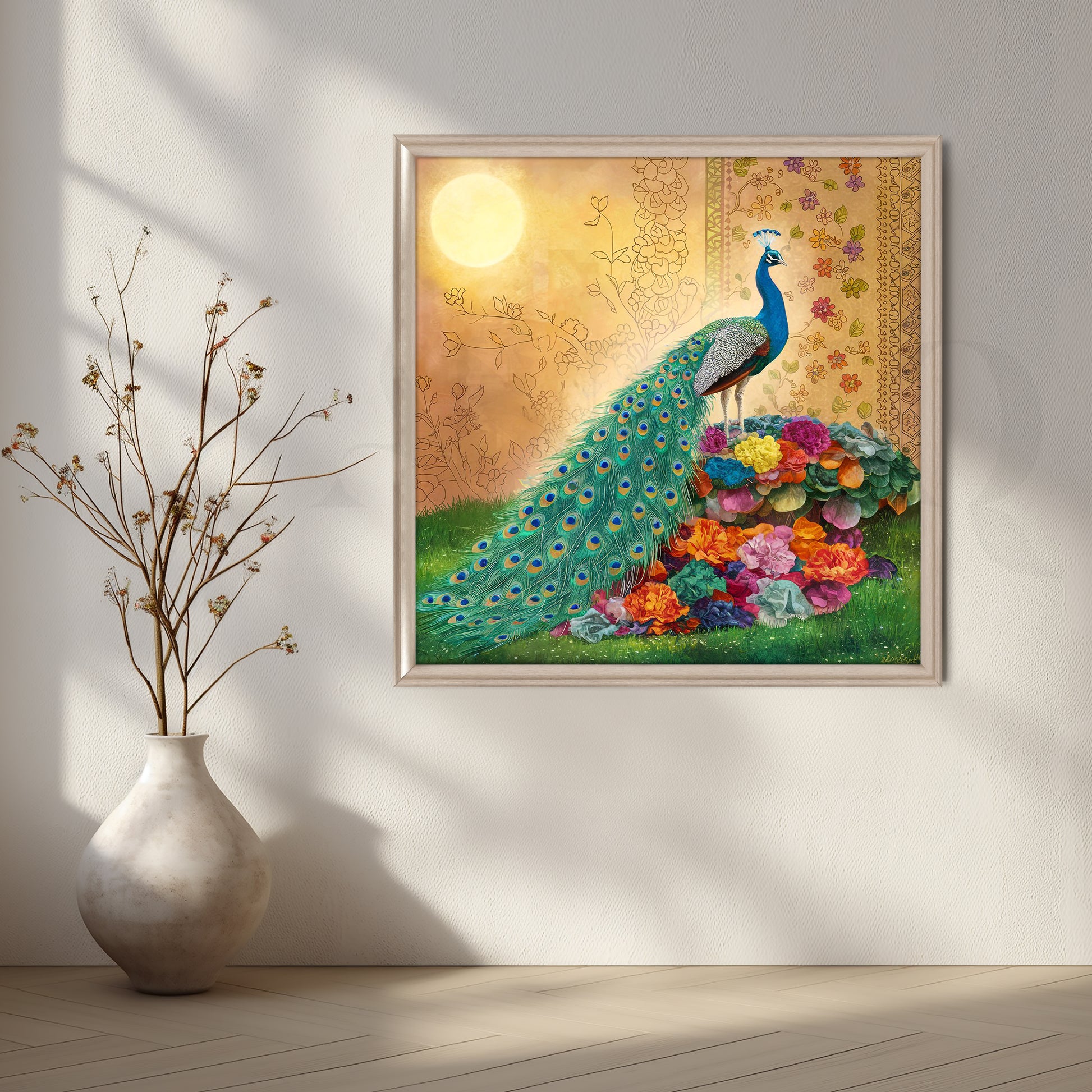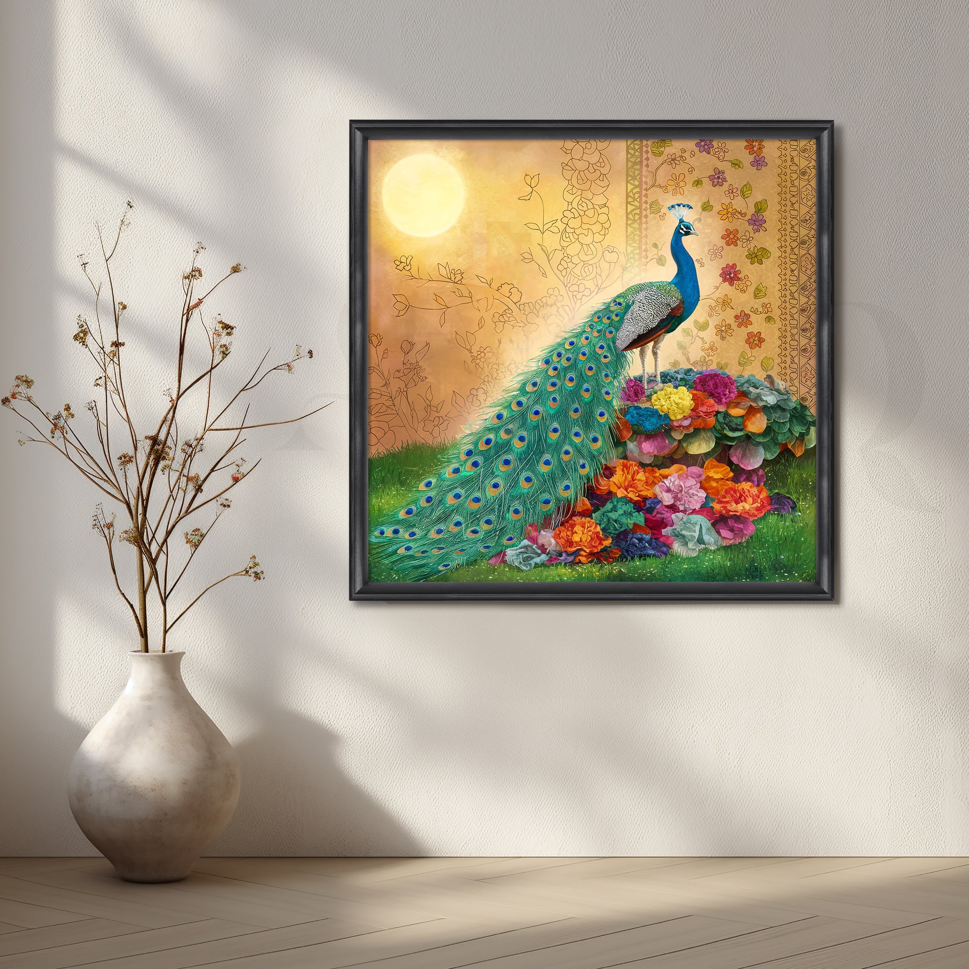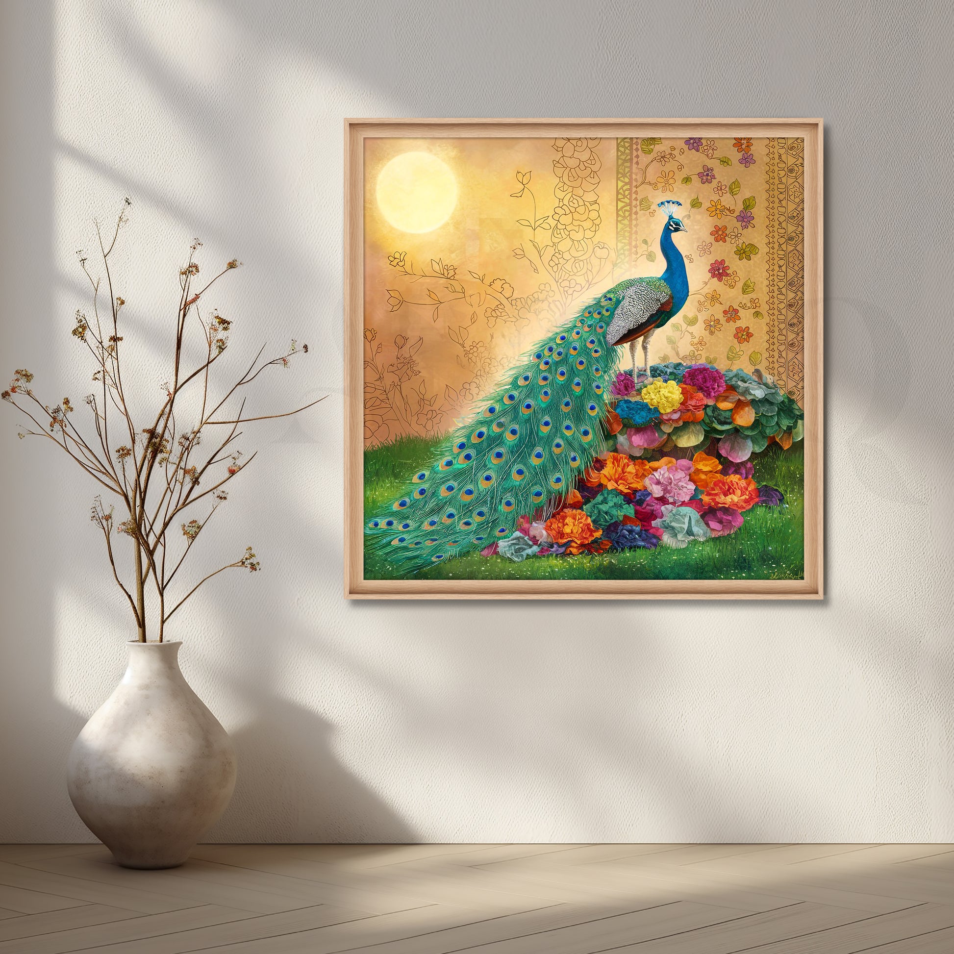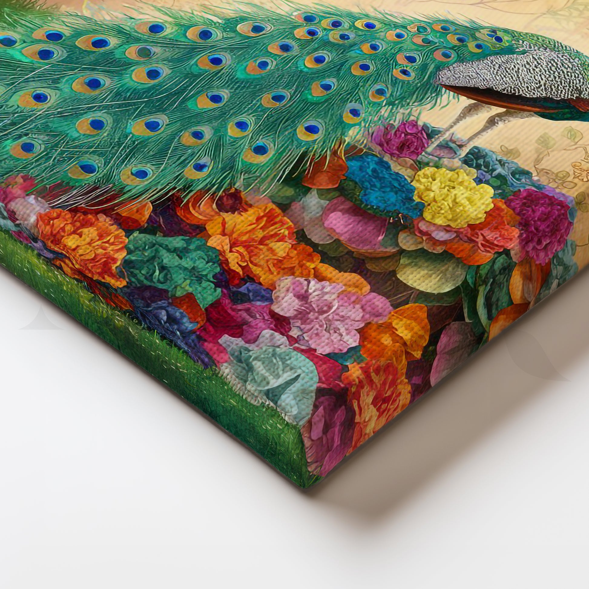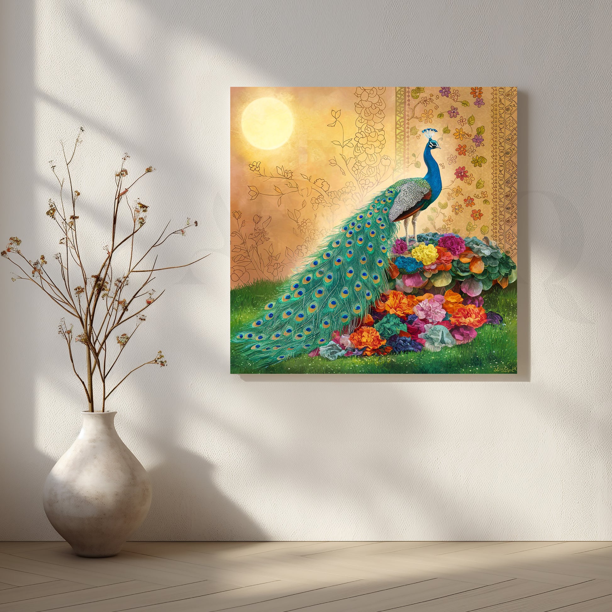 Anciq ‘Morning Glory Peacock’ Canvas Artwork radiates elegance with a vibrant peacock basking in sunlight over a bed of colorful florals. Ideal for bright living spaces or entryways. Keywords: peacock wall painting, colorful bird art, nature-inspired decor, vibrant wall art, elegant peacock artwork.