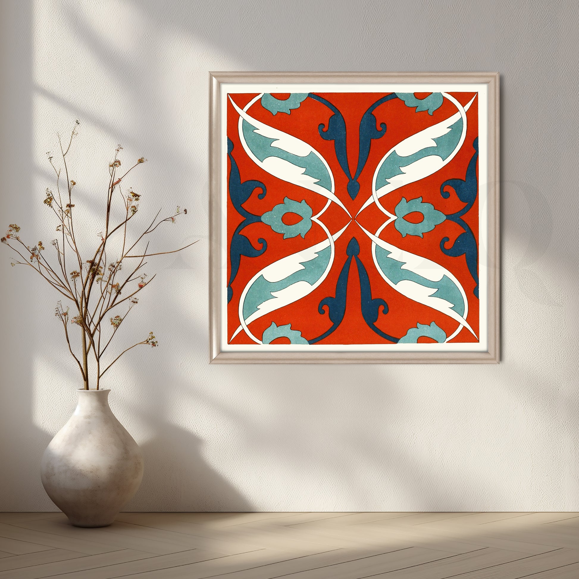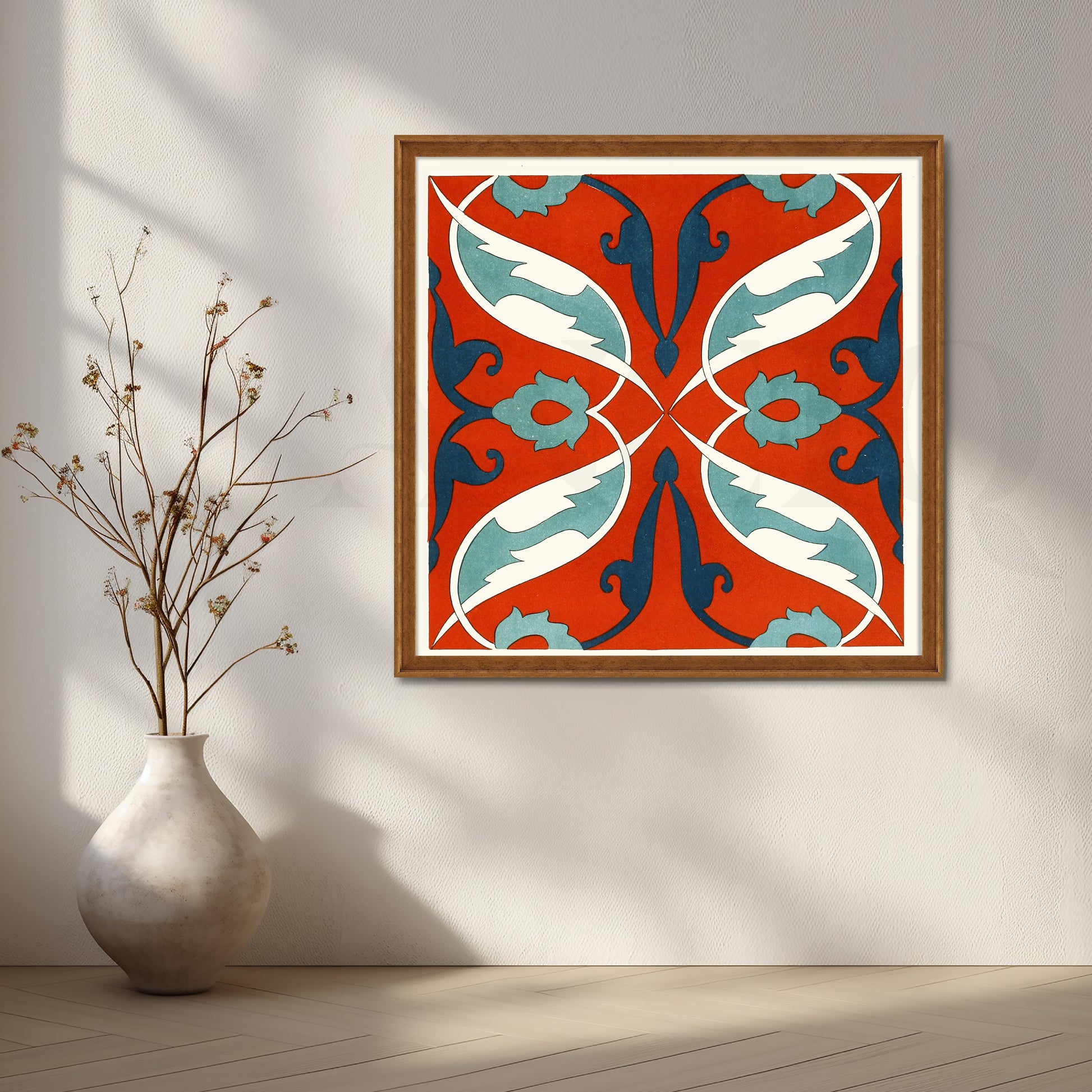 Inspired by classic Moroccan tiles, this square canvas artwork showcases bold red, teal and white ornamental motifs framed in ivory. It adds a rich, global accent to entryways, dining rooms and cozy corners. Ideal for those seeking ethnic wall art, Moroccan pattern canvas and colourful boho home decor.