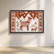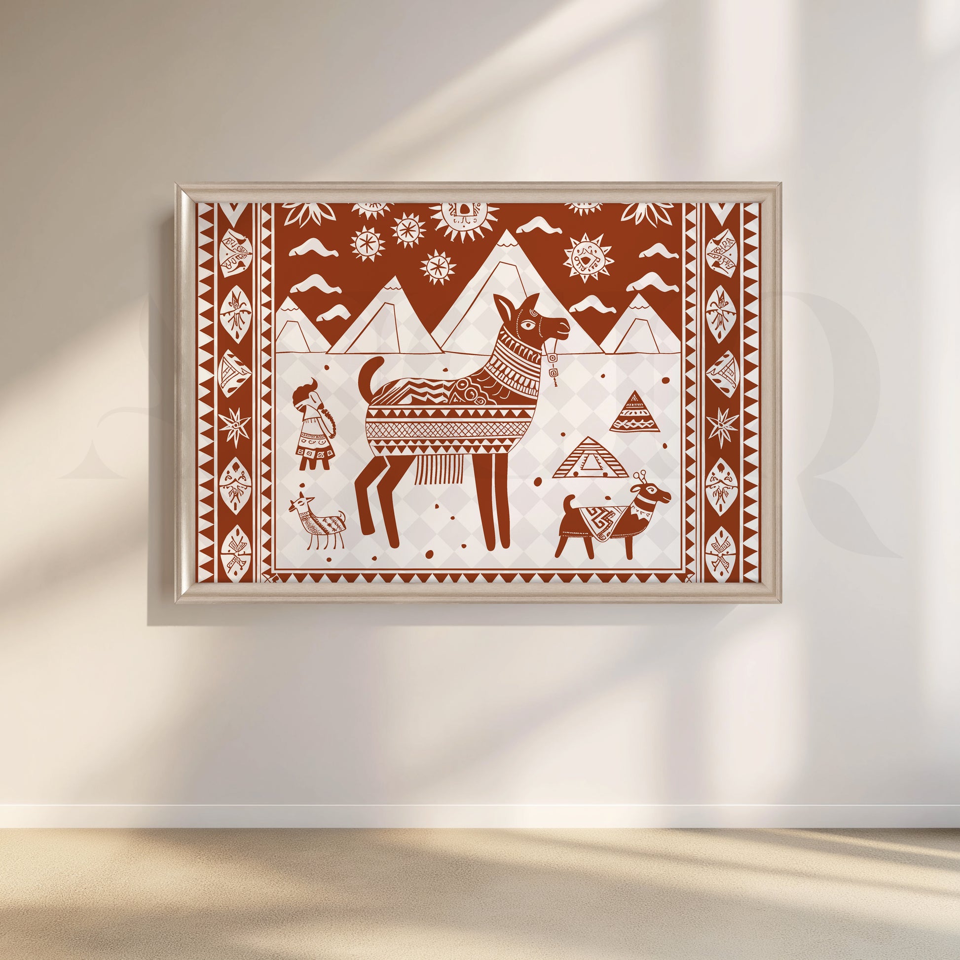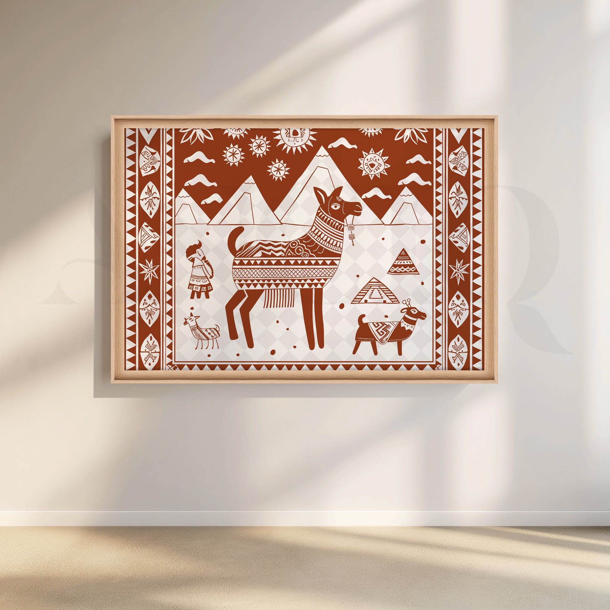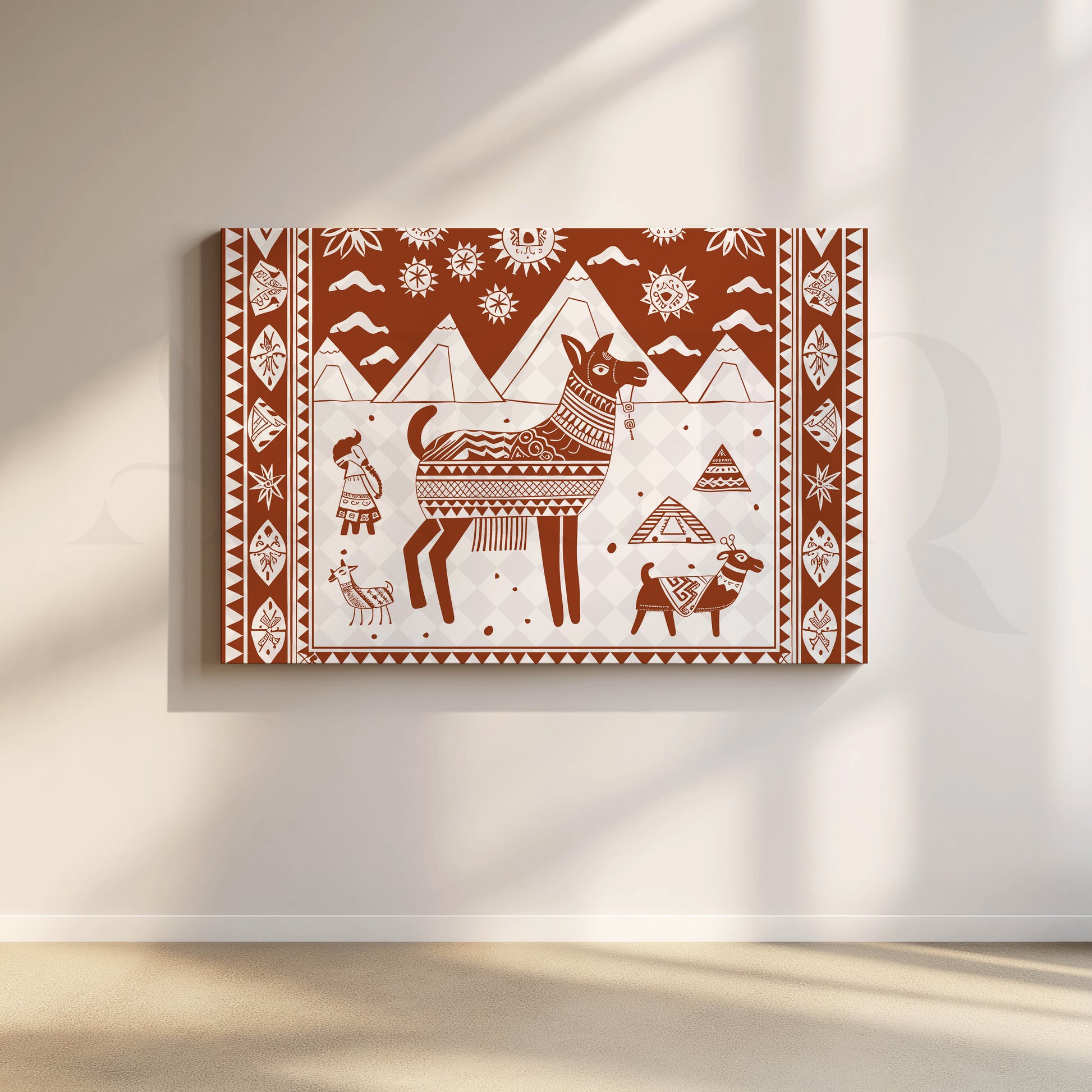 Depicting llamas, mountains, and tribal elements in warm terracotta tones, this Anciq artwork brings a cozy ethnic charm to dining rooms or hallways. Keywords: tribal wall painting, mountain landscape art, ethnic animal canvas, terracotta artwork, boho dining room decor.