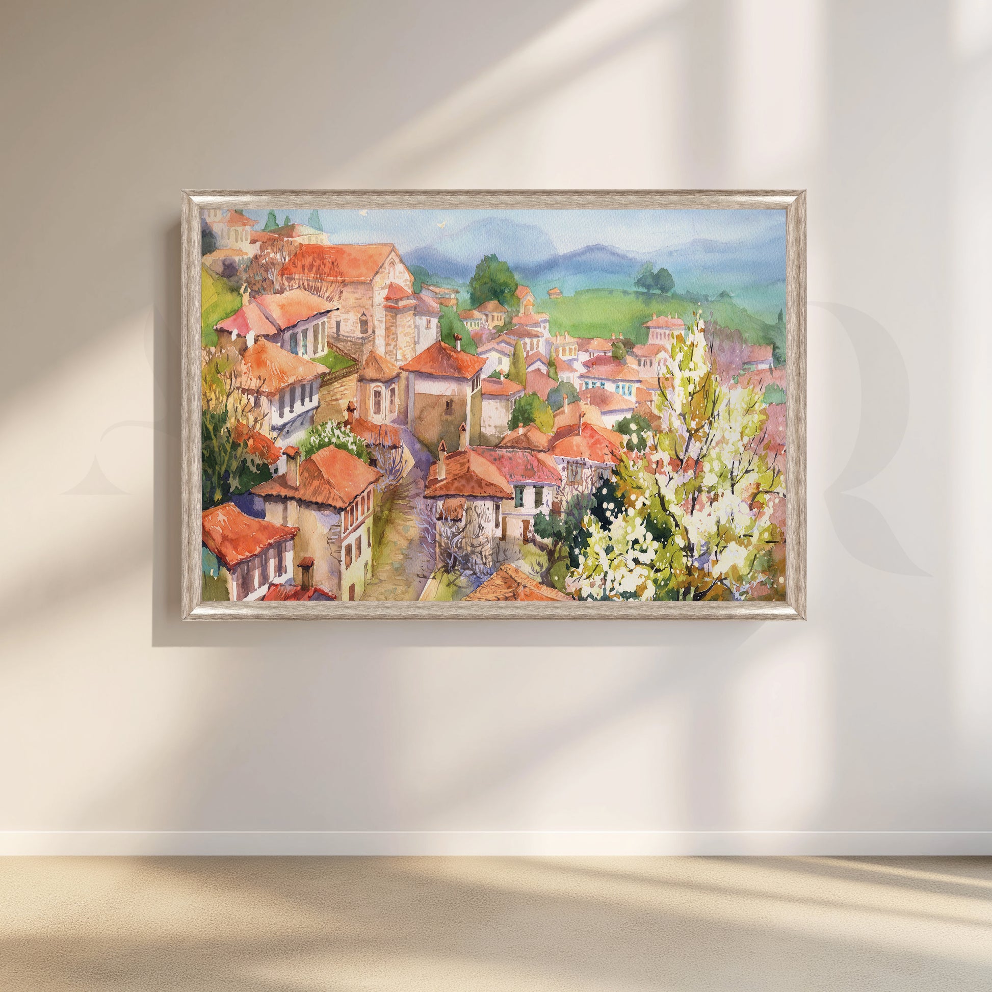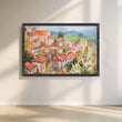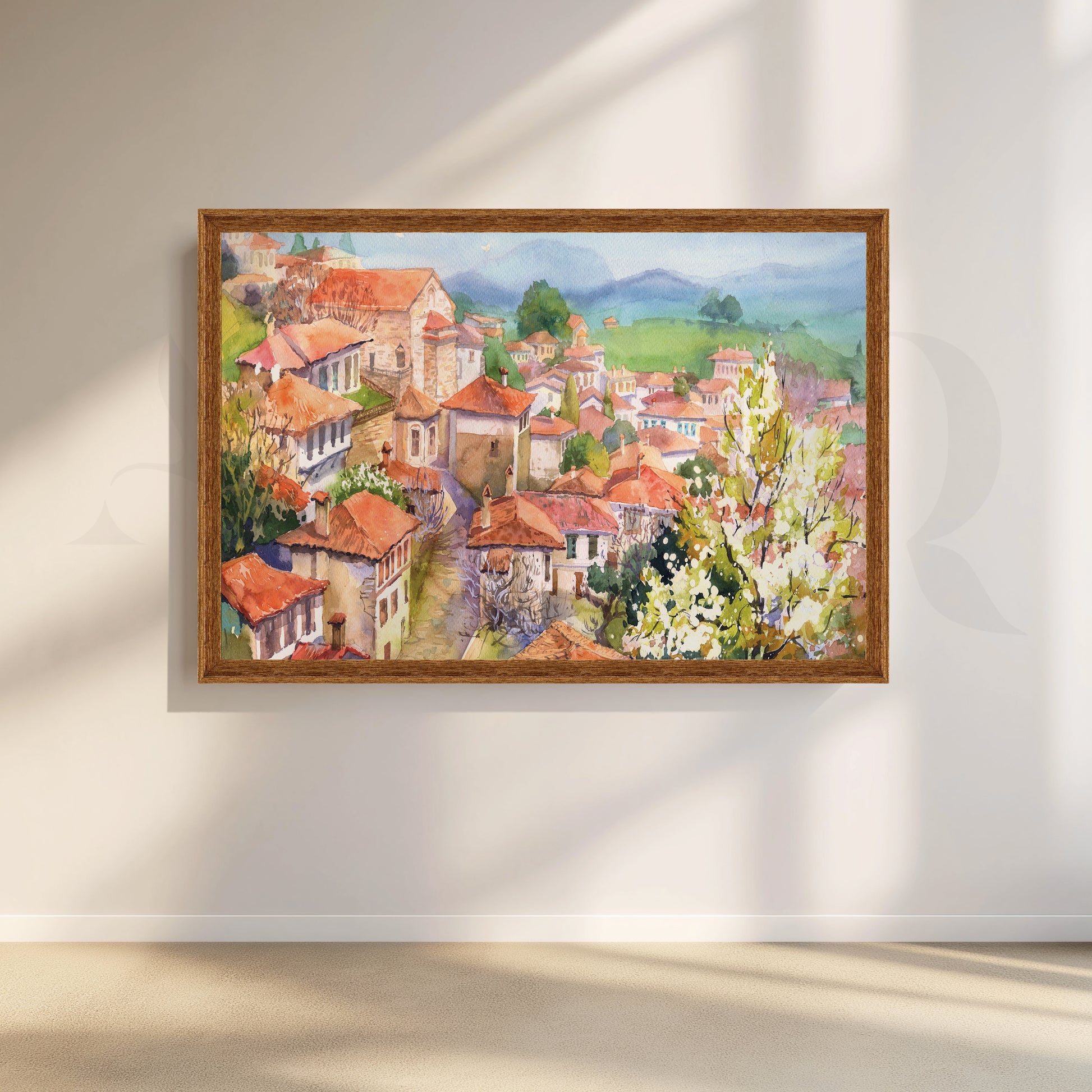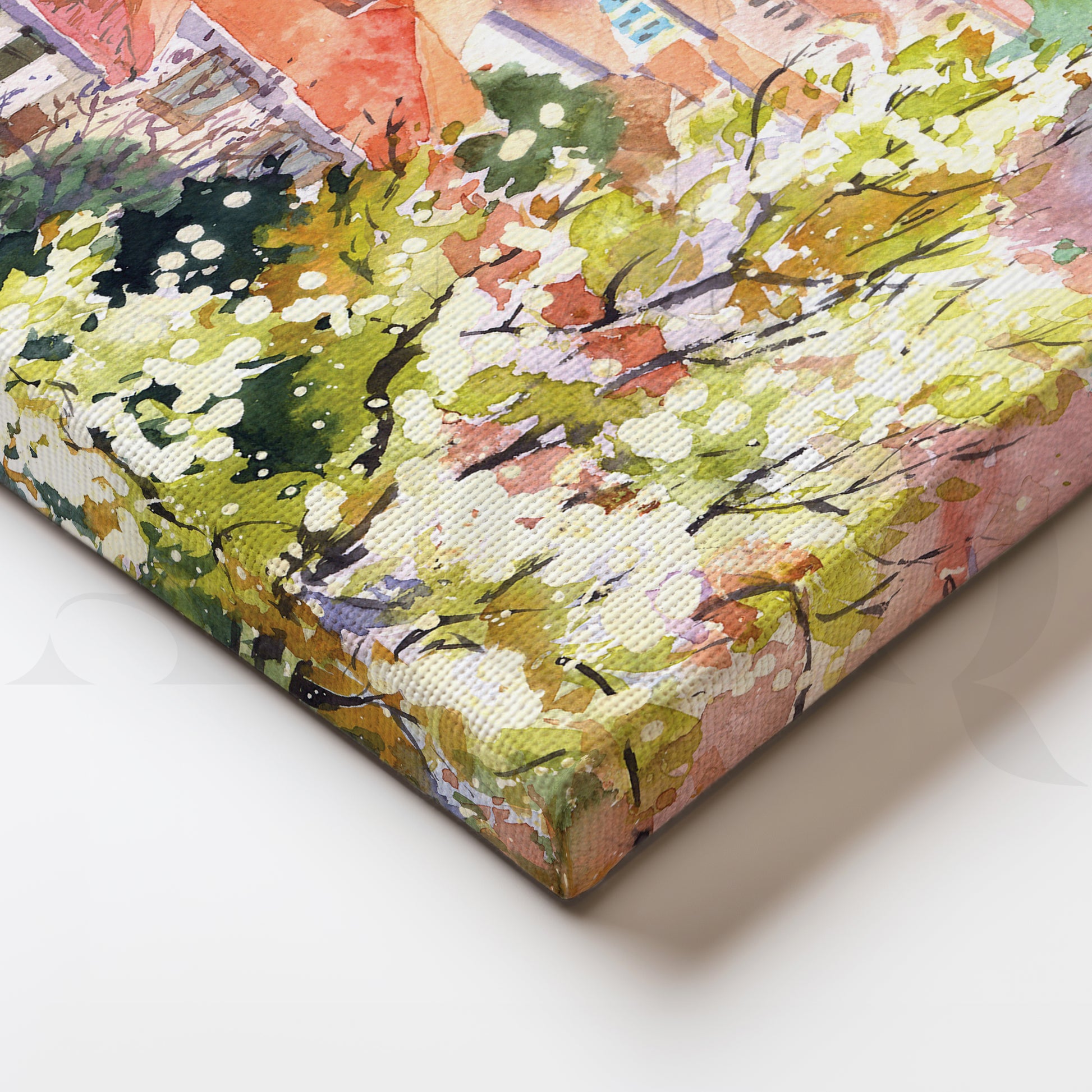 This vibrant canvas painting captures the warmth of the winter landscape. Lush green trees with red roofs form the quaint village. The design evokes a sense of peace and tranquility, perfect for adding a little sunshine to any room.