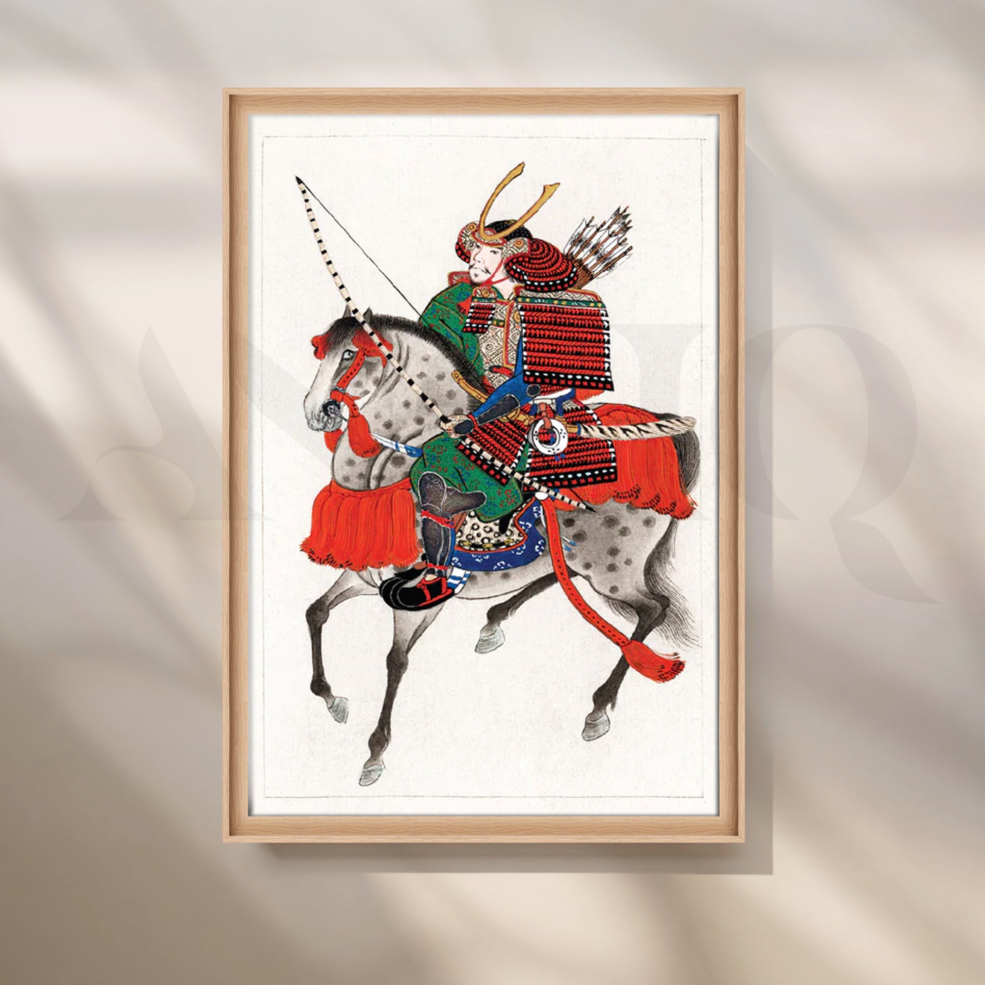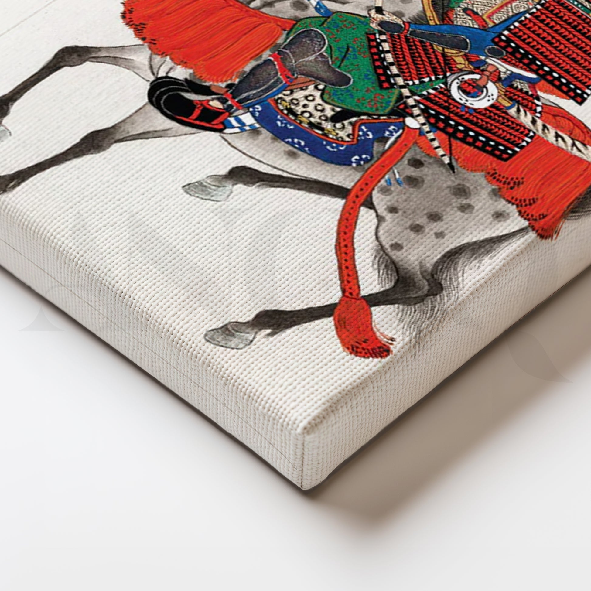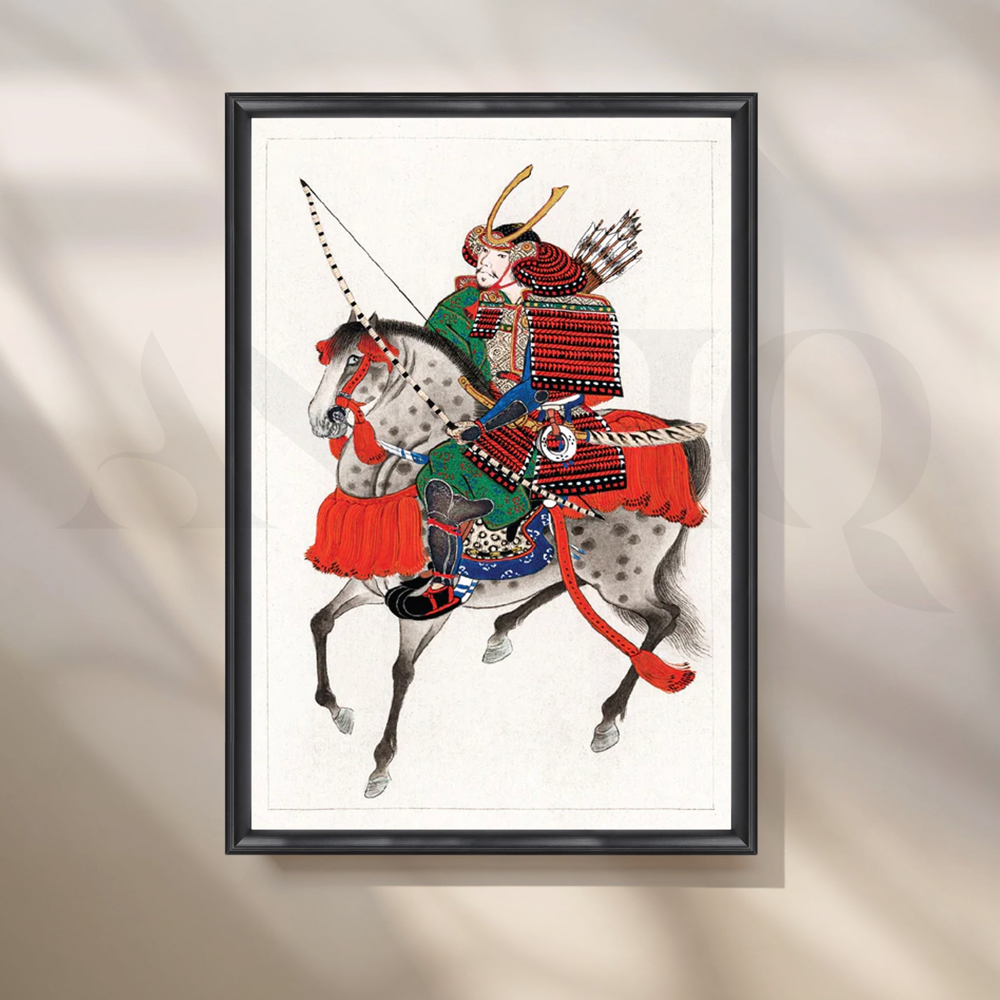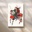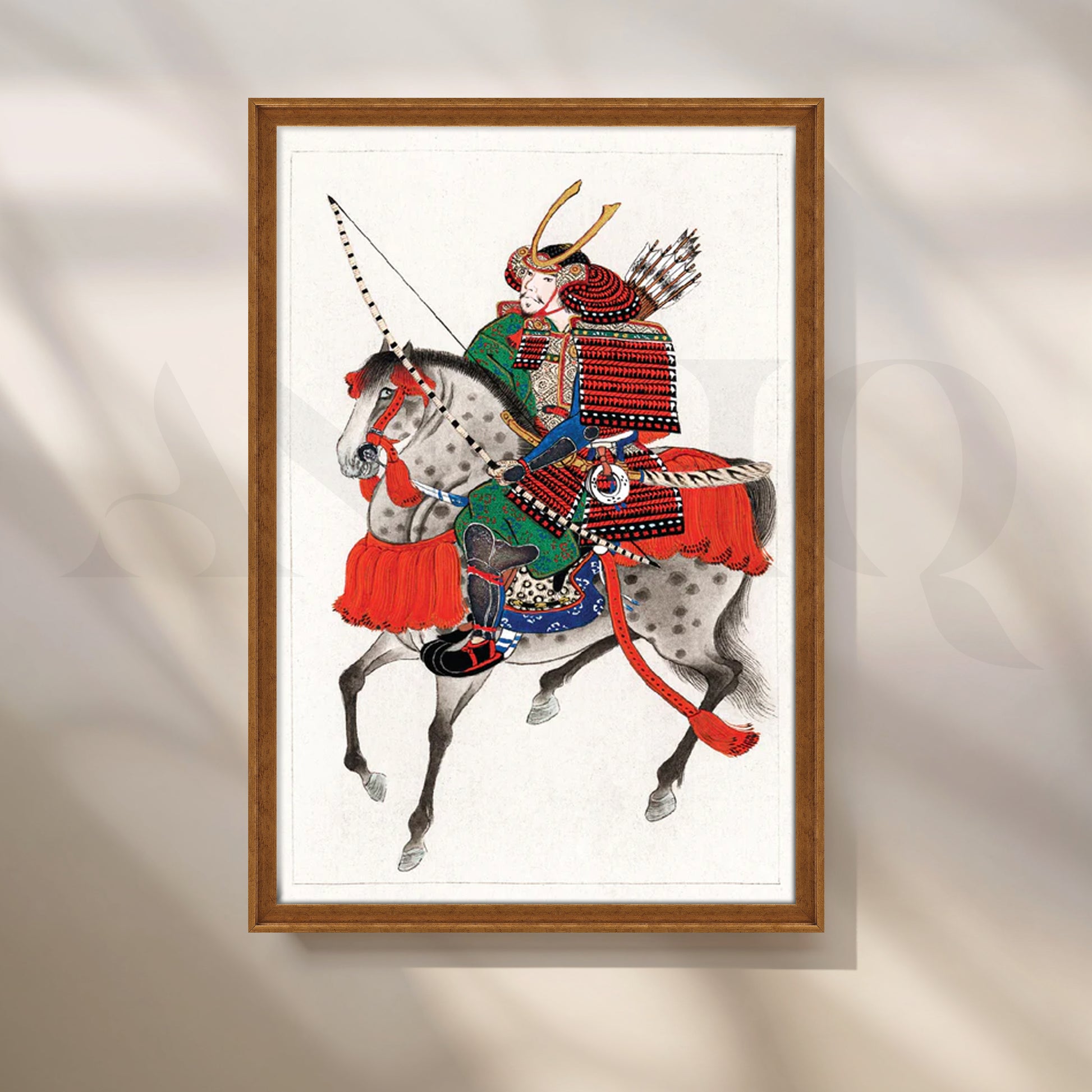 Honor timeless valor with this Japanese samurai wall art featuring a mounted warrior in vermilion armor and emerald textiles atop a dappled gray horse, rendered on an elegant ivory backdrop. The clean composition and traditional detailing evoke vintage ukiyo-e aesthetics while reading as crisp, modern wall art—perfect for a refined living room, office, study, library, or entryway. This statement canvas pairs beautifully with wood tones, neutral décor, and Japandi or Asian-inspired interiors. Ideal search terms: “Japanese samurai wall art,” “traditional Japanese canvas painting,” “Asian décor,” “warrior art print,” “large living room art,” and “office wall décor,” making it a striking focal point or elevated gallery-wall anchor.