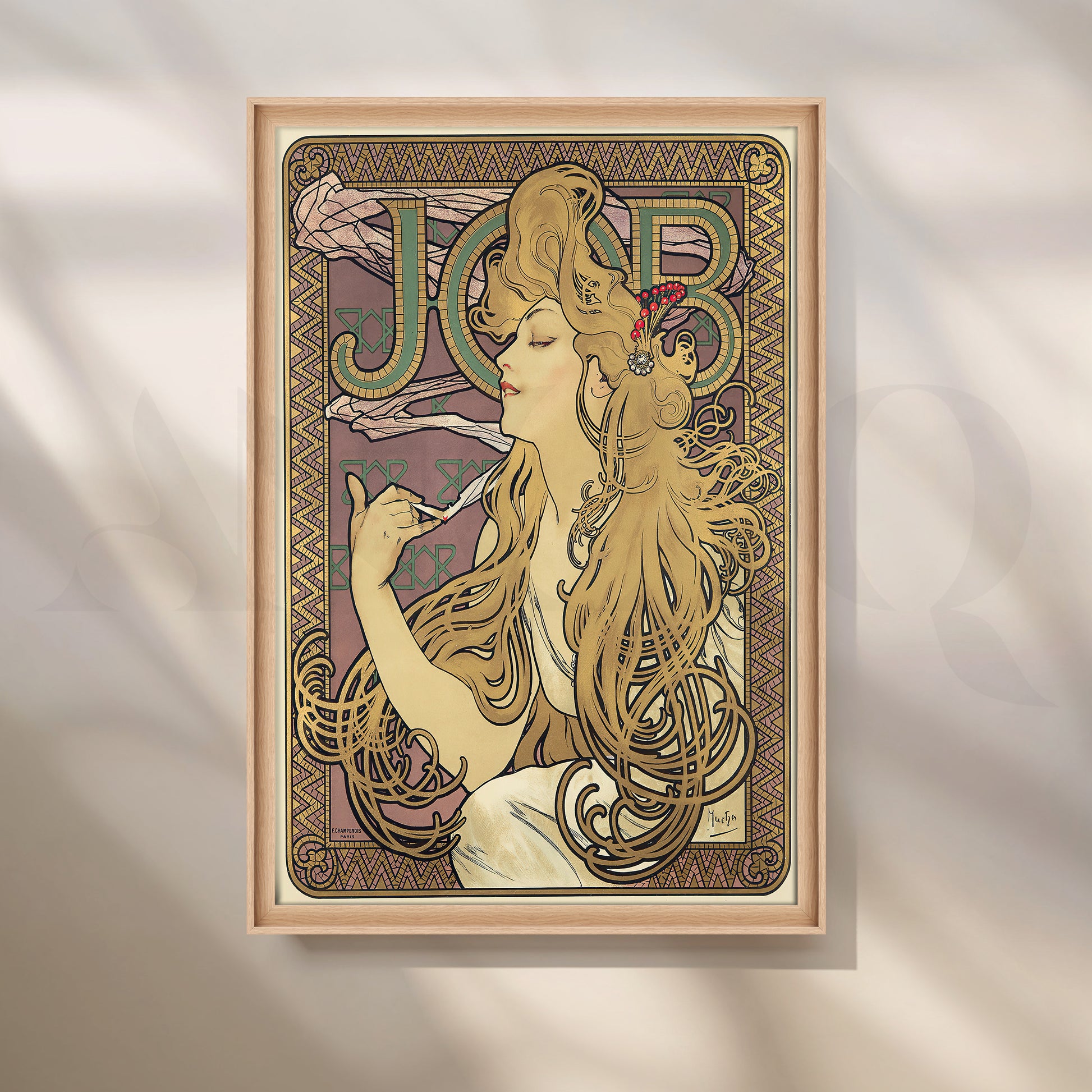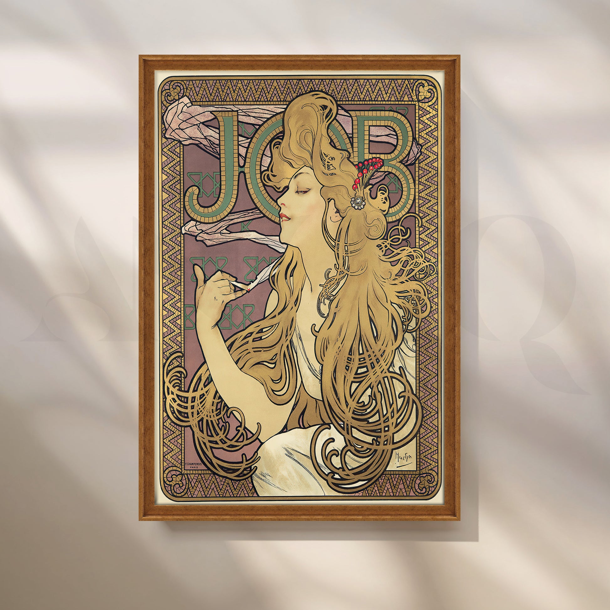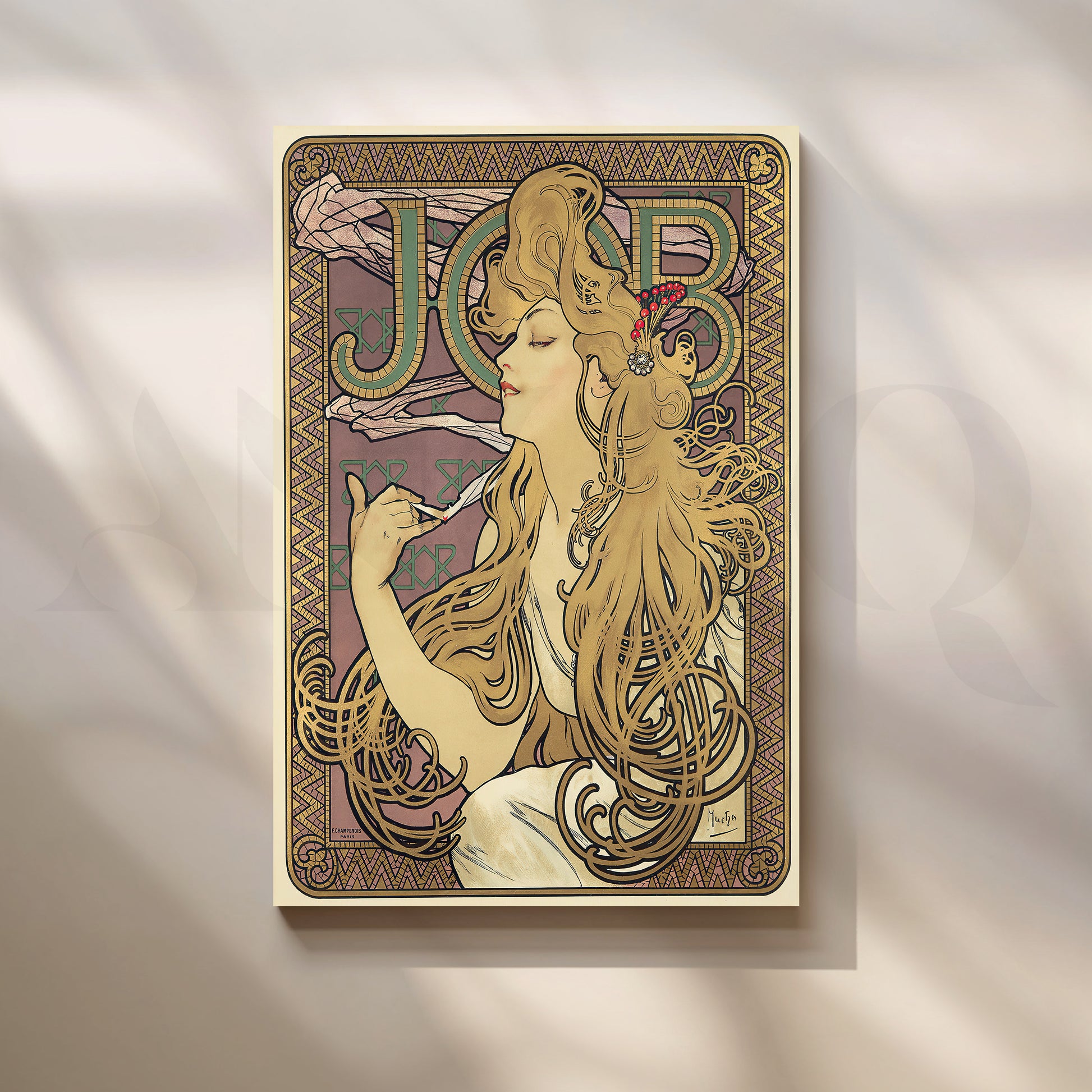 Classic Art Nouveau poster remake featuring Mucha’s flowing-hair muse, ornate borders, and the bold “JOB” typography in mauve, gold, and green. This vintage wall art adds European elegance to modern interiors. Keywords: Art Nouveau wall art, Mucha poster canvas, JOB cigarette poster, vintage French print, bohemian décor, gold and mauve artwork, vertical canvas for living room or study.