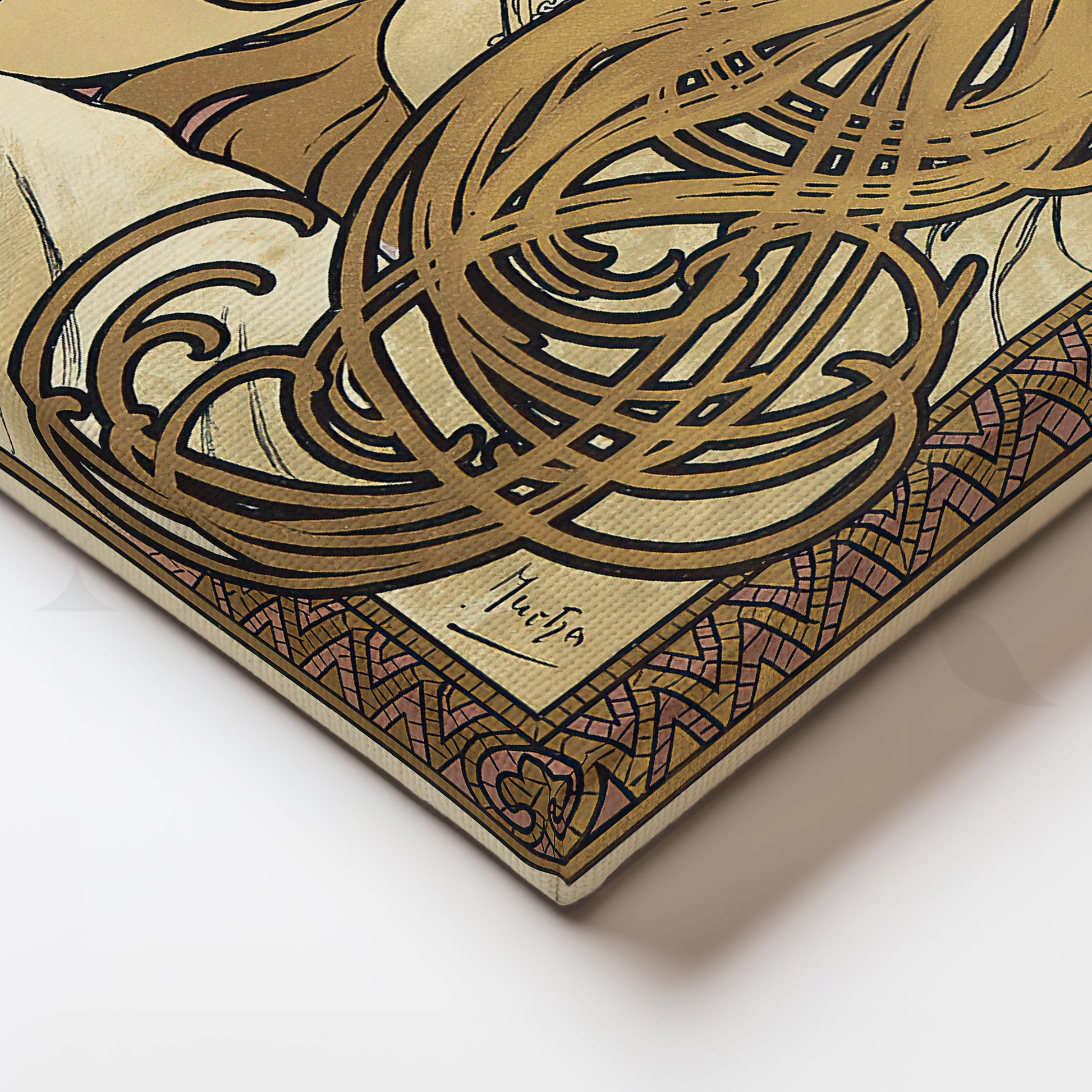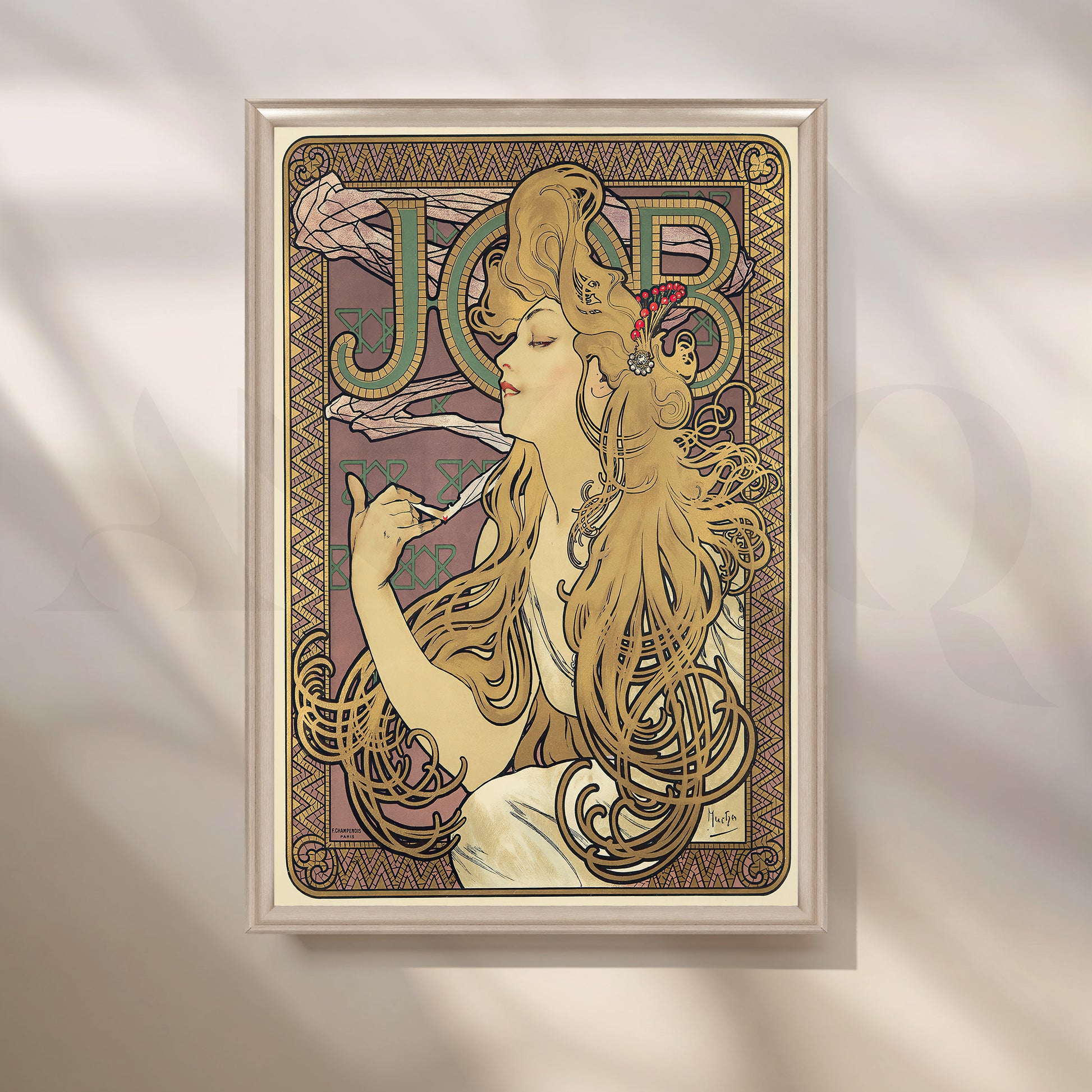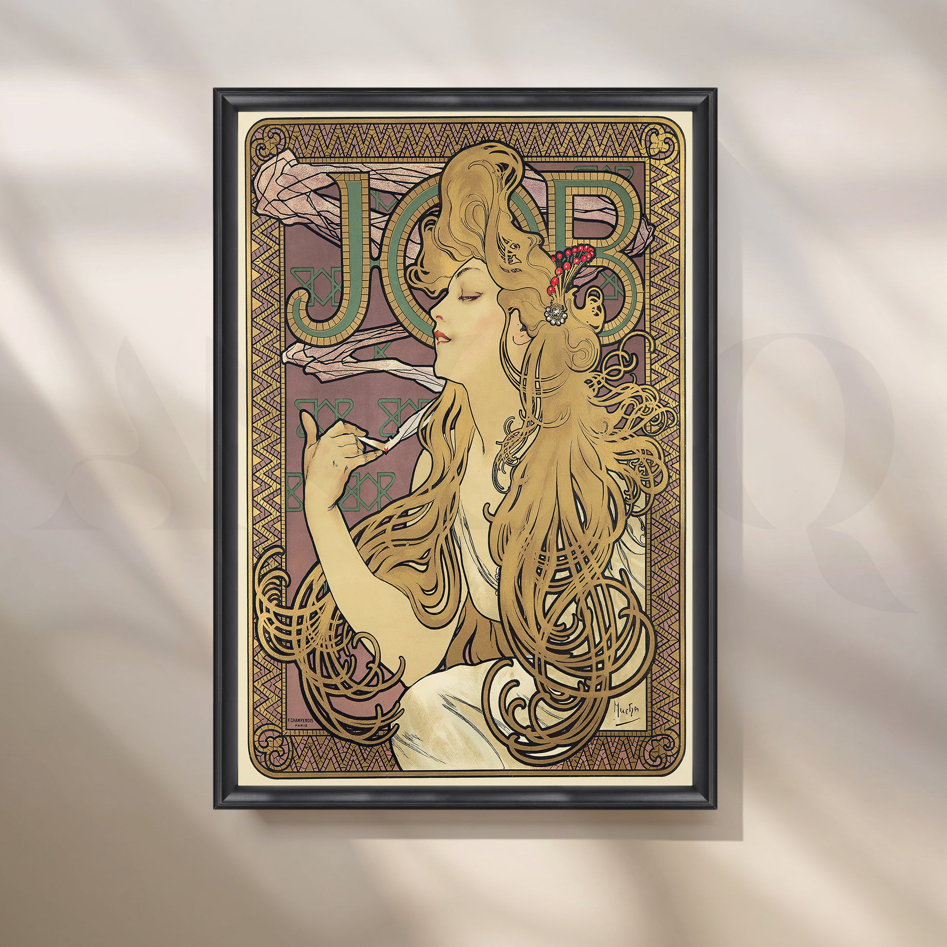 Classic Art Nouveau poster remake featuring Mucha’s flowing-hair muse, ornate borders, and the bold “JOB” typography in mauve, gold, and green. This vintage wall art adds European elegance to modern interiors. Keywords: Art Nouveau wall art, Mucha poster canvas, JOB cigarette poster, vintage French print, bohemian décor, gold and mauve artwork, vertical canvas for living room or study.