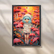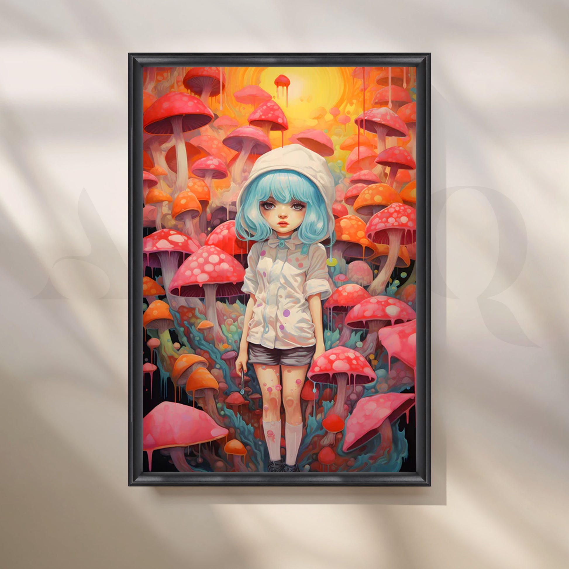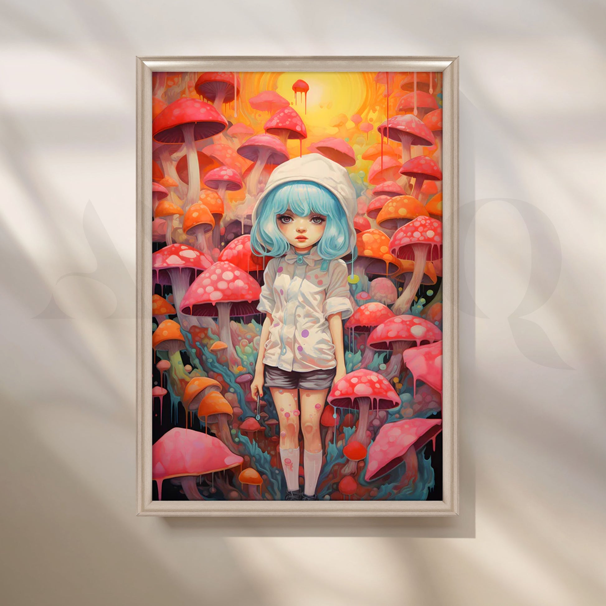A whimsical pop-surreal portrait of a blue-haired girl standing in a glowing forest of candy-pink mushrooms—rich details, dreamy colors and soft light create a magical, storybook mood. Perfect wall art for bedrooms, nurseries, and creative studios. Keywords: pop surrealism wall art, mushroom art print, kawaii girl canvas, fantasy illustration, pastel pink décor, whimsical nursery artwork, anime-inspired poster, dreamy bedroom wall art.