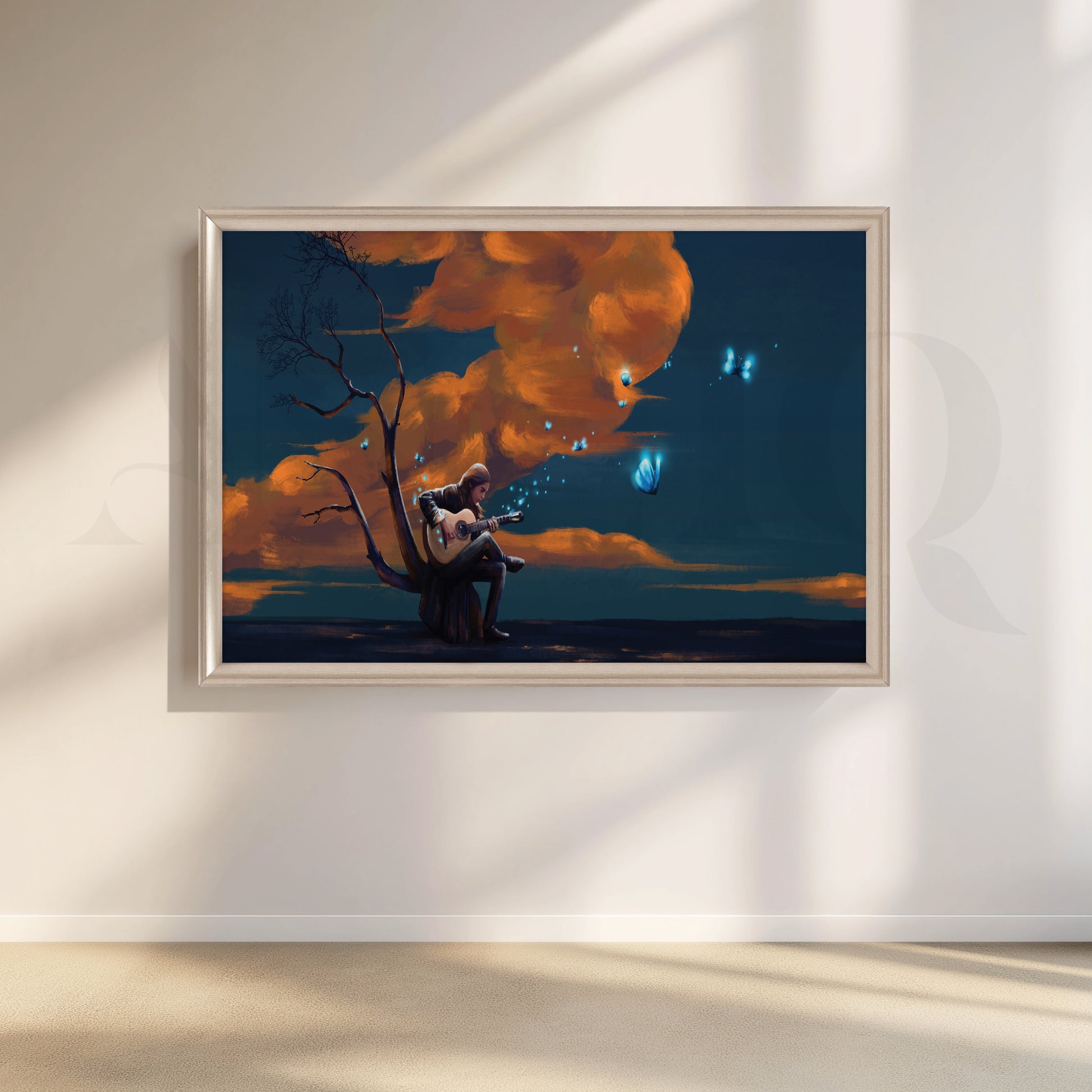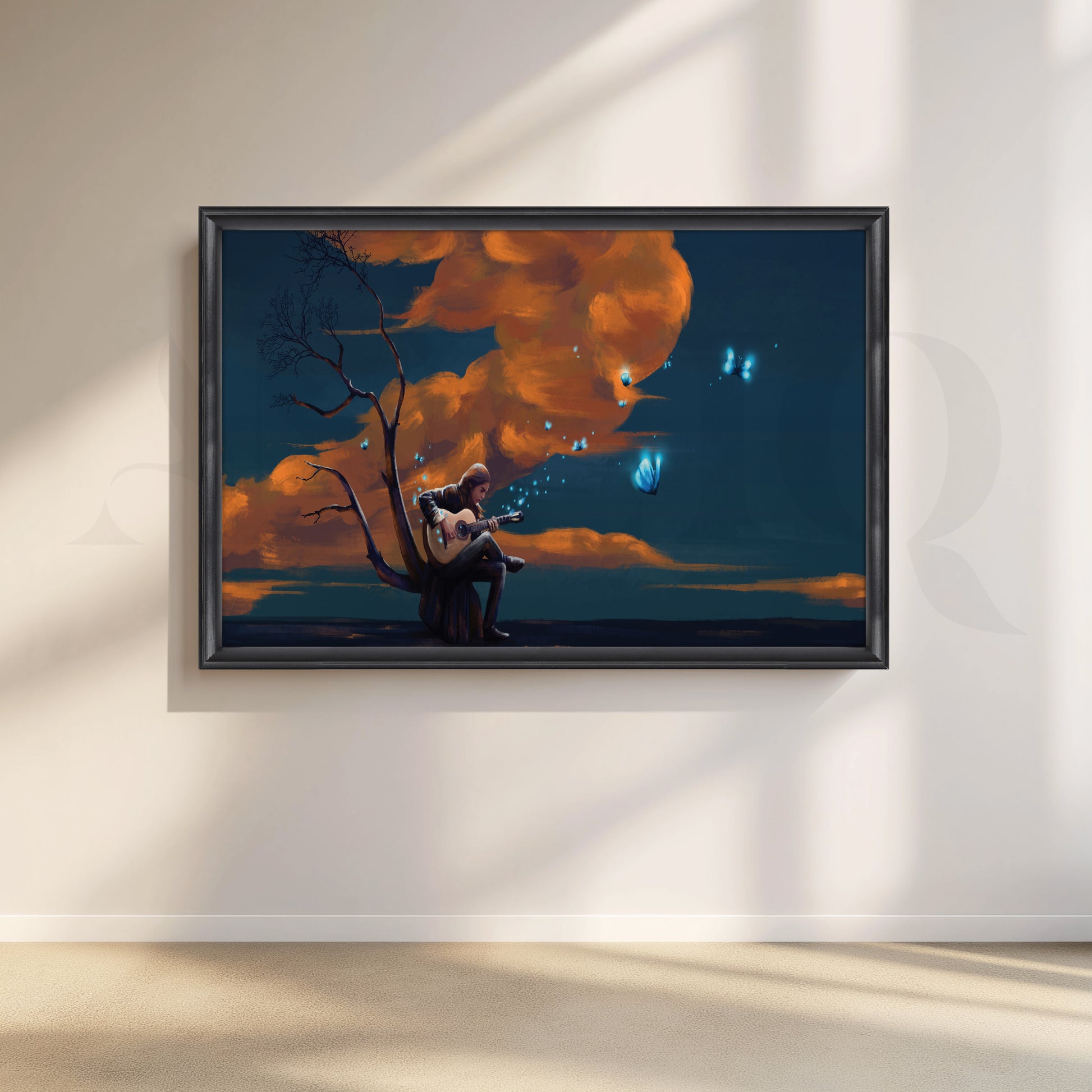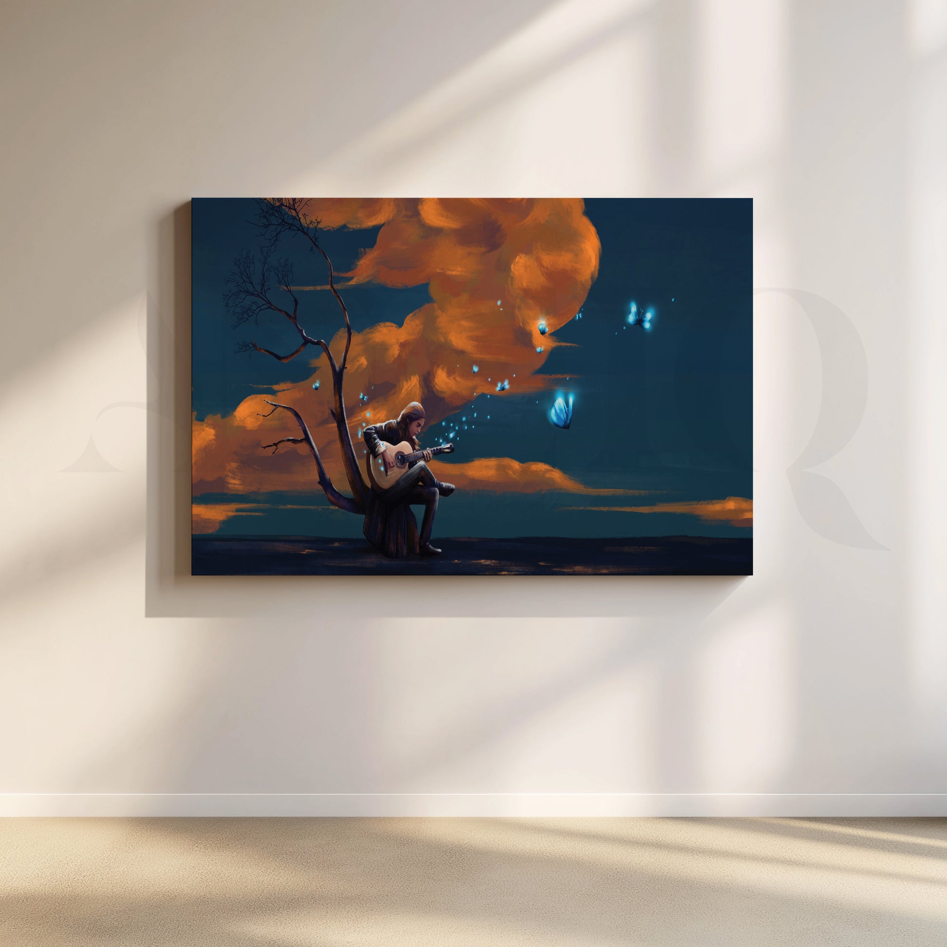 The Musical Reverie Canvas Wall Painting is a whimsical and dreamlike piece of art that features a man walking on piano keys set against a backdrop of colorful clouds. The painting is made of high-quality materials and is sure to last for years to come. The painting is framed and ready to hang, so you can enjoy the beauty of the artwork right out of the box.