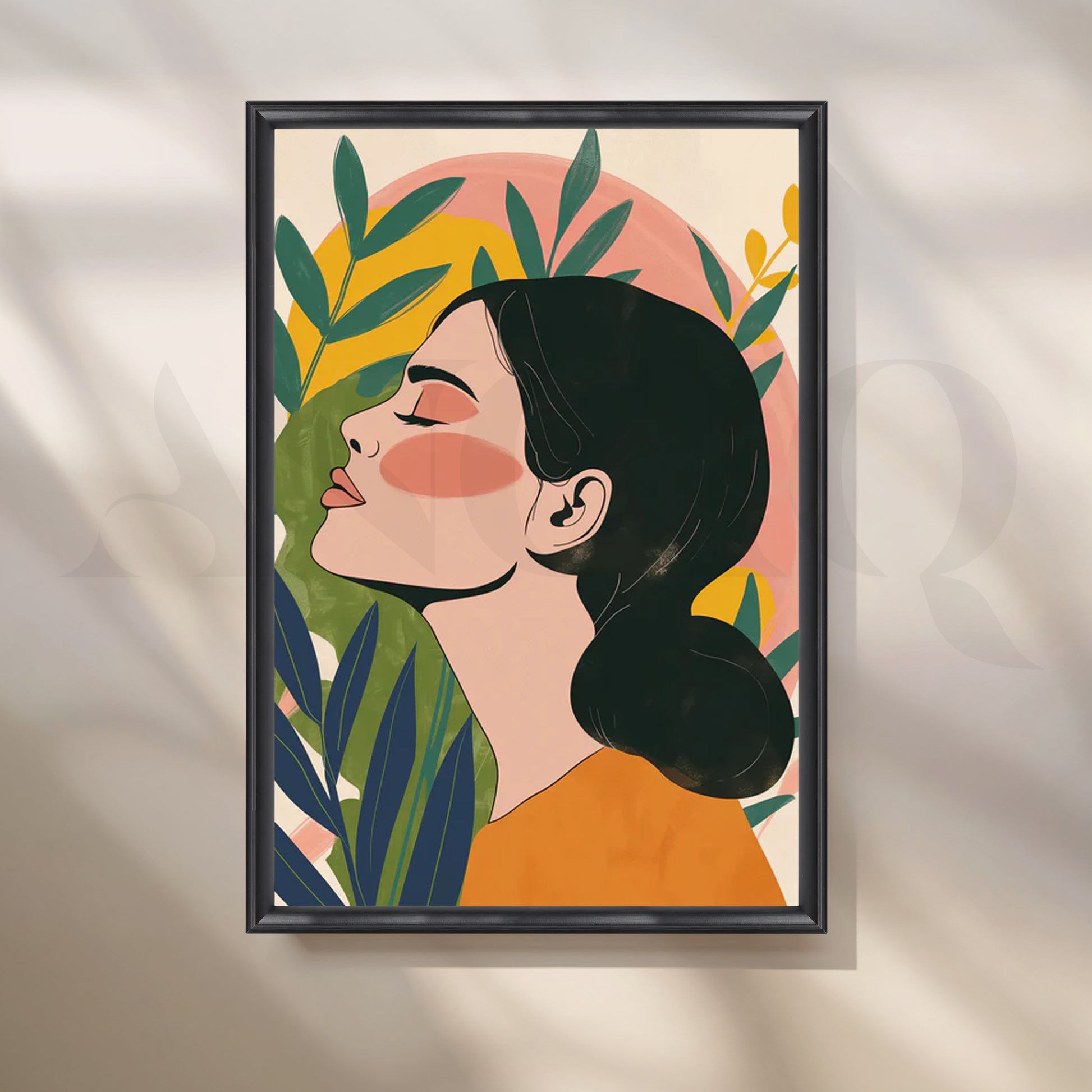 Clean lines and a refined profile meet blush, terracotta and leafy greens in this minimalist botanical canvas. Its mid-century inspired shapes and serene palette add polished warmth to a home office, study nook or creative studio—ideal modern wall art for a focused, stylish workspace. Works beautifully as abstract canvas painting, botanical wall décor, or large living room art.