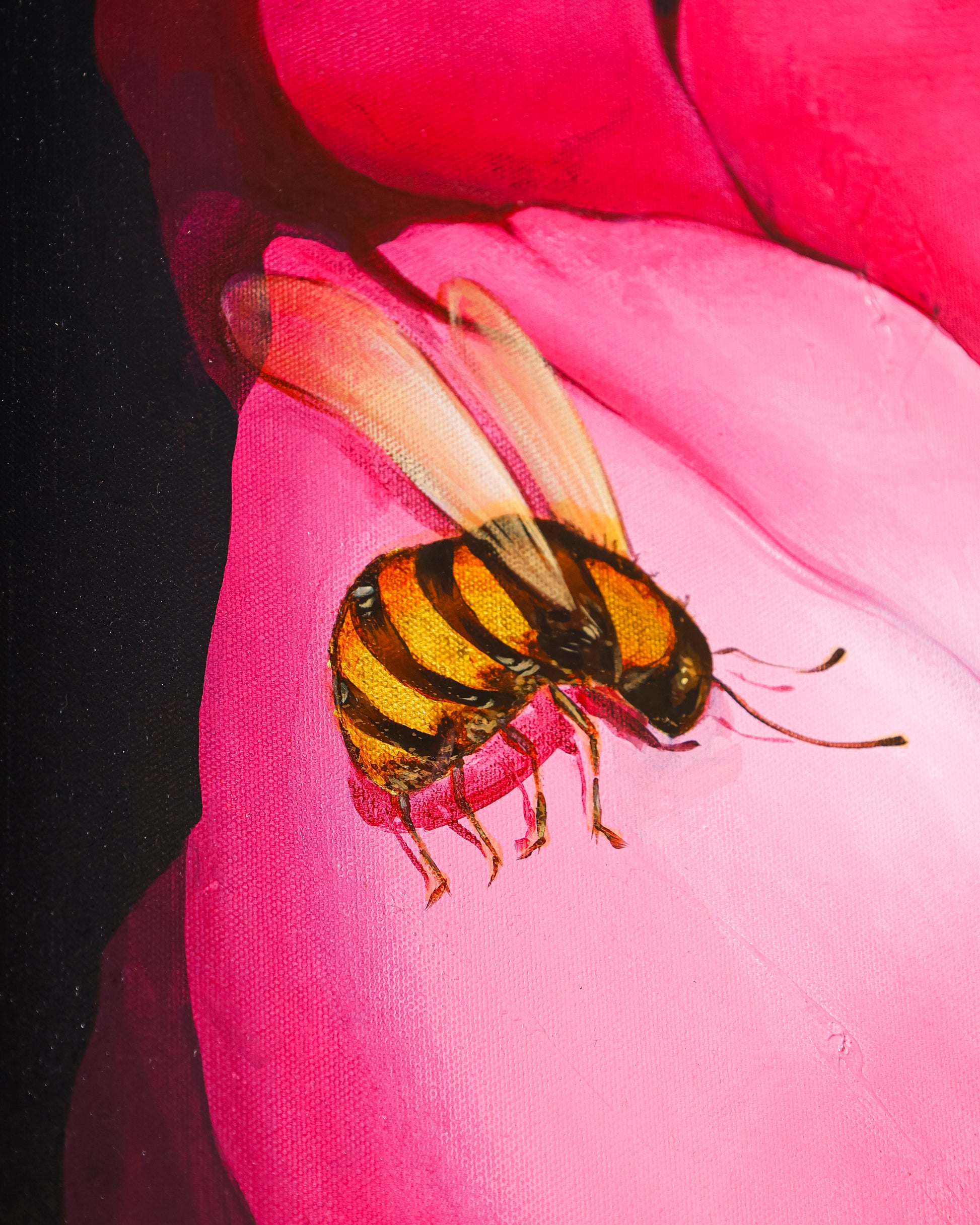 Delicate bees hover and rest within the bloom, adding narrative and life to the artwork. Their presence symbolizes harmony, renewal, and the quiet interconnectedness of nature. Rachna Aggrawal’s attention to detail is evident in the organic flow of the petals and the gentle contrast between softness and structure. The painting feels intimate yet bold, inviting the viewer to pause and observe the quiet drama within a single moment of nature.