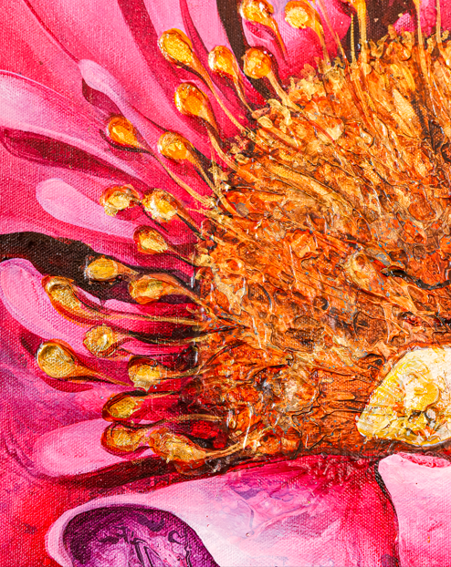 The artist’s use of color is confident and emotive—vibrant pinks balanced with earthy undertones and deep shadows. Rather than idealizing the flower, the artwork embraces its natural complexity, giving it character and soul.