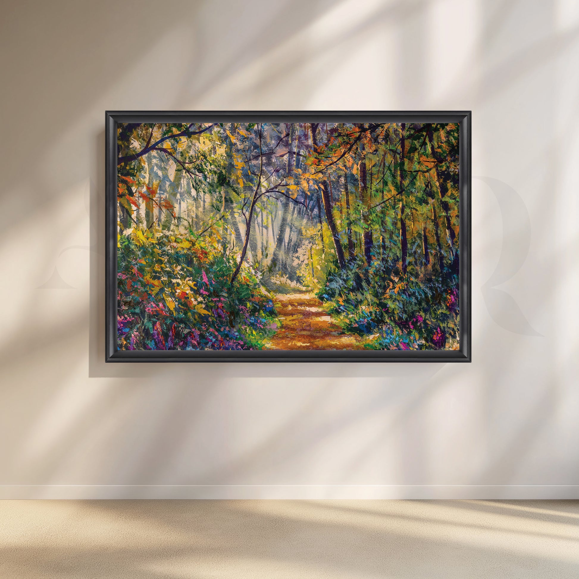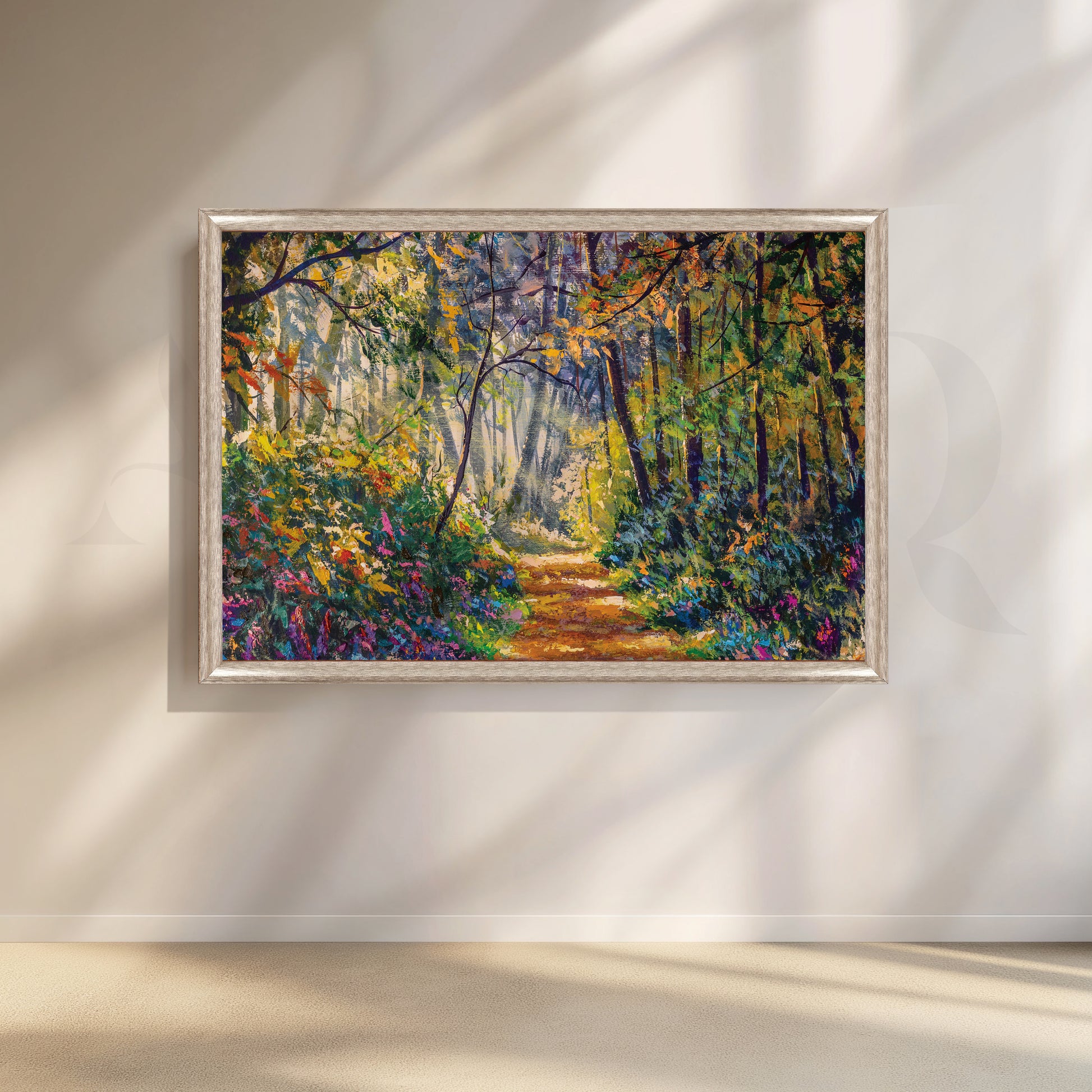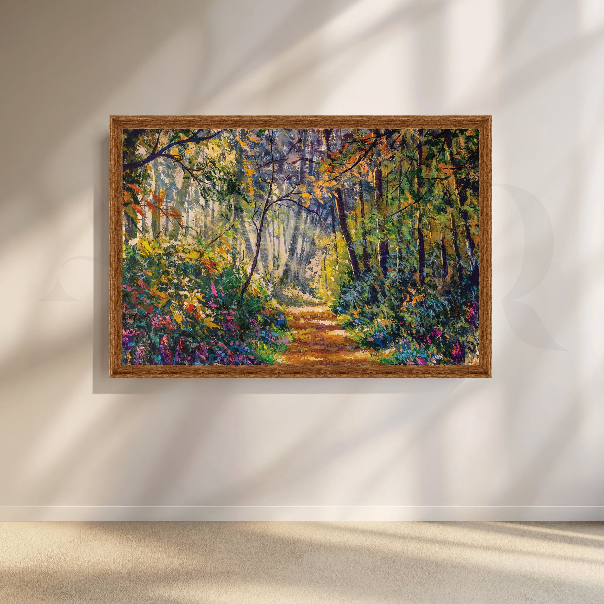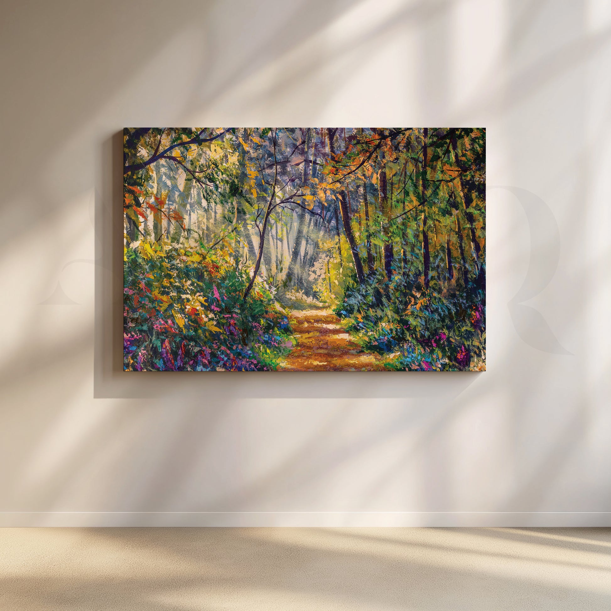 Escape into a vibrant world with this captivating painting. Sunlight spills through a path winding amidst a kaleidoscope of wildflowers. Perfect for nature lovers, this artwork brings the joy of a summer meadow into your home.