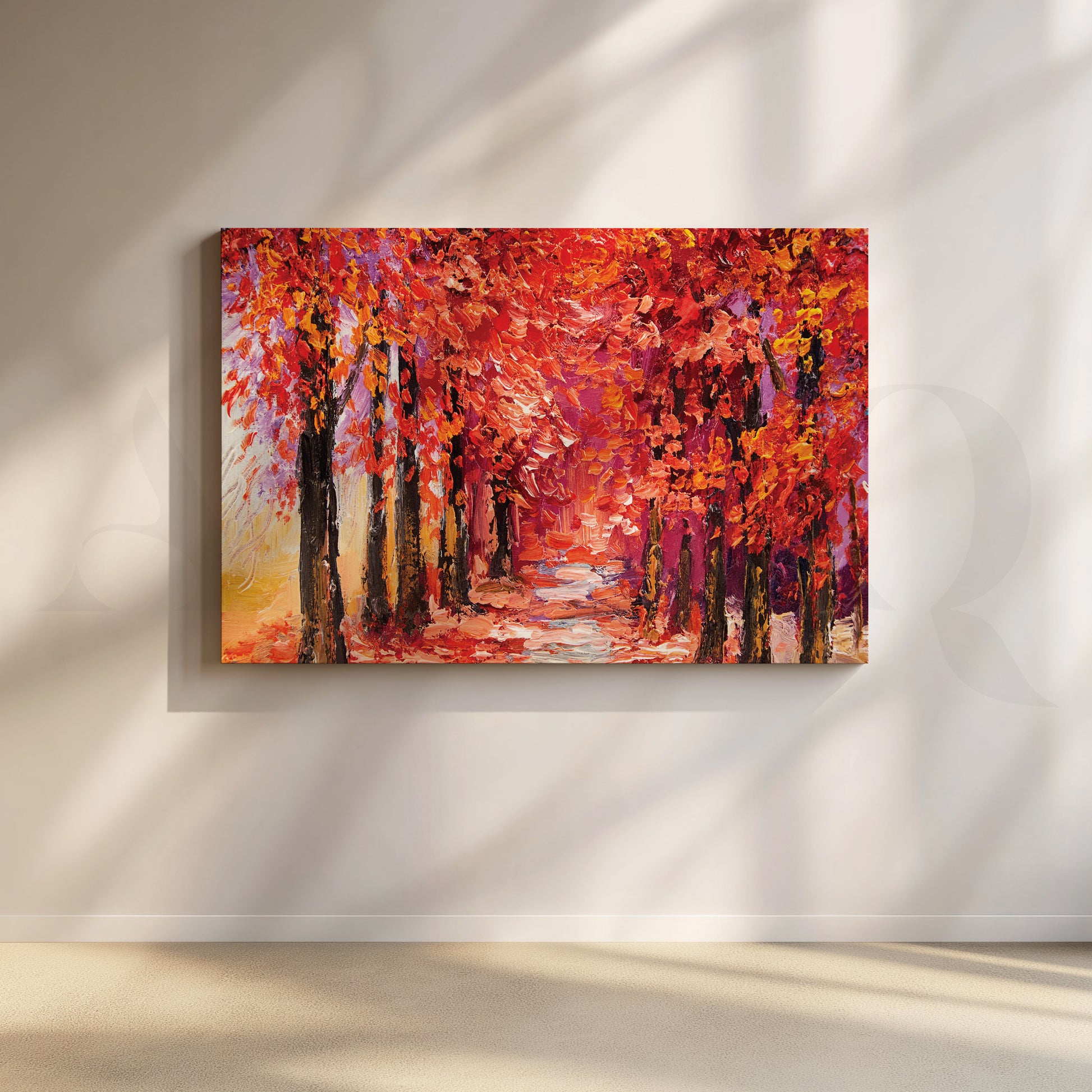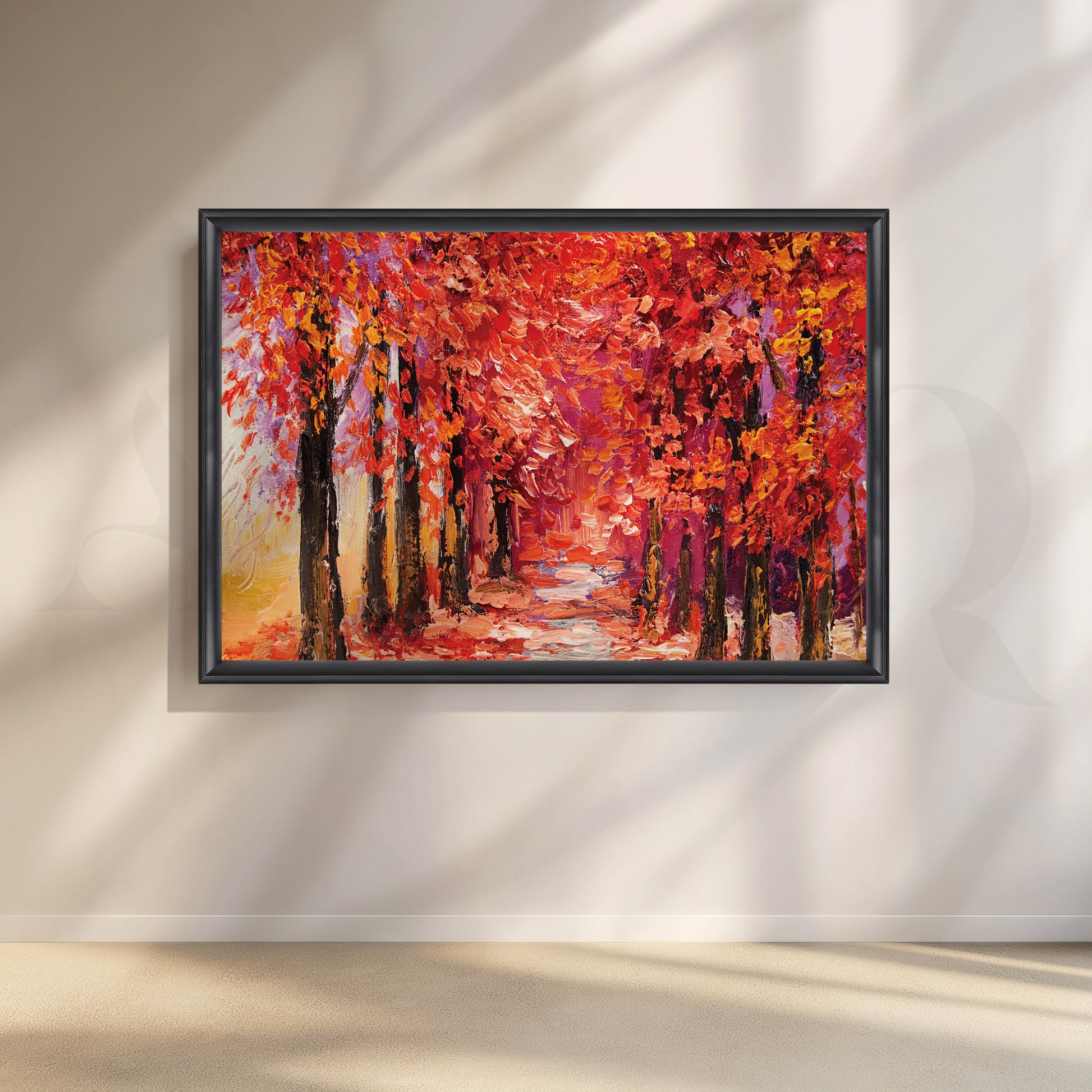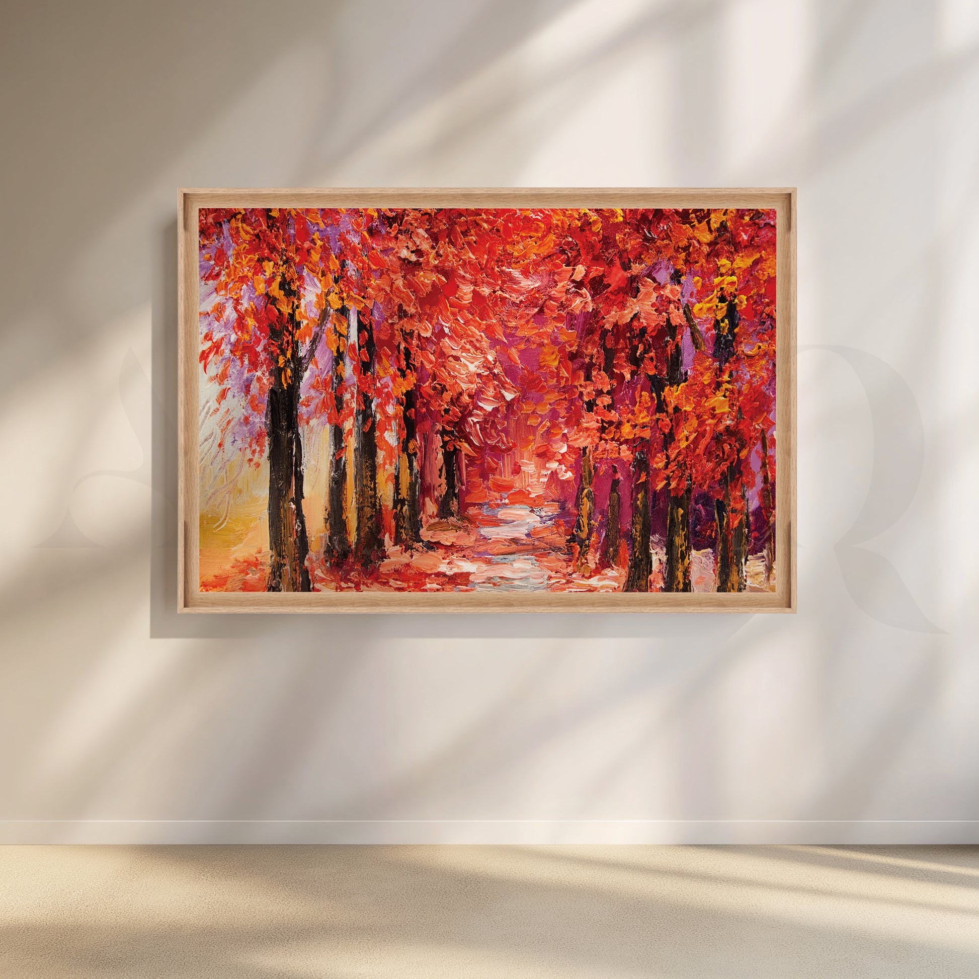 Bring the vibrant colors of autumn into your home with this stunning framed painting. Lush redwoods with autumn leaves ablaze make for a beautiful focal point. This masterpiece is a beautiful way to add some color and elegance to any room.