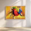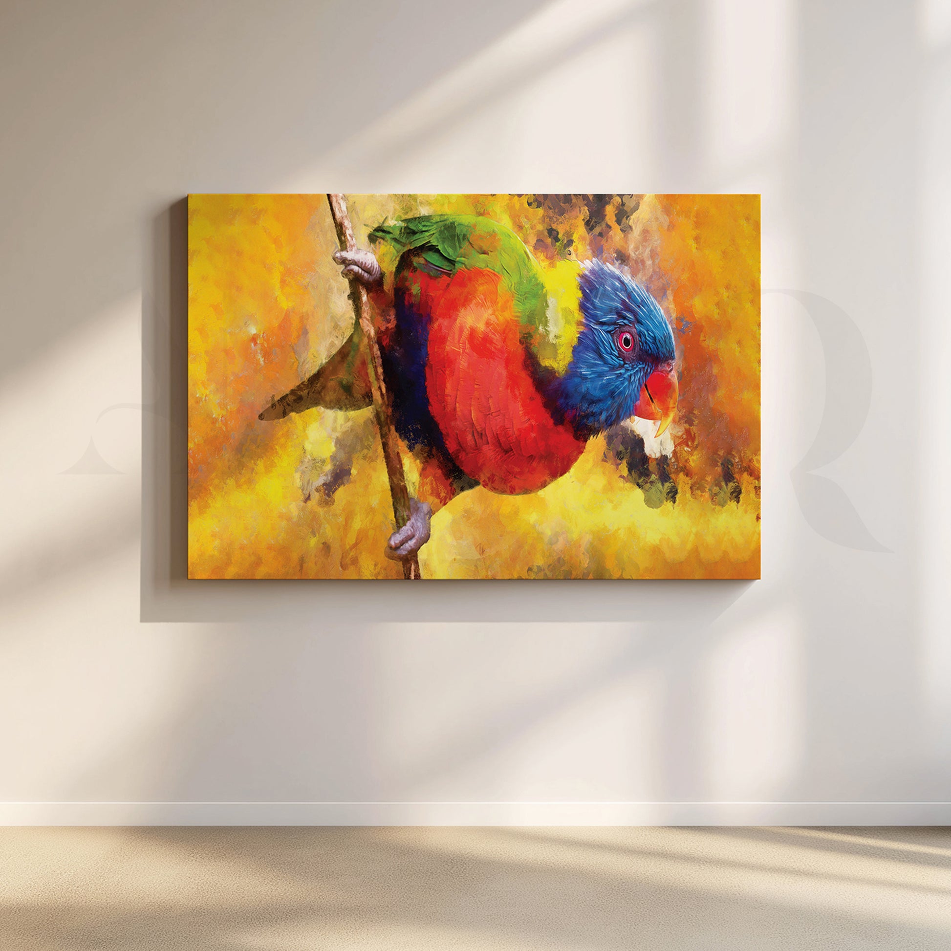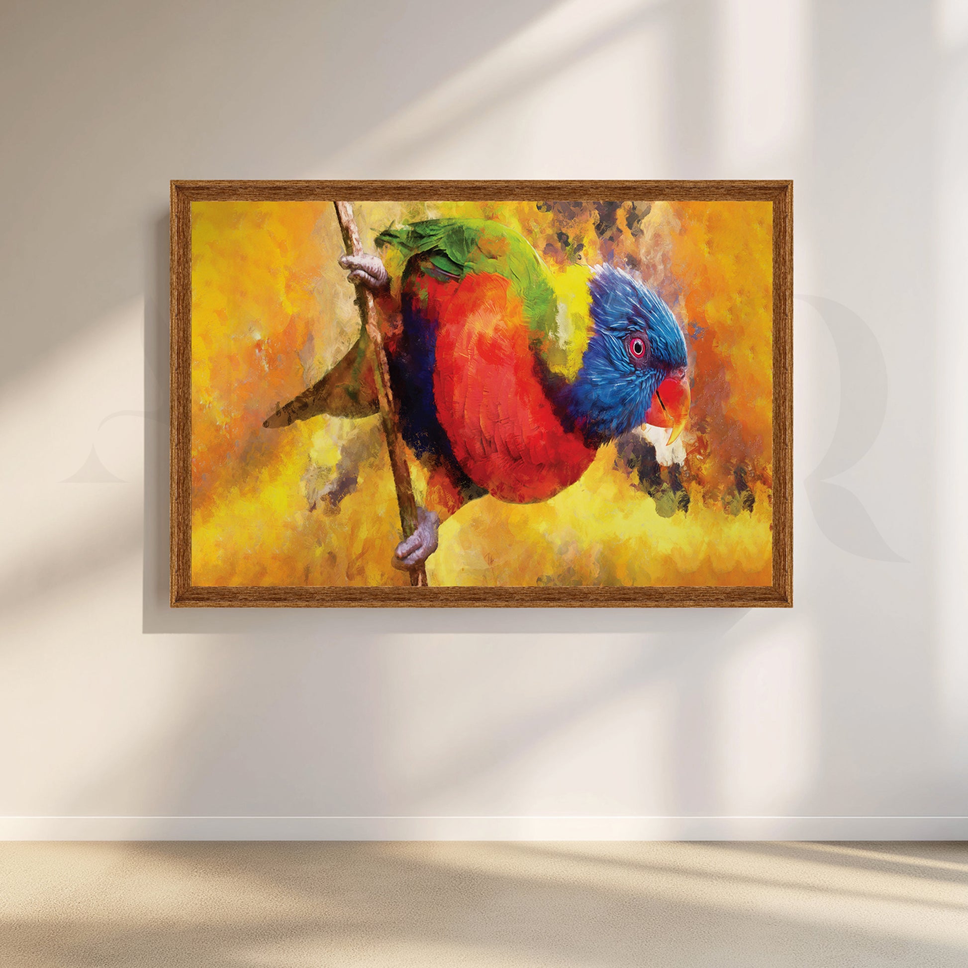 Bring a burst of color to your walls with this captivating painting! A vibrantly plumaged parrot perches on a branch, its feathers a dazzling display of rainbow hues. This unique artwork is sure to be a conversation starter and a delightful addition to any room.