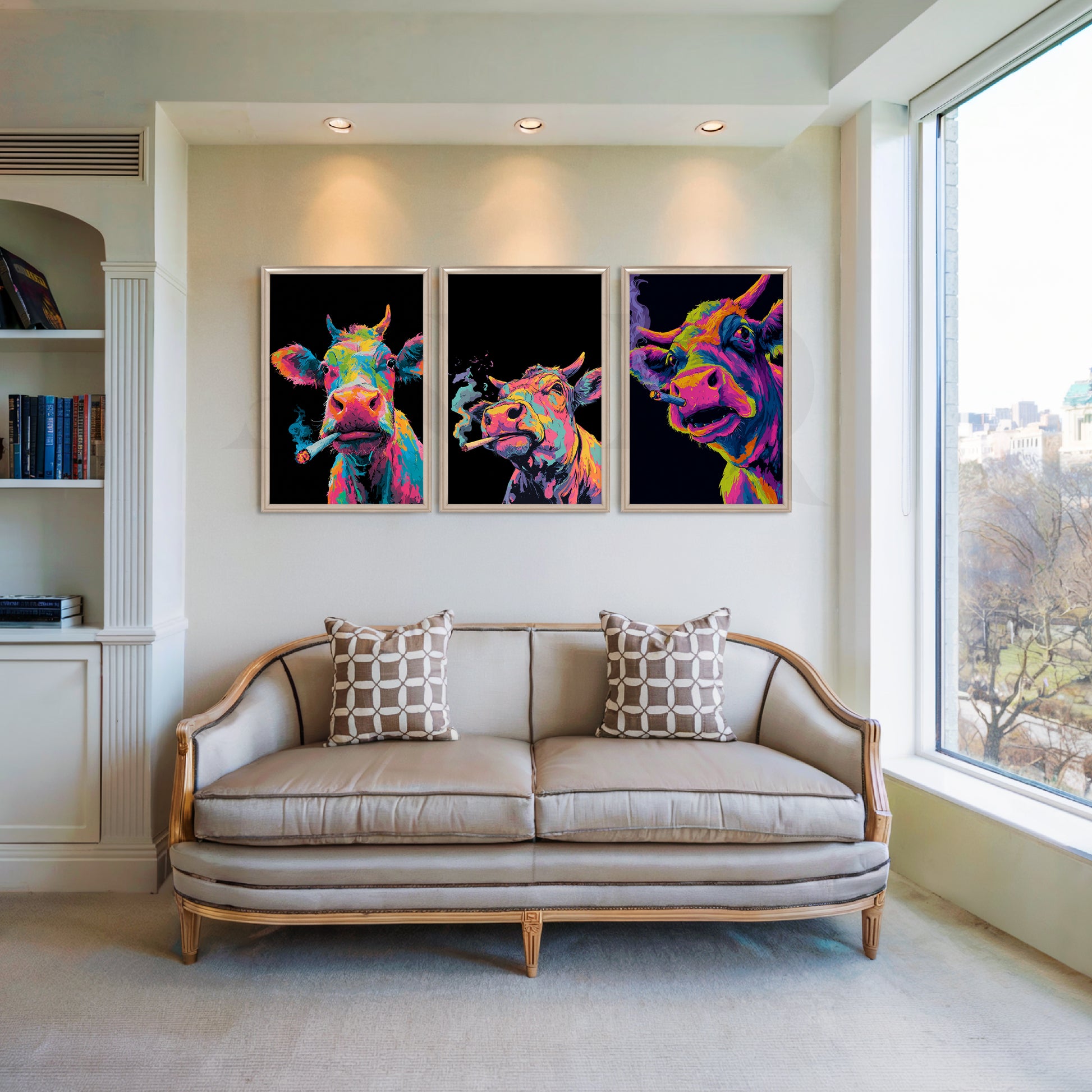 This bold neon cow-themed gallery wall adds humour, attitude, and vibrant pop-art flair to any room. Perfect for living rooms, cafés, lounges, bars, and creative studios, the expressive characters and deep black backdrop create a striking focal point. A fun, quirky addition for anyone who loves colourful, modern, conversation-starting wall décor.