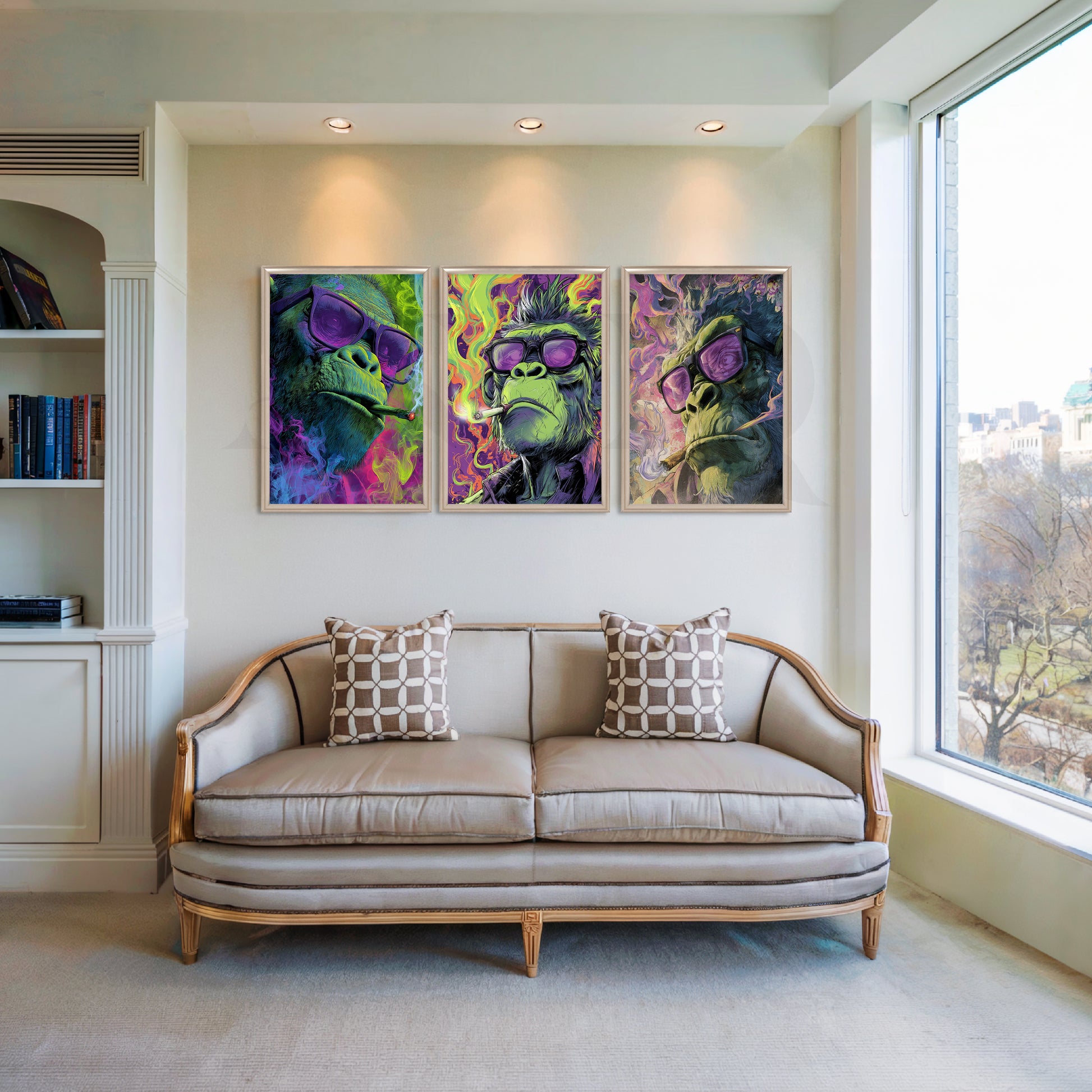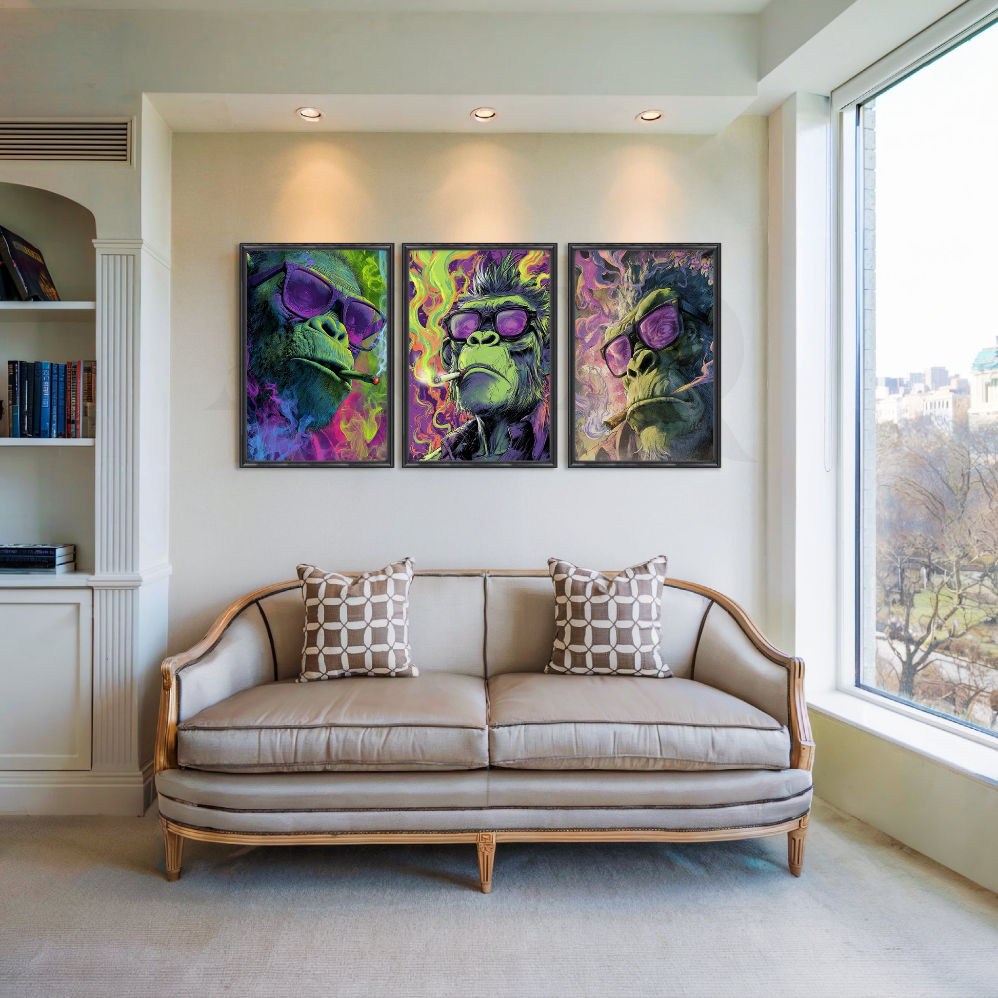 This neon gorilla gallery wall brings bold, rebellious energy to your space. Vivid colours, sunglasses and smoky, psychedelic backgrounds create a dramatic focal point for living rooms, gaming rooms, man caves, music studios, cafés or bars. A perfect pick if you love quirky pop art, street-style graphics and statement-making modern wall décor.