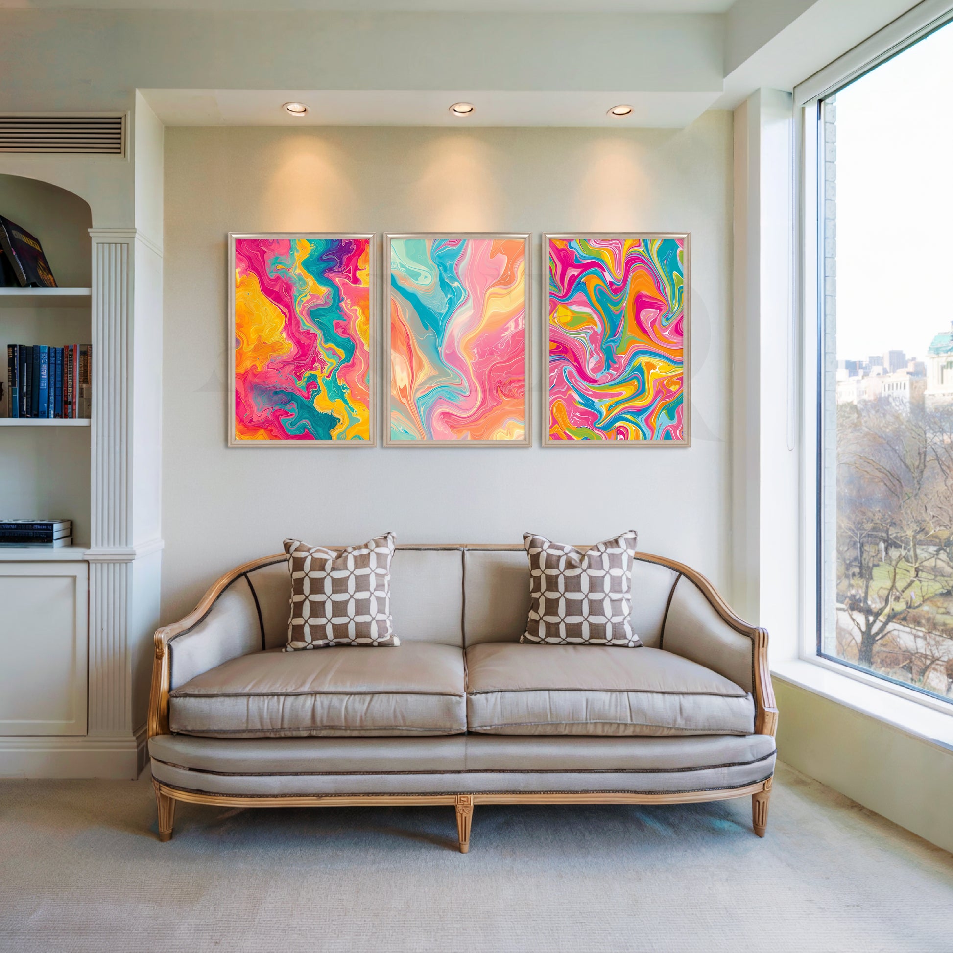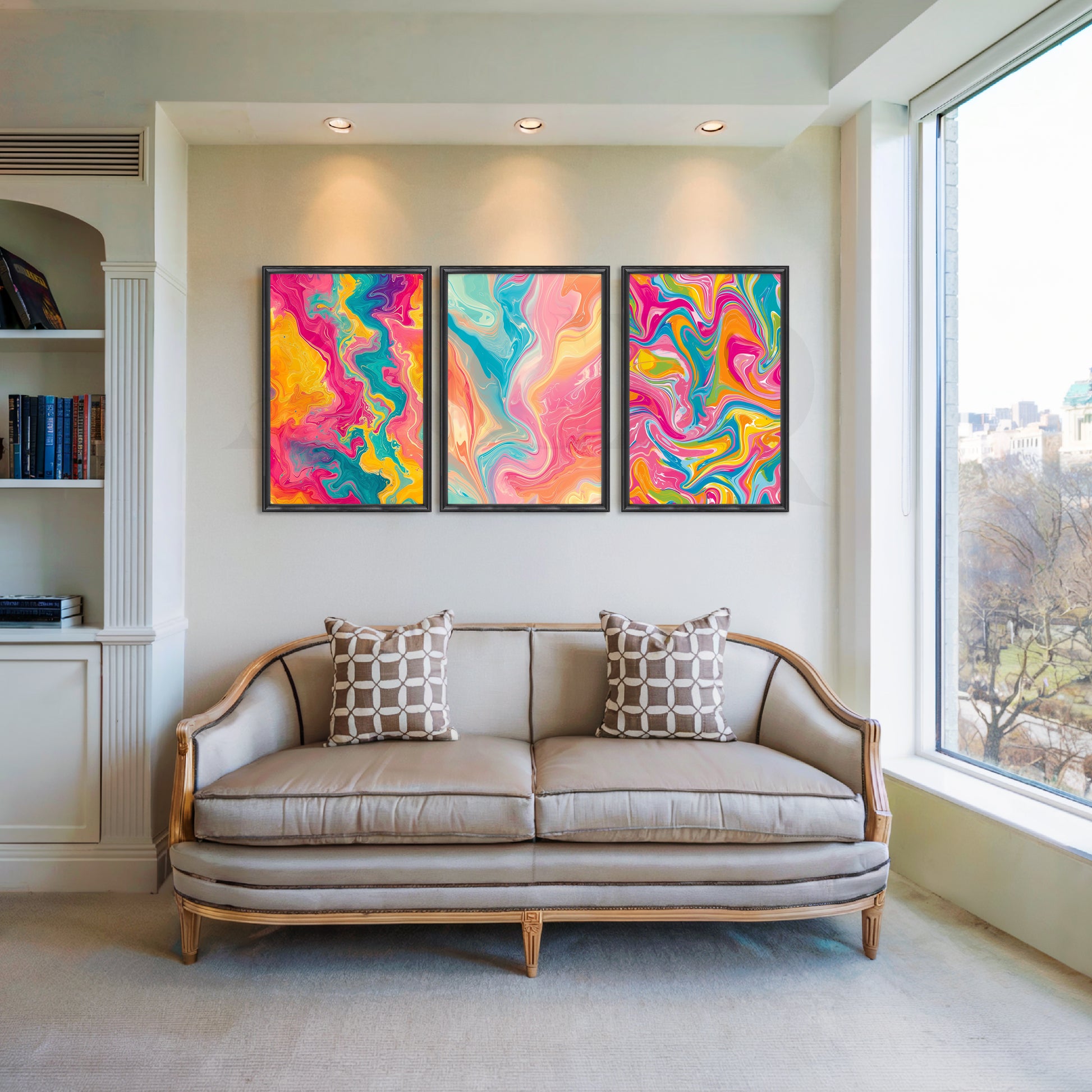 Anciq ‘Neon Swirl Energy’ Gallery Wall explodes with fluid marble-style patterns in bright candy colours, instantly lifting the mood of any room. Perfect for living rooms, gaming rooms, creative studios, or teen bedrooms, this 3-piece abstract set is made for bold, modern interiors. Ideal for colourful abstract wall art and statement gallery wall décor.