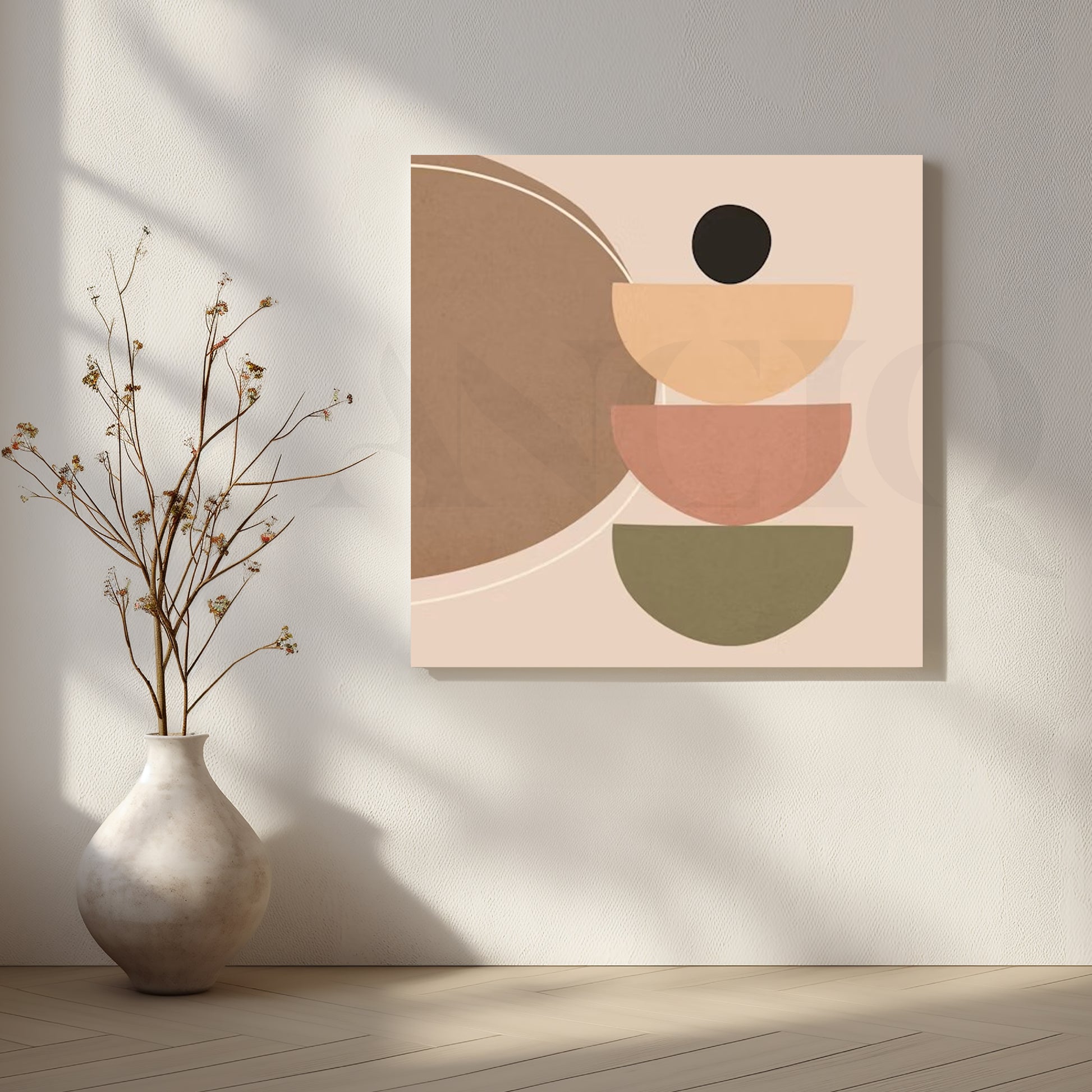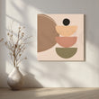 Soft peach, clay and olive semi-circles stack playfully against a warm beige background, creating a soothing minimal abstract canvas. The gentle earthy palette works beautifully in bedrooms, dining areas and serene living spaces. Ideal for shoppers looking for neutral wall art, boho abstract canvas and Scandinavian inspired decor.