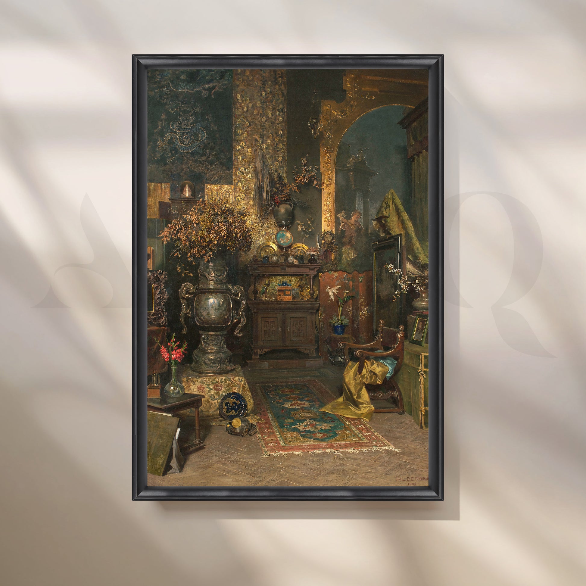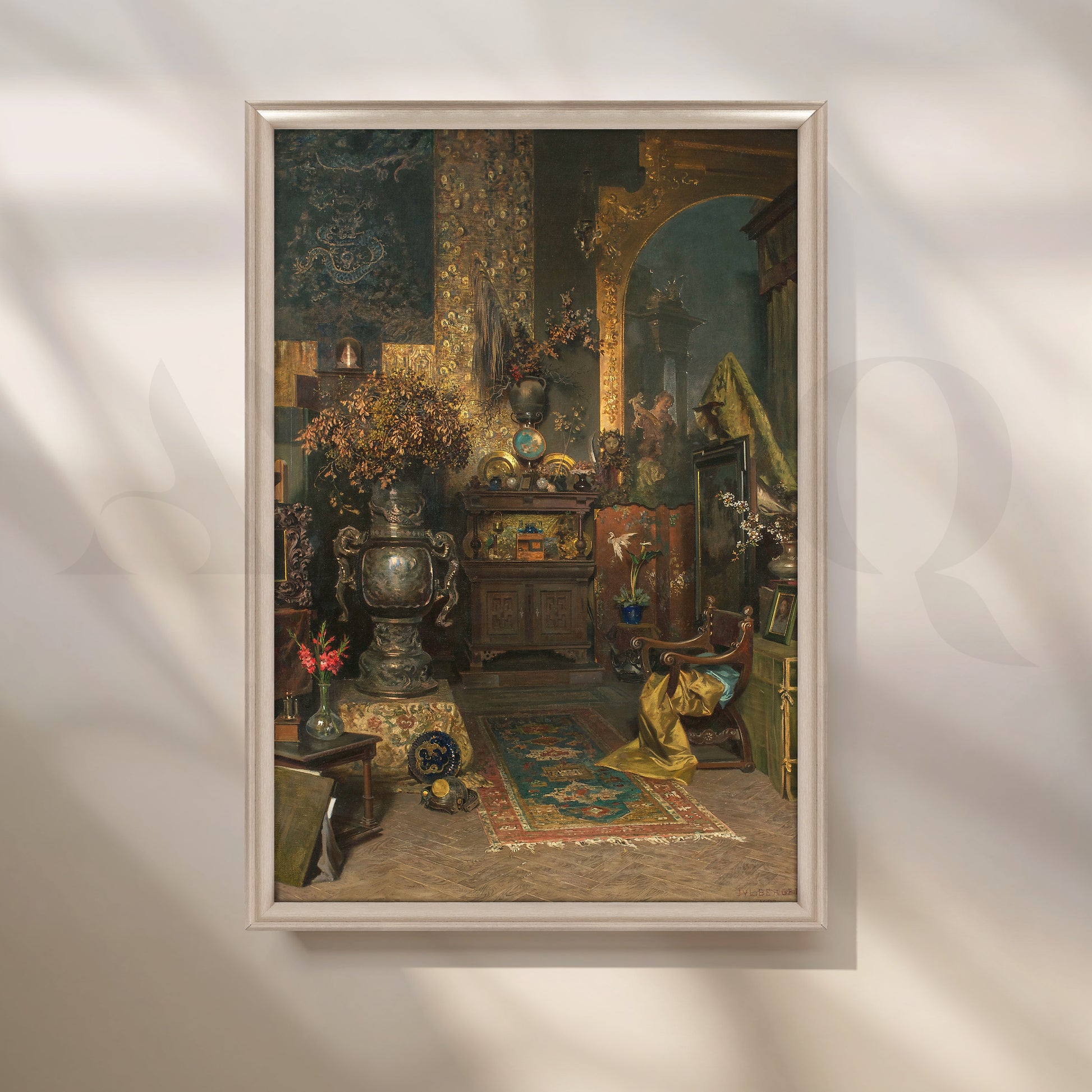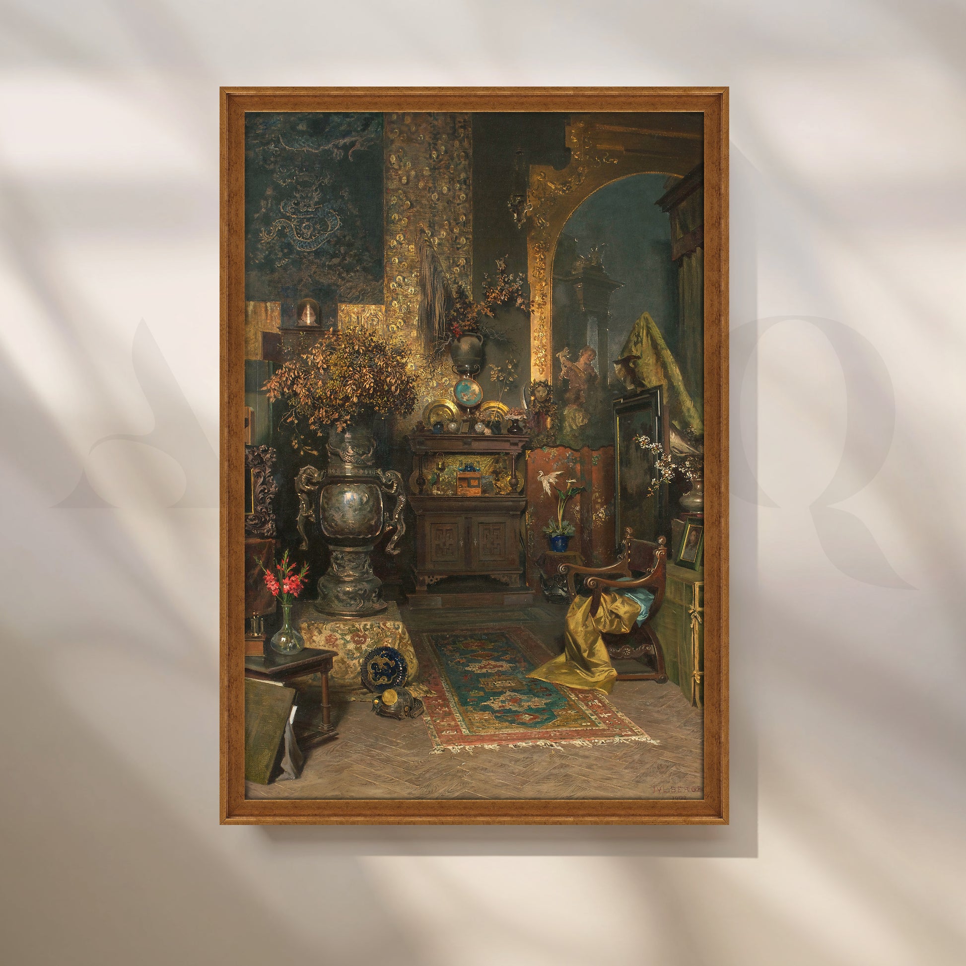 An intricately detailed Anciq artwork depicting an antique room adorned with ornate vases, rugs, and decor. A masterpiece that adds regal charm to study rooms or vintage home offices. Keywords: vintage interior art, classic decor painting, antique European artwork, royal wall decor, luxurious study room canvas.