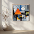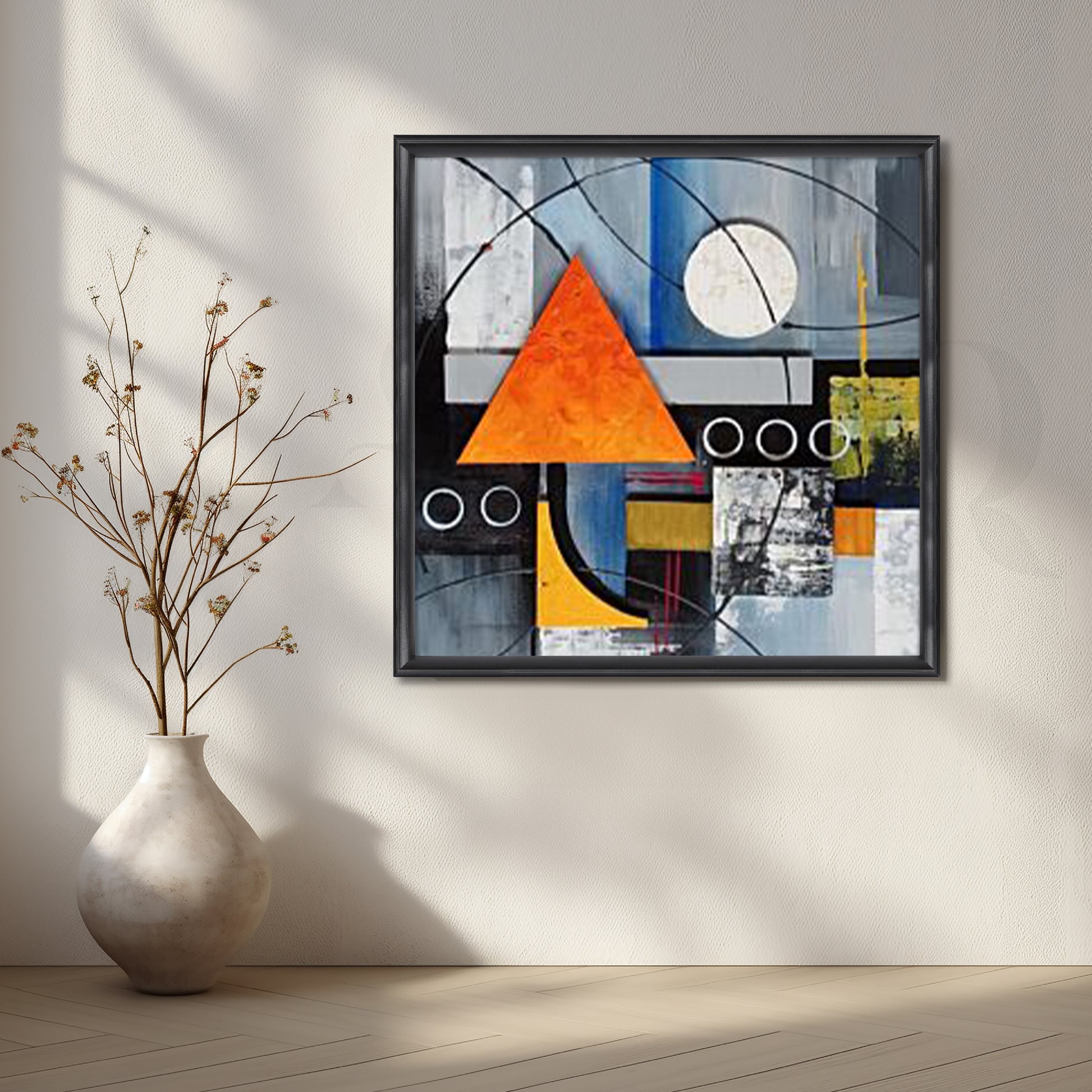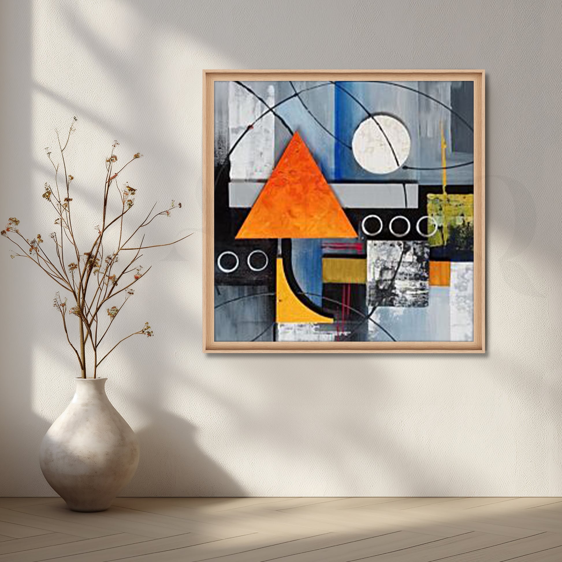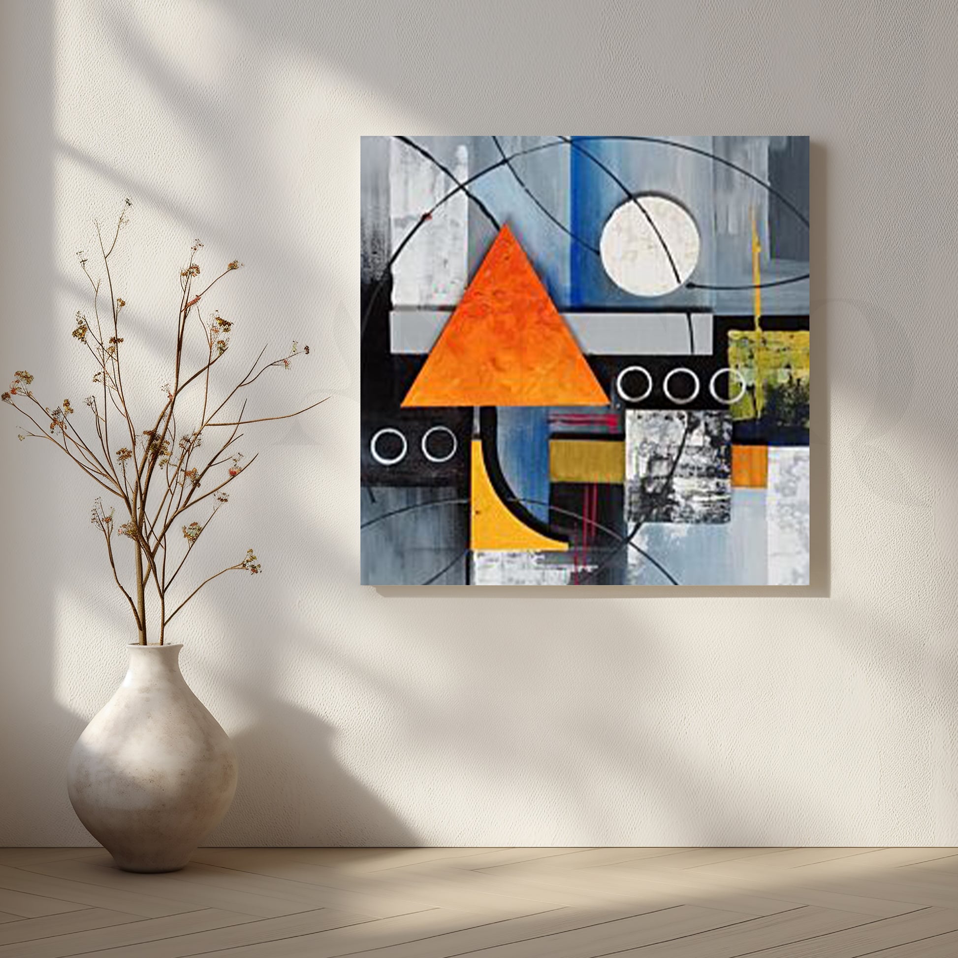 Bold and contemporary, this canvas painting places a vivid orange triangle and white moon against layered blue-grey blocks and graphic circles. Ideal as a statement piece for offices, living rooms and creative studios, it targets keywords such as modern abstract wall art, geometric canvas painting and bold contemporary decor.