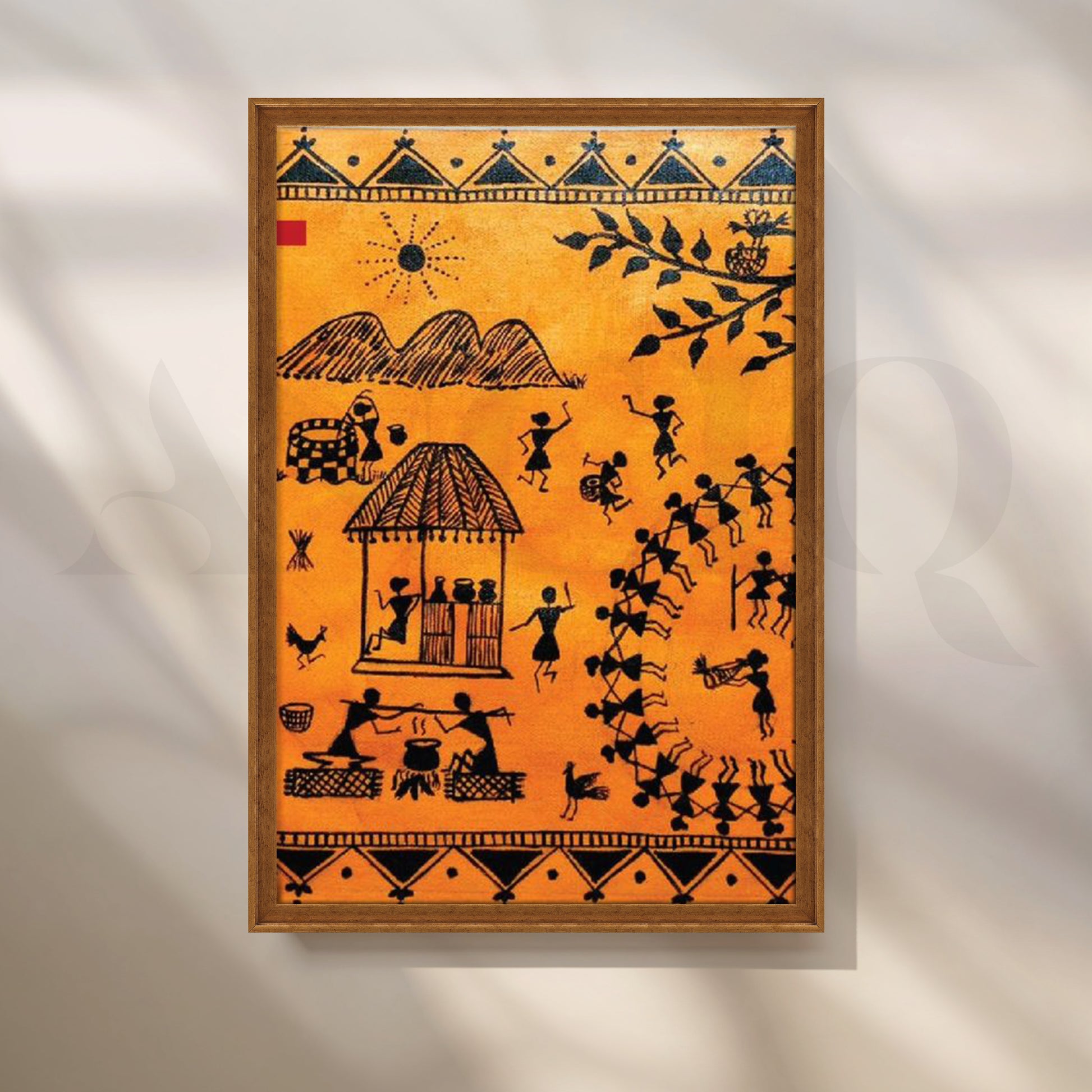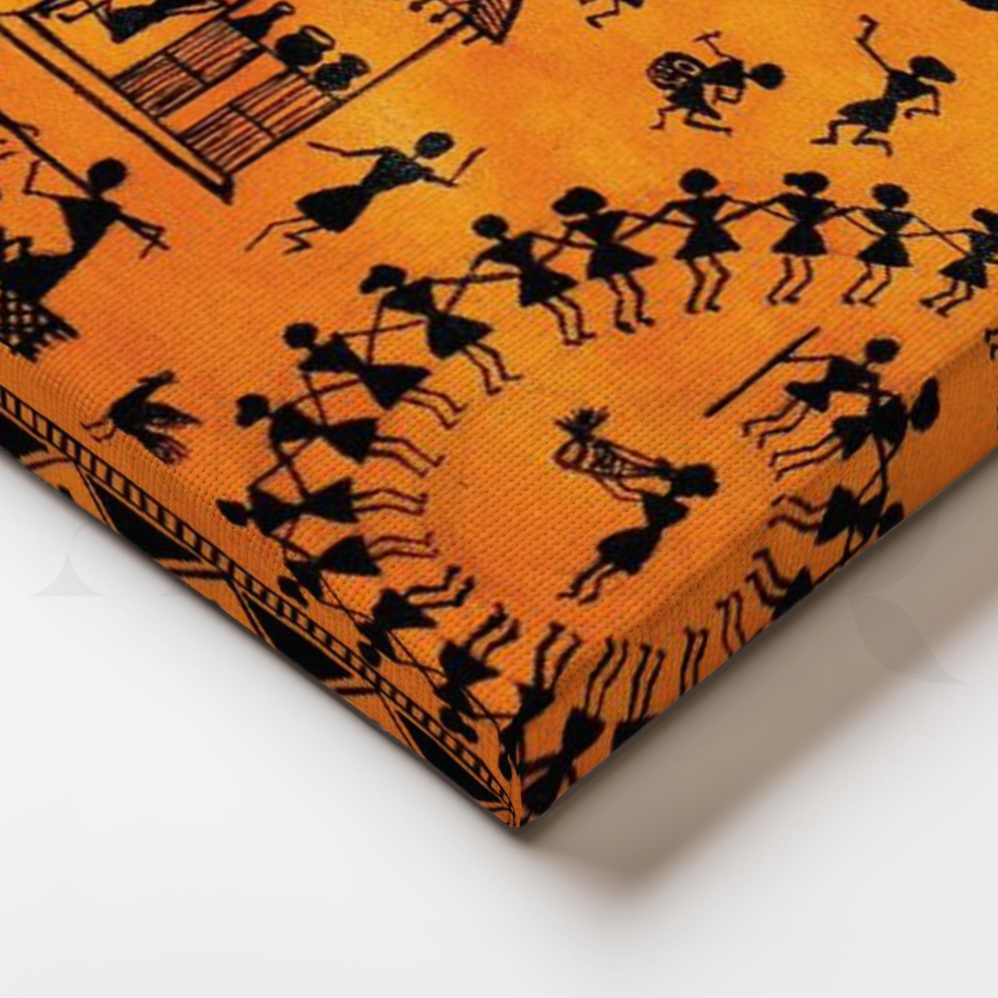This lively Anciq canvas captures a traditional Warli dance around a village scene in vivid orange and black. Perfect for living rooms, cafés, or art walls that celebrate culture and motion. Keywords: Warli dance painting, Indian tribal folk art, orange wall decor, ethnic canvas painting, vibrant wall art for living room.