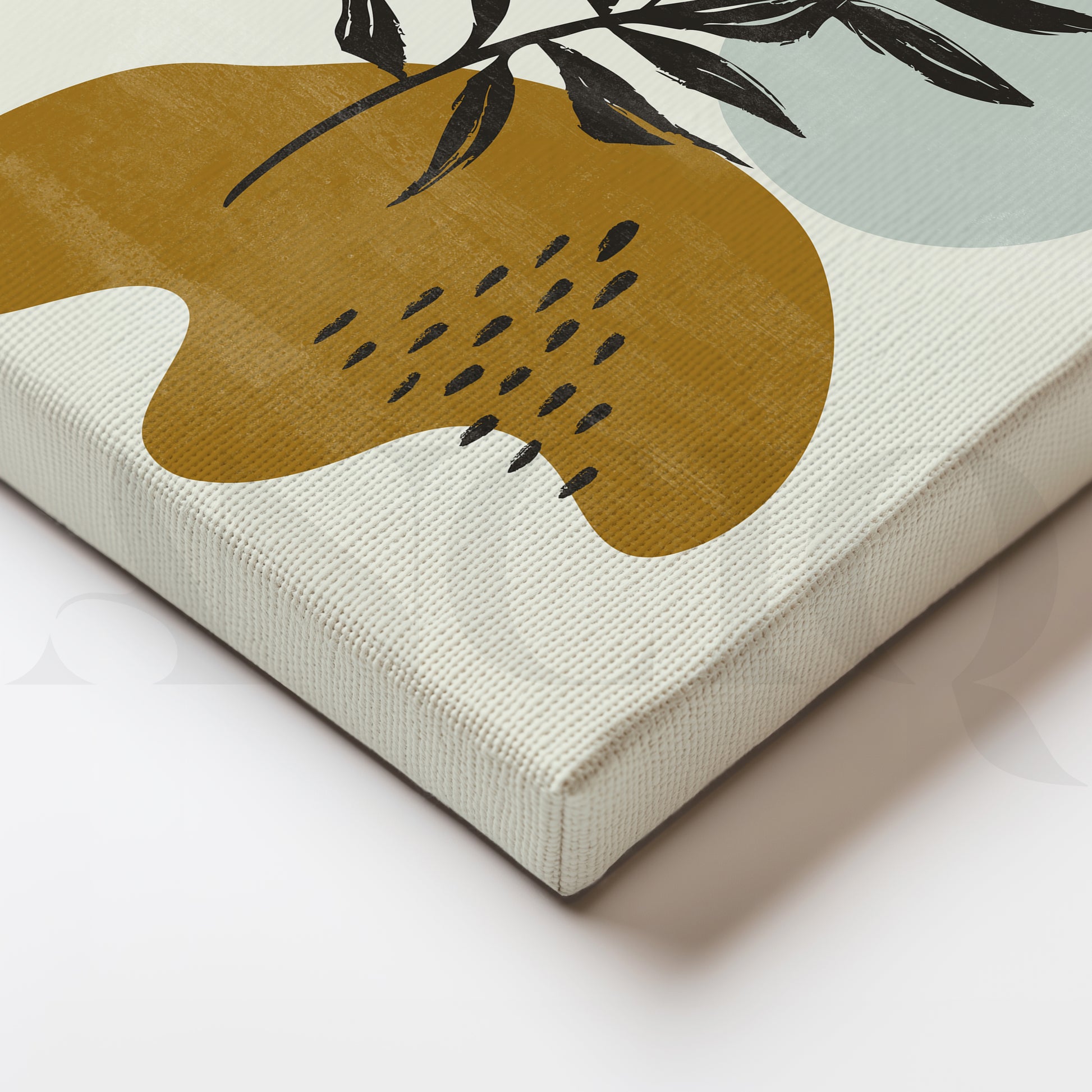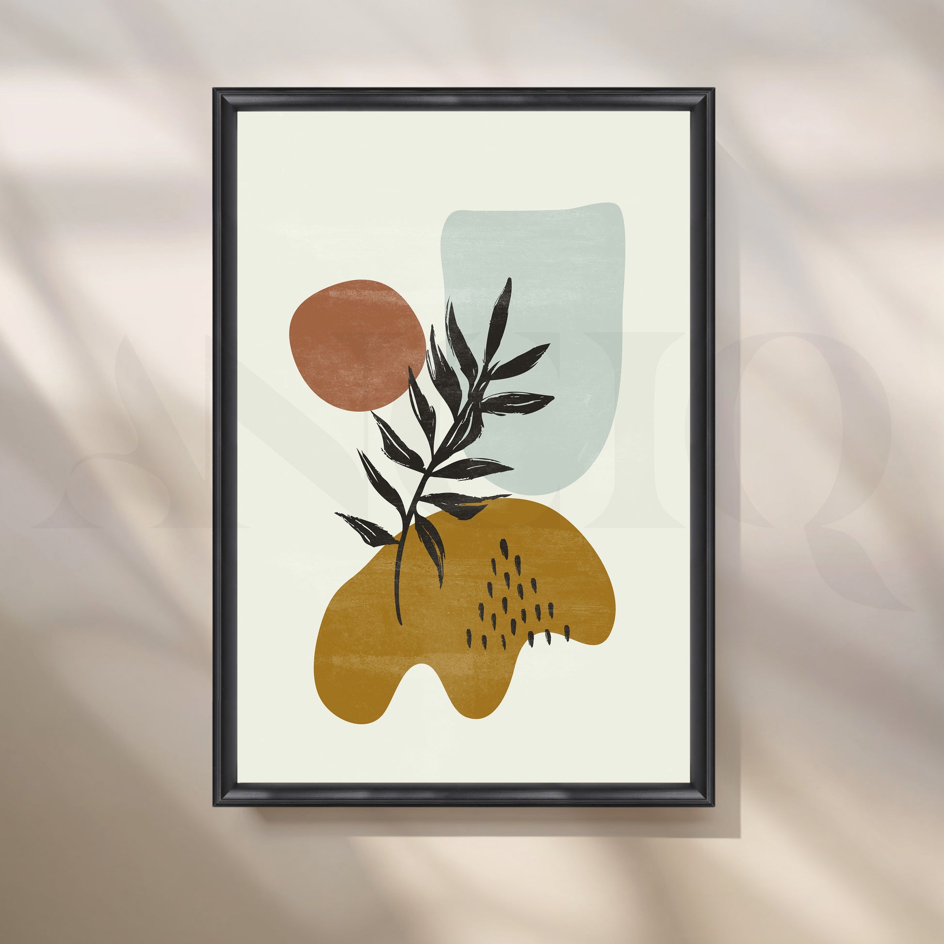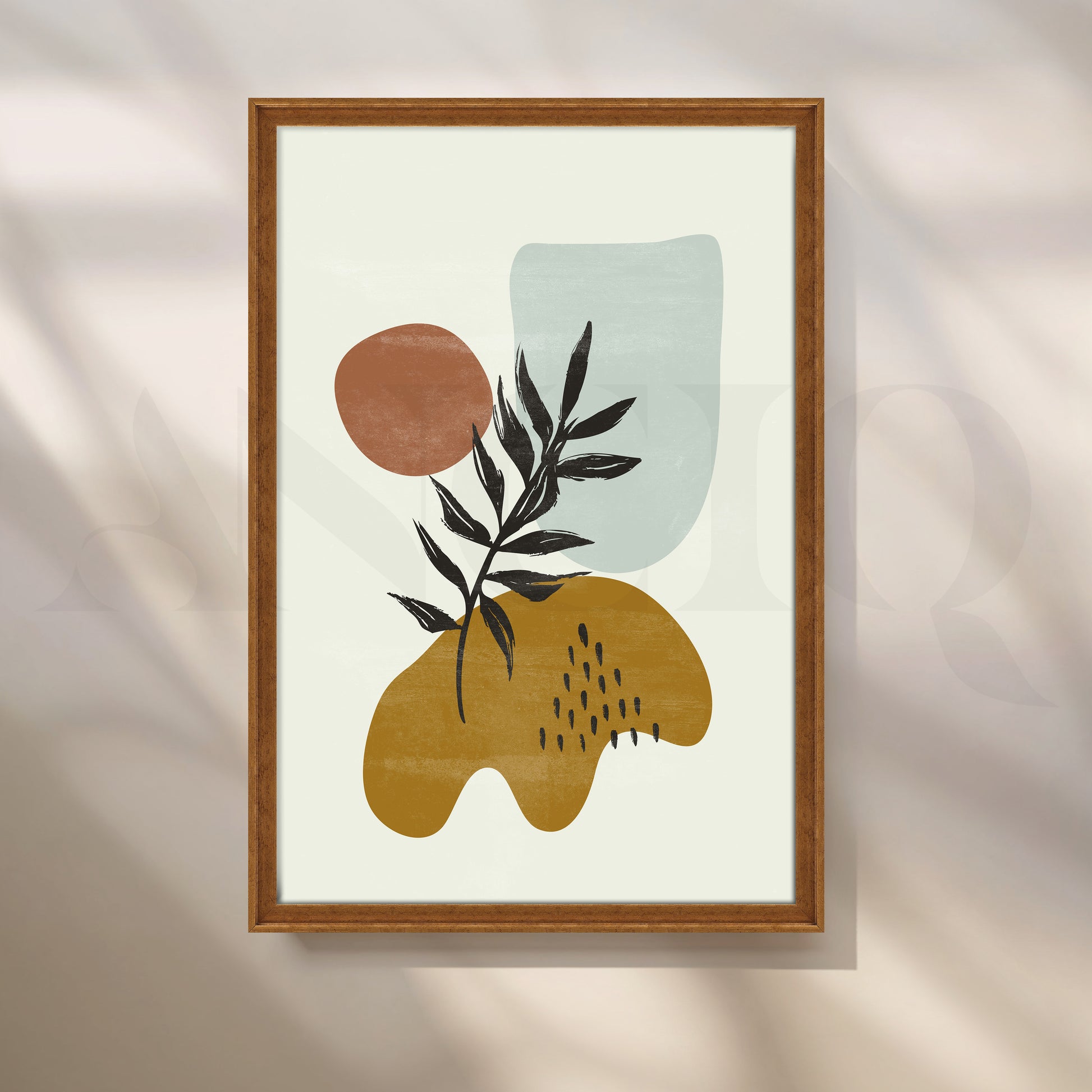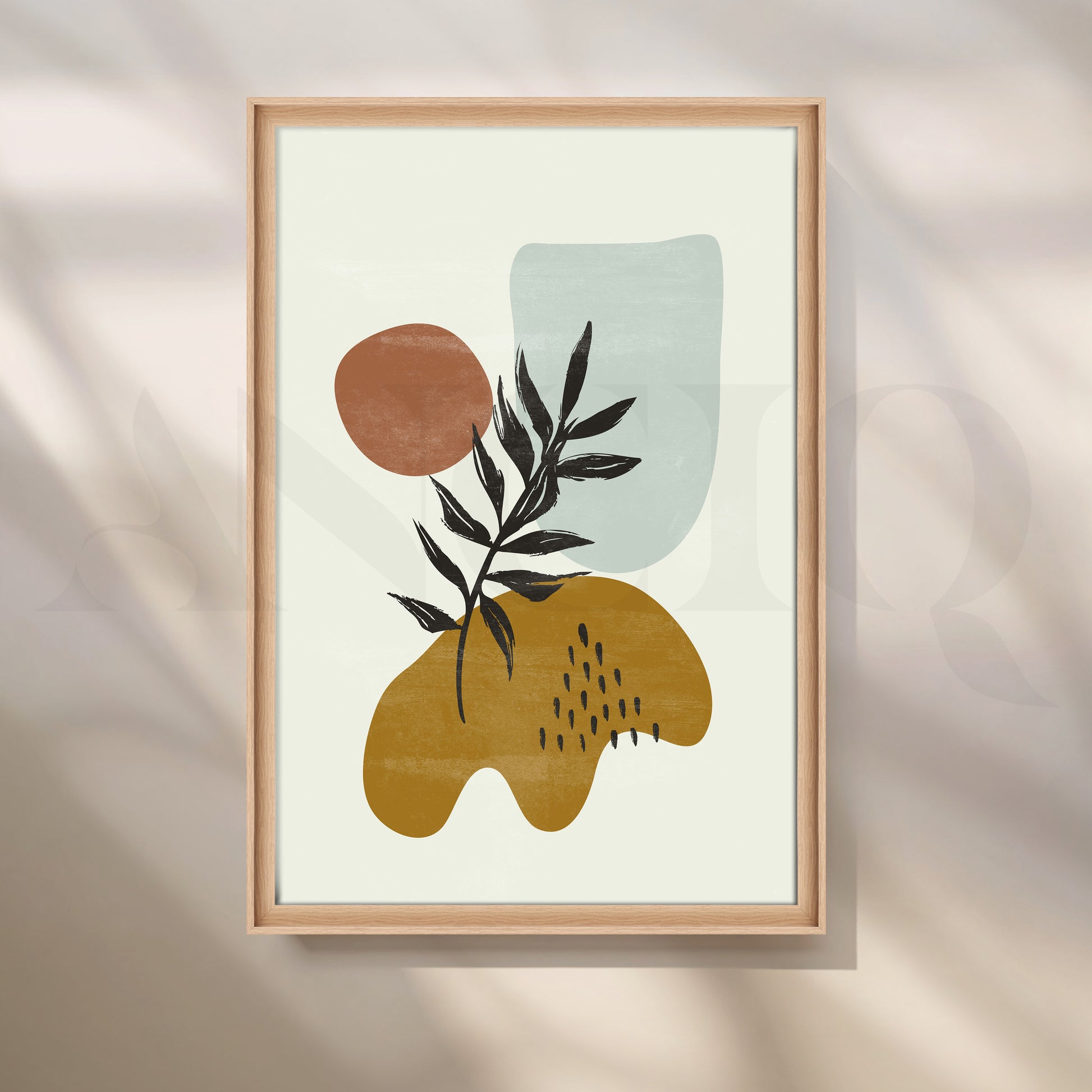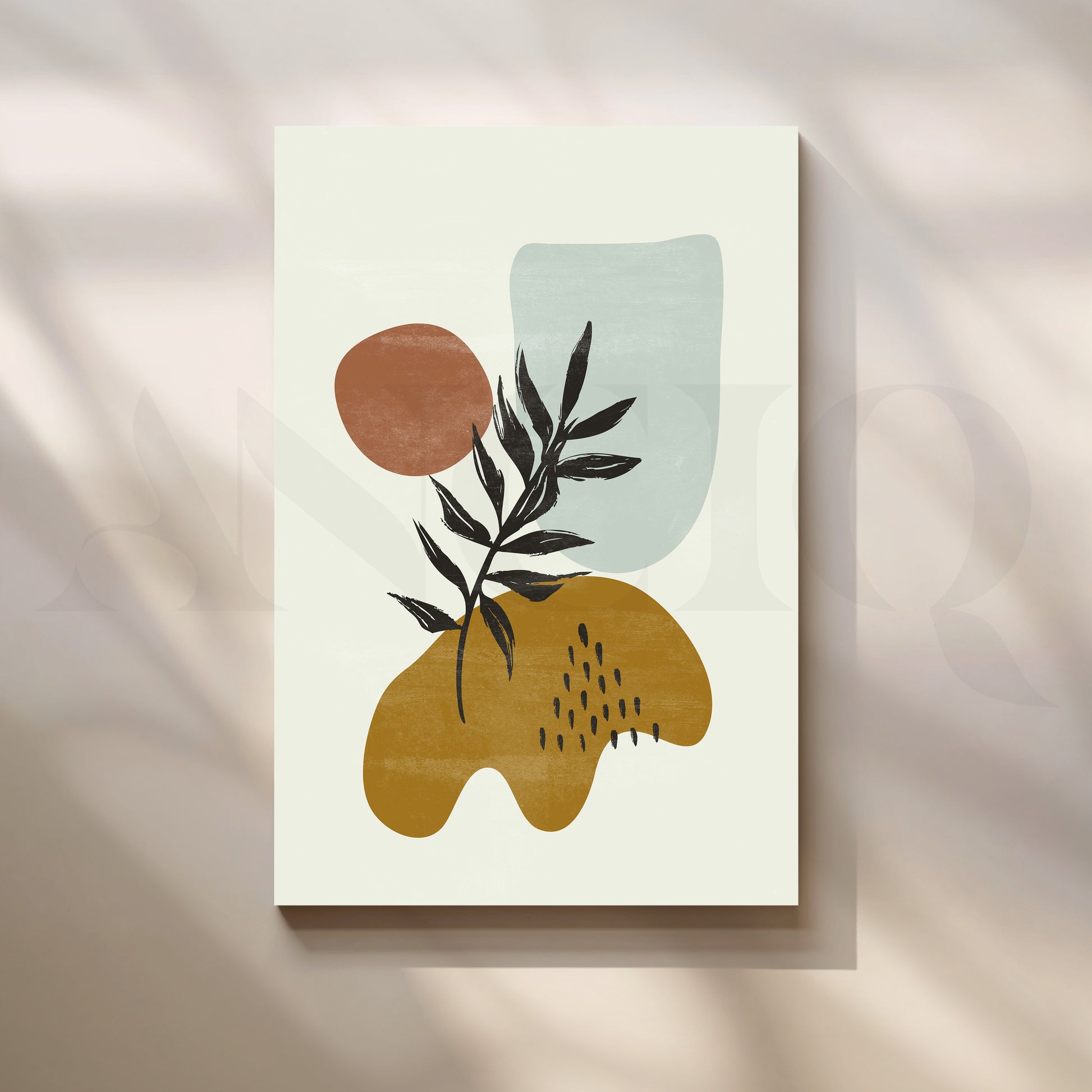 Organic Shapes and Natural Elements Boho Art: This abstract artwork features a collection of organic shapes and a single black branch with leaves, arranged against a muted background. The earthy tones of rust, mustard, and pale blue balance the composition, giving it a grounded yet modern feel. The interplay between the natural element and the abstract forms suggests a dialogue between nature and design, creating a visually intriguing piece that draws the viewer's attention to its simplicity and depth.