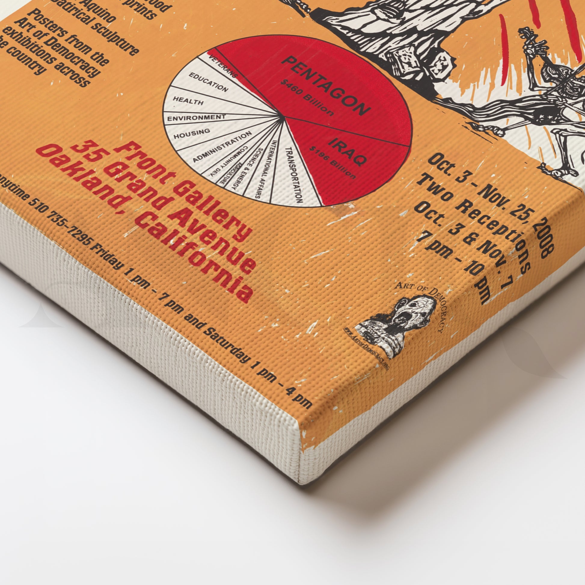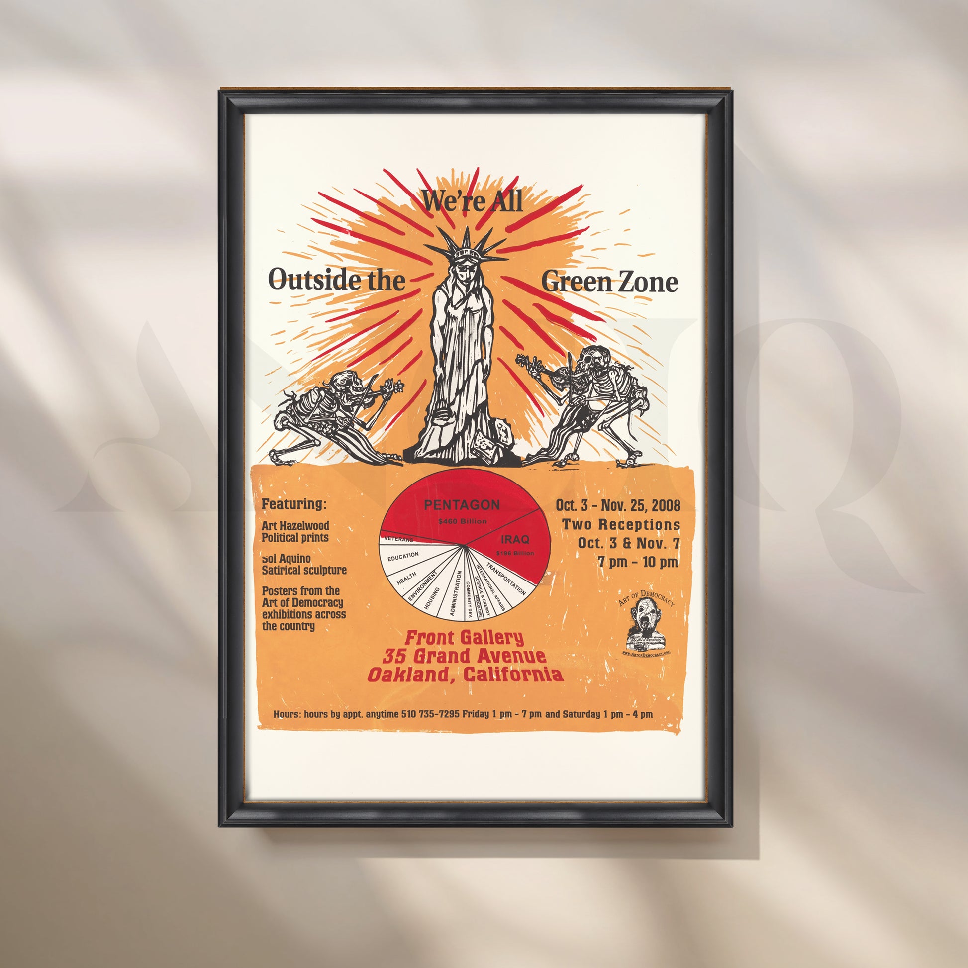 Anciq ‘Outside the Green Zone – Color’ Canvas Artwork powerfully contrasts liberty and war with explosive imagery. Featuring the Statue of Liberty flanked by armed figures and a Pentagon-Iraq spending pie chart, it makes a bold anti-war statement—perfect for gallery walls, academic institutions, and political art enthusiasts.