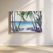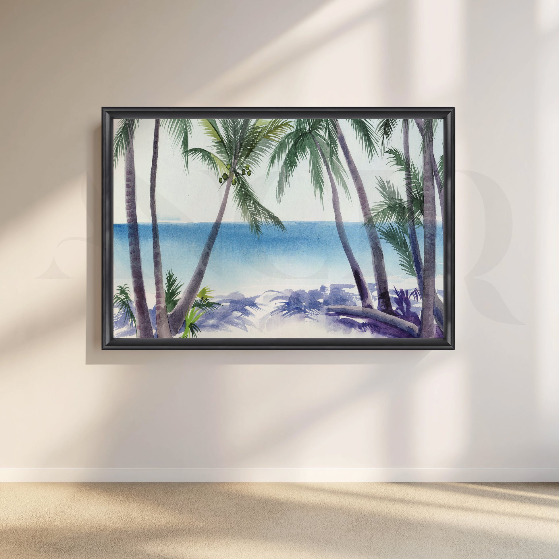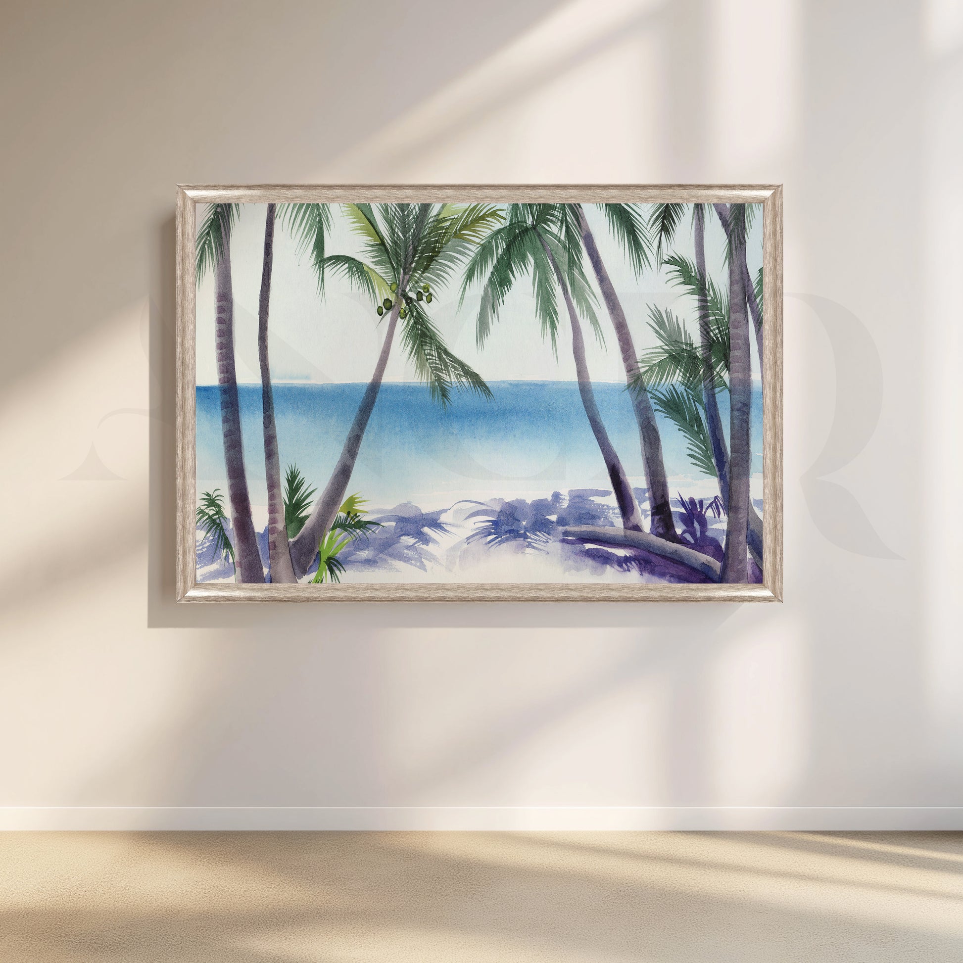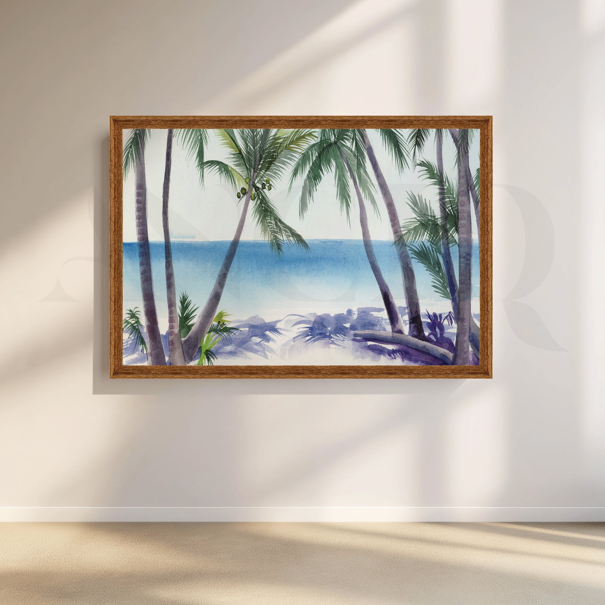 Immerse yourself in tranquility with this watercolor masterpiece. Sun-drenched sands and swaying palm trees whisper tales of tropical bliss. Perfect for adding a touch of paradise to your home, this beachscape washes away stress with every glance. Hand-painted in watercolors, this original artwork is a unique conversation starter.