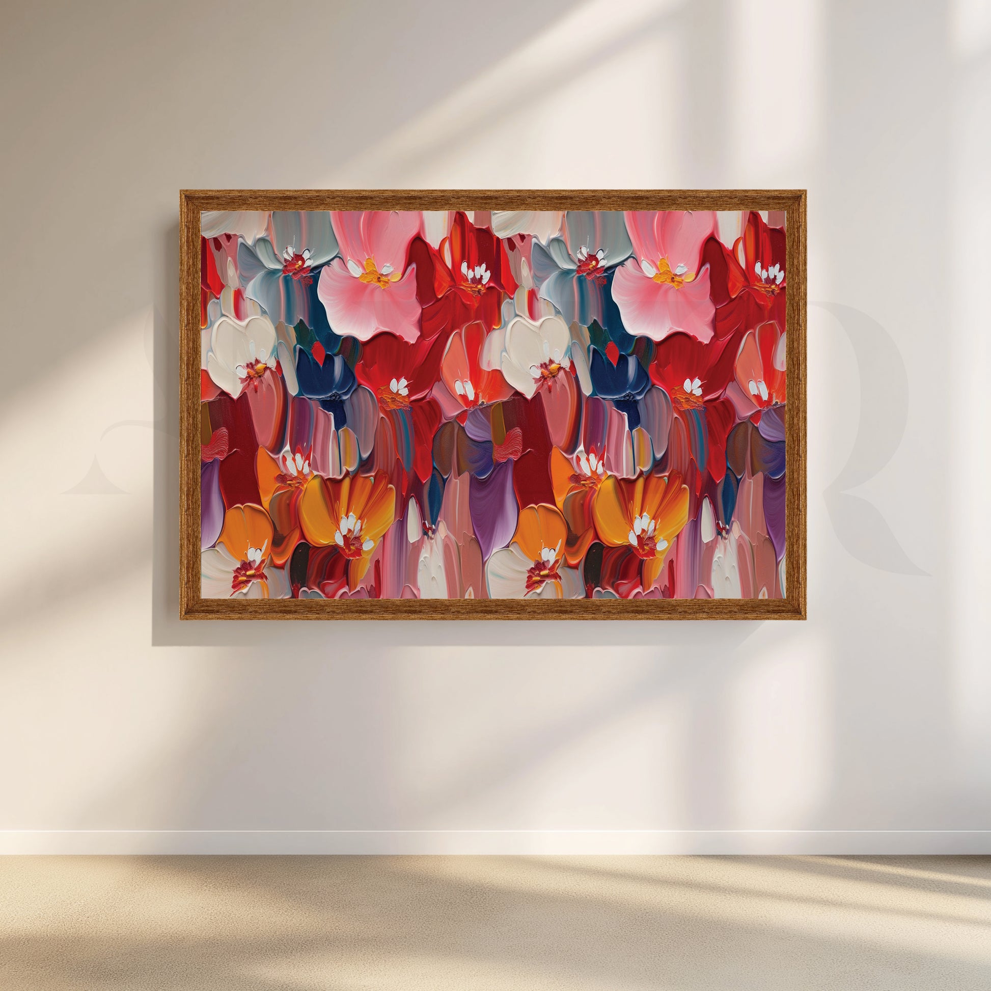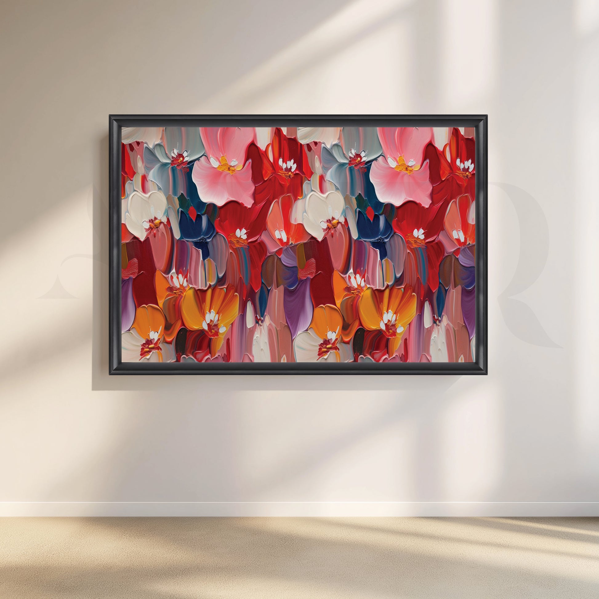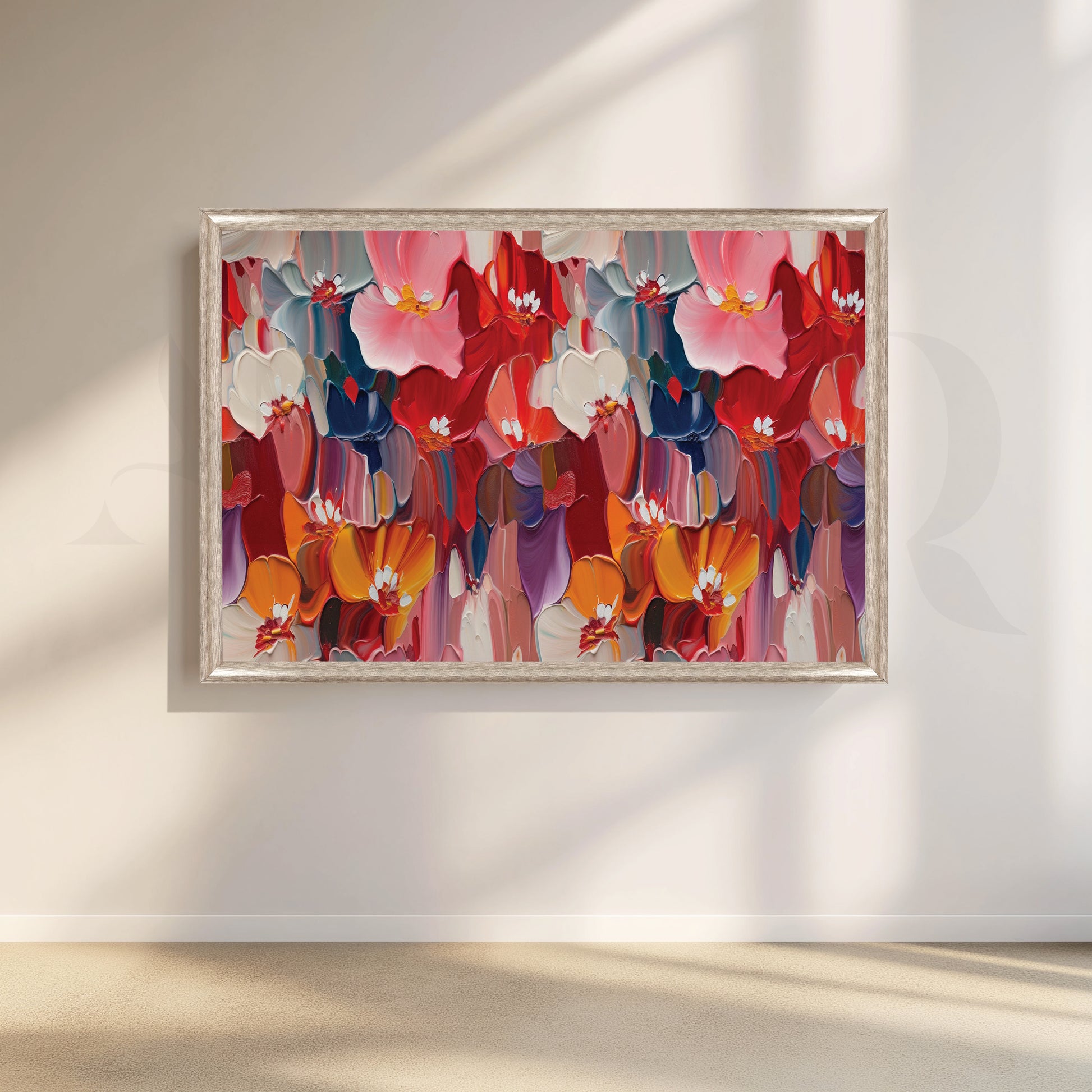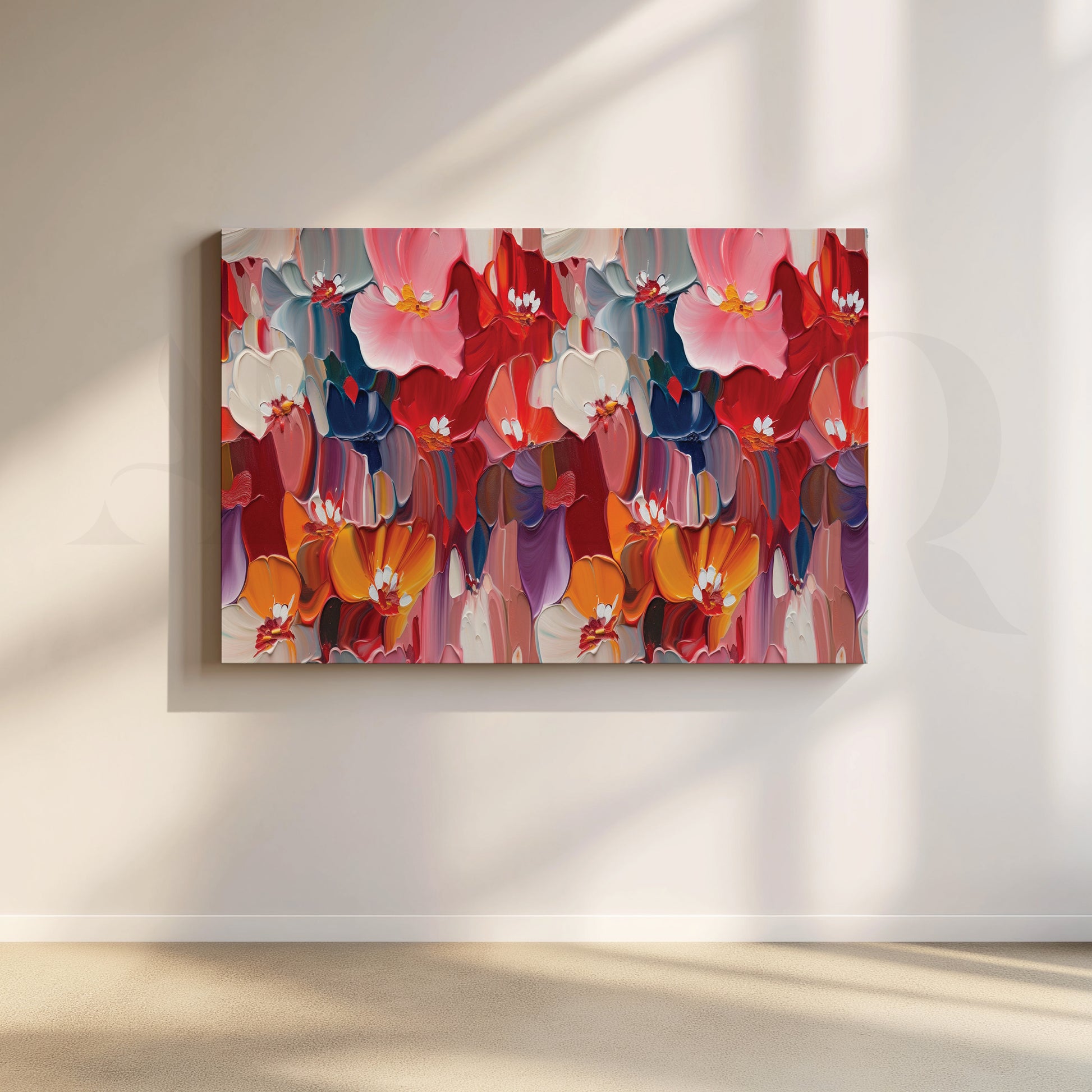 Bring life to your walls with this captivating floral painting. Rich colors dance on canvas, creating a stunning explosion of colorful blooms. This piece is a perfect focal point, adding a touch of joy and energy to any space.