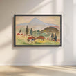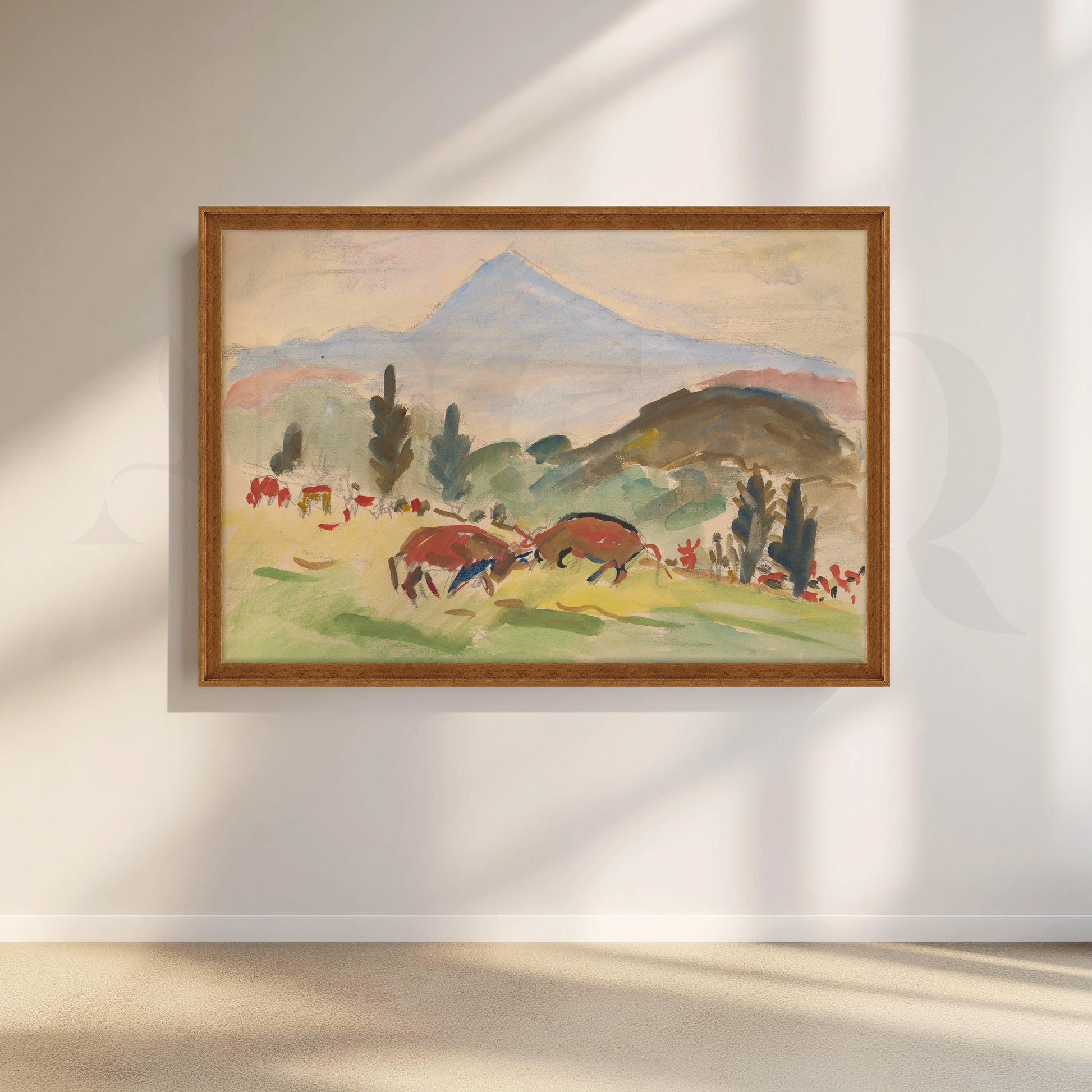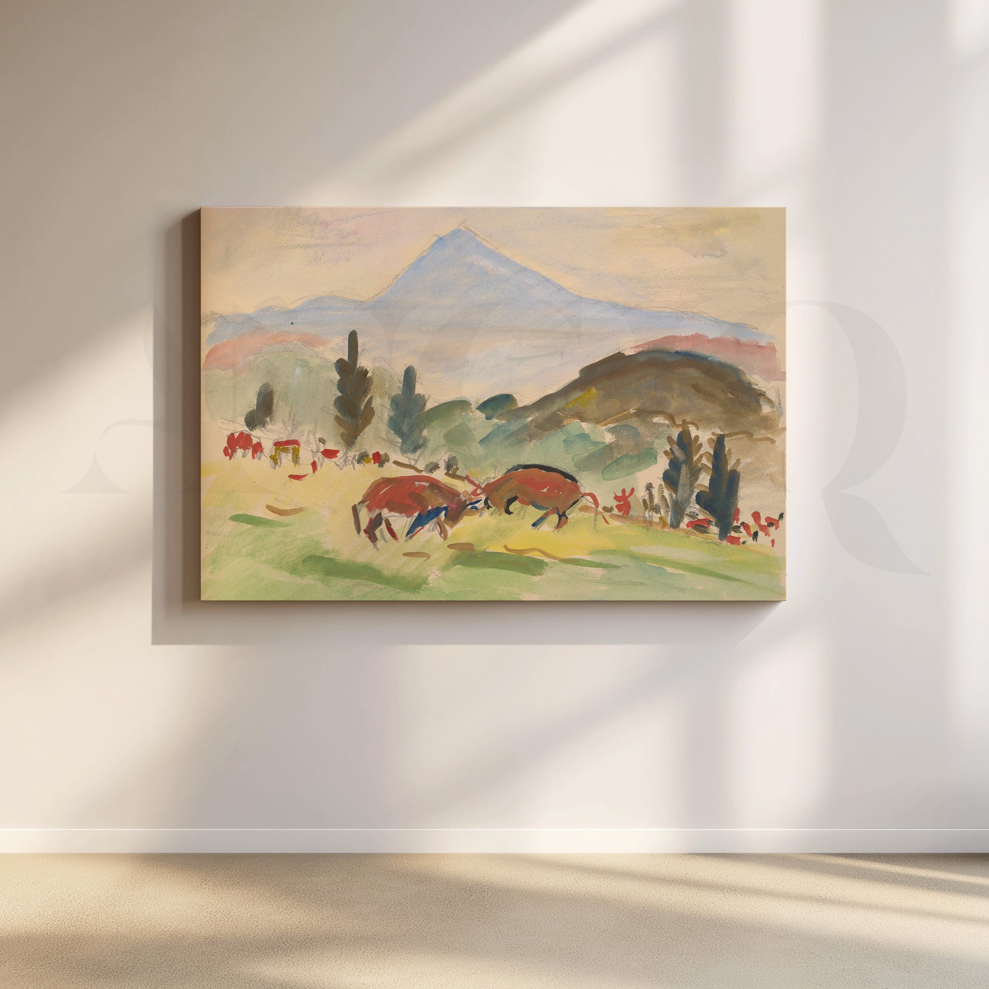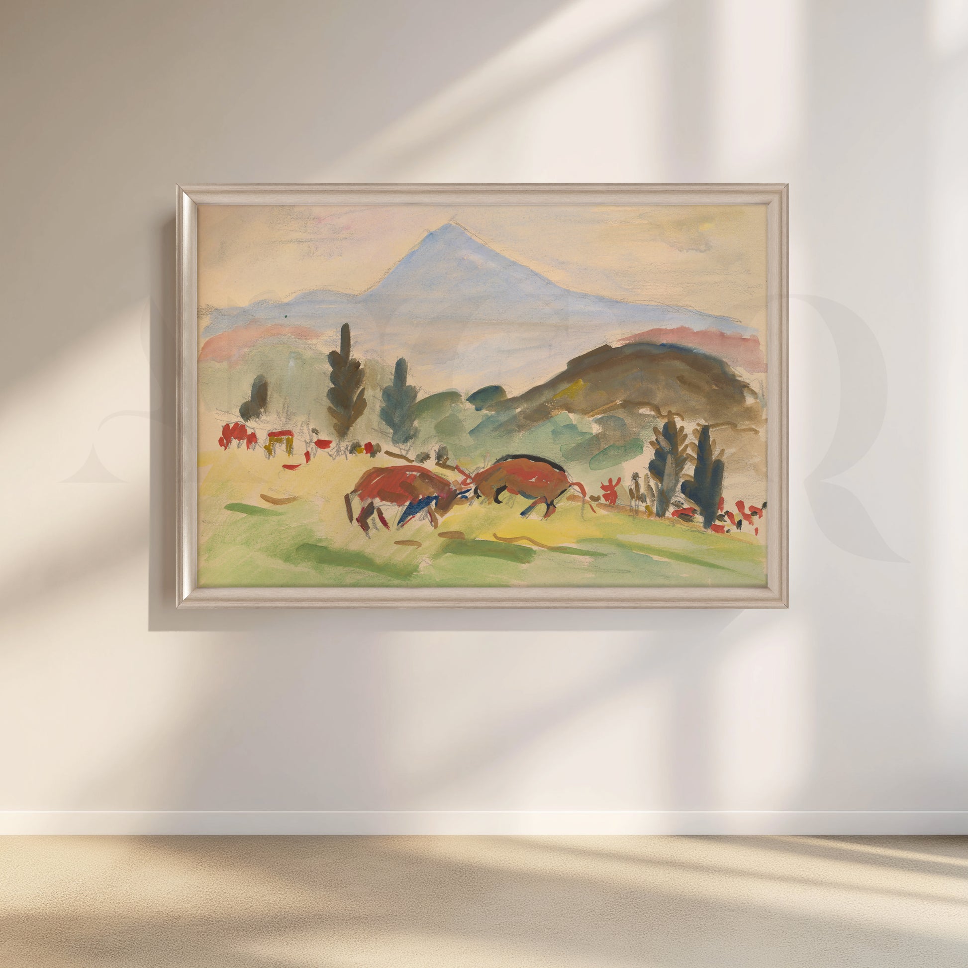 Soft watercolor landscape of grazing bulls against rolling hills and a distant mountain. Calm, rustic tones make it perfect for farmhouse décor, dining areas and kitchens. Keywords: pastoral landscape art, farmhouse wall décor, countryside canvas, rustic dining room art, watercolor hills painting, mountain meadow print.