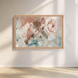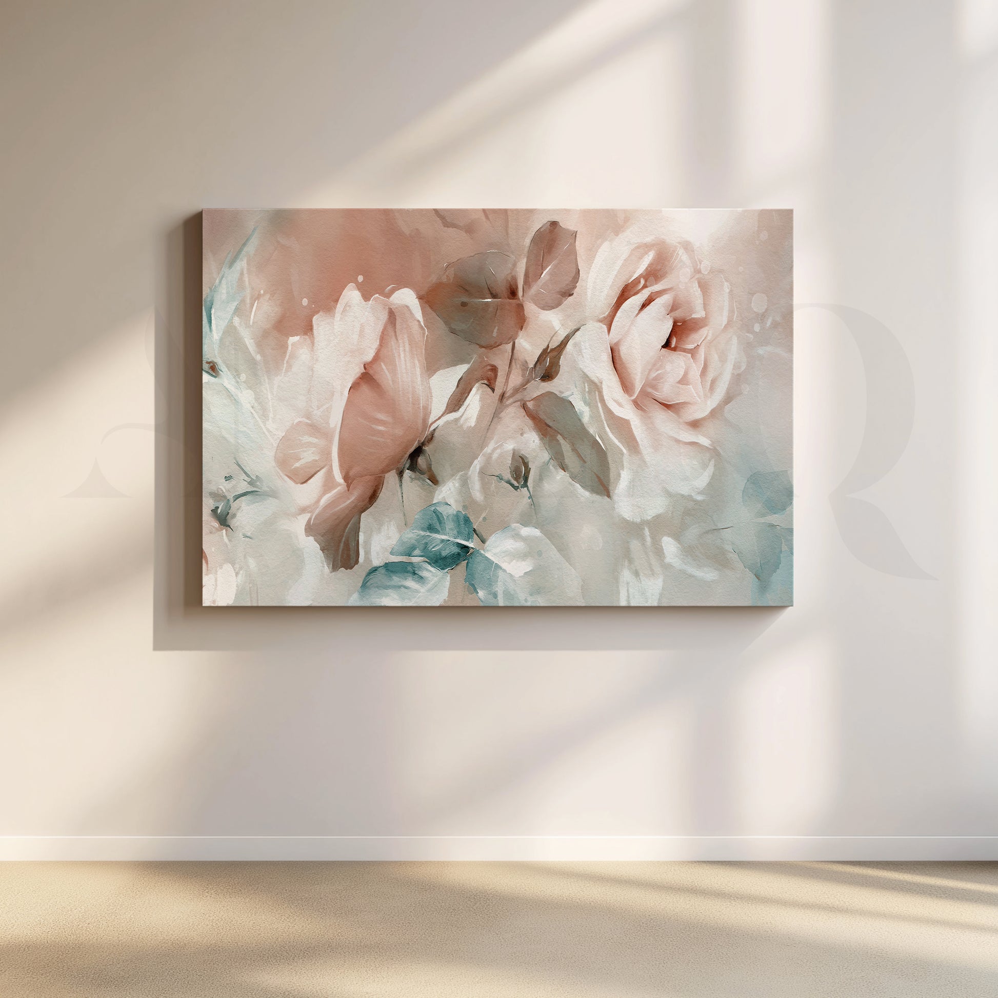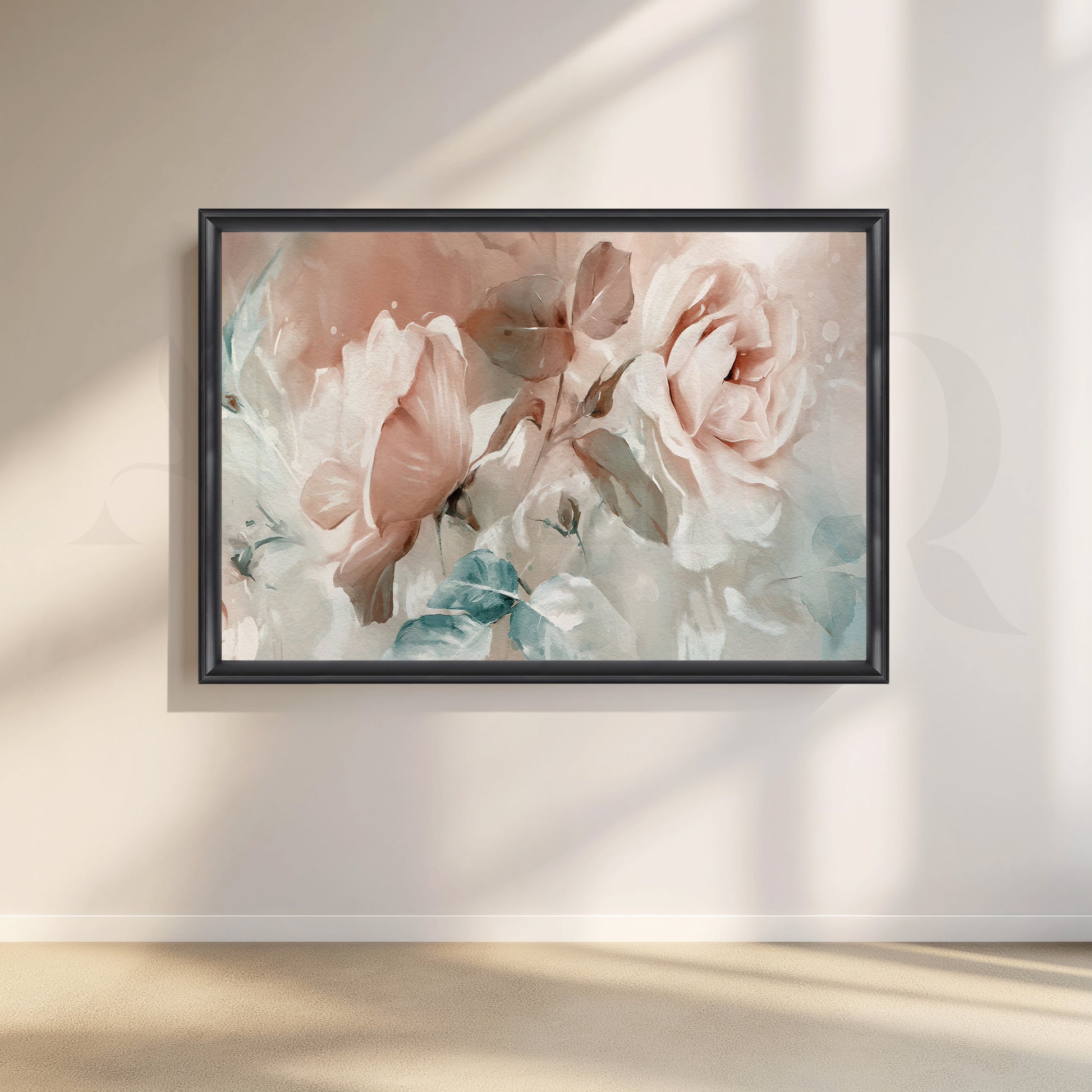 This stunning abstract painting features a cluster of pink and white roses against a crisp white background. The bold brushstrokes and vibrant colors create a captivating focal point for any room.