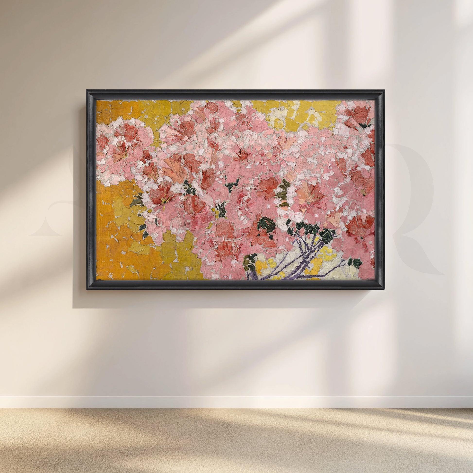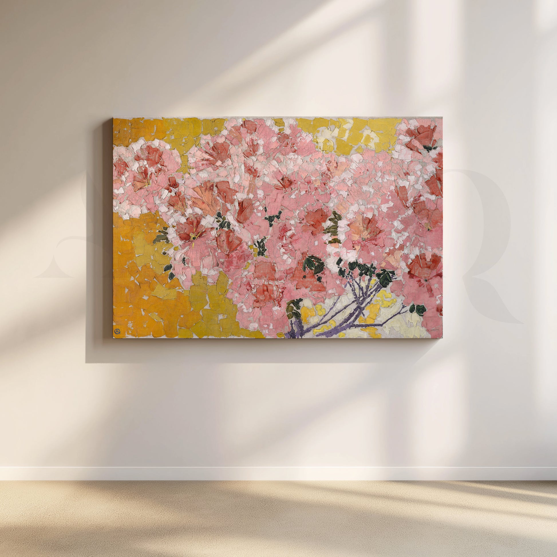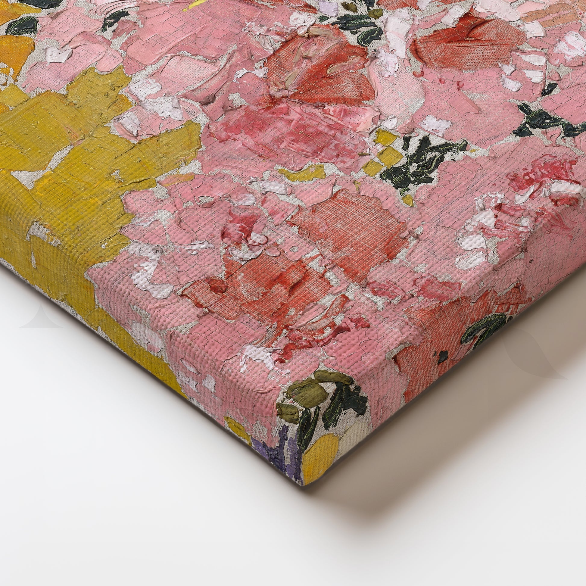A vibrant floral canvas bursting with blush-pink petals against a warm mustard-gold backdrop. This impressionist bouquet adds a soft, romantic pop of color to modern interiors. Perfect wall décor for the living room, bedroom, or entryway. Premium canvas print featuring textured brushwork, pastel tones, and spring garden vibes. Style it above a sofa or console for instant luxury floral art. Keywords: floral canvas wall art, pink flower painting, modern impressionist print, pastel home décor, living room wall décor, gift for her, spring blossoms artwork.