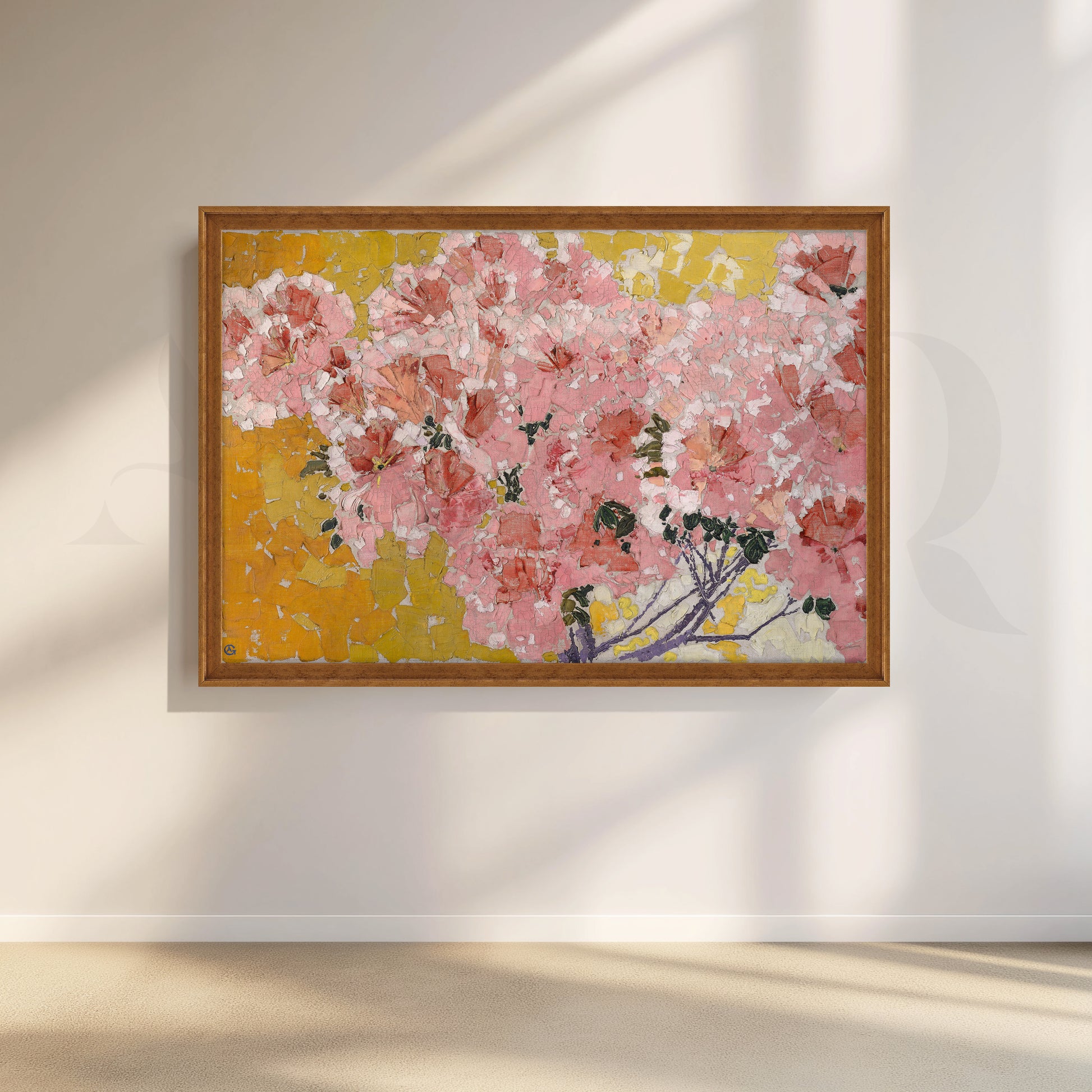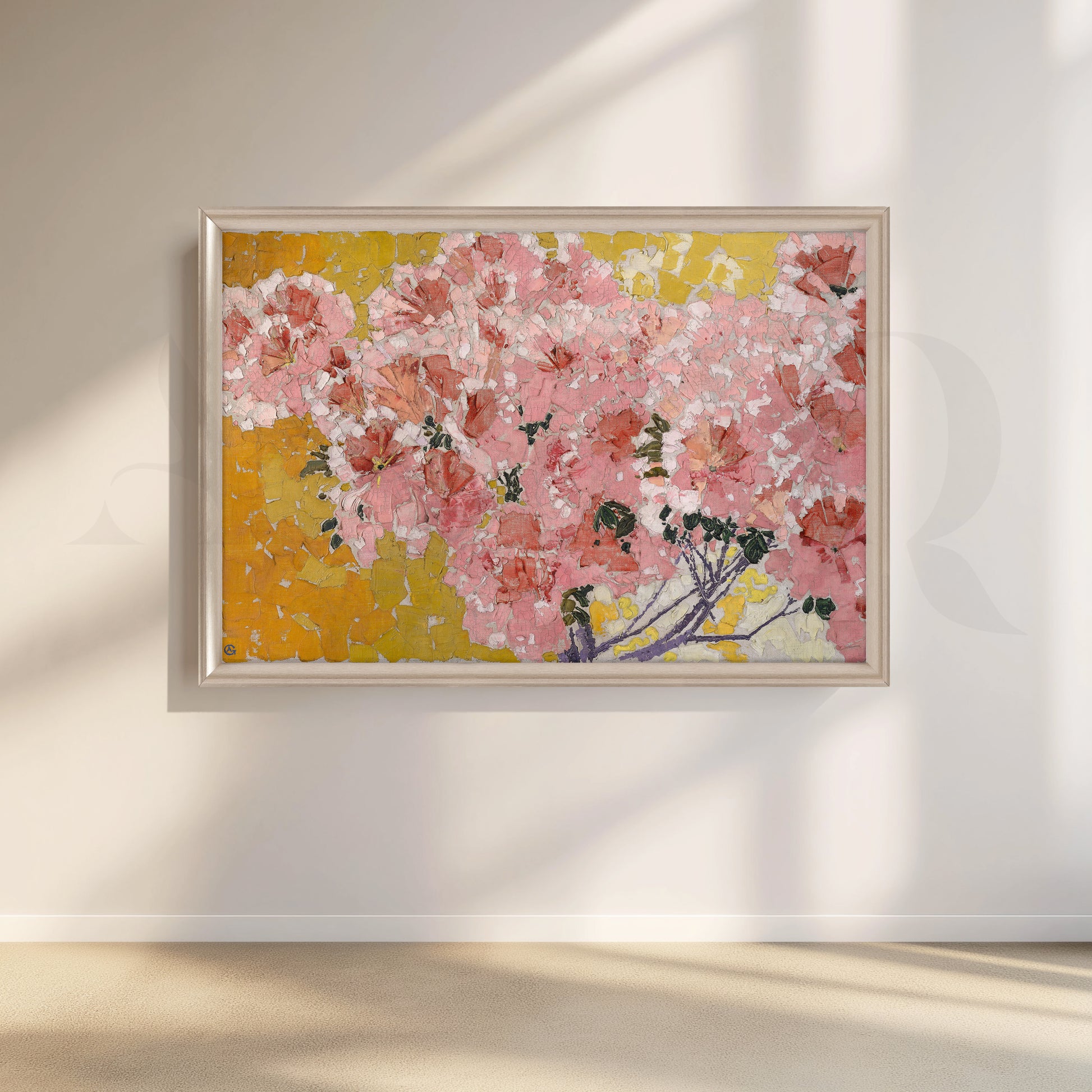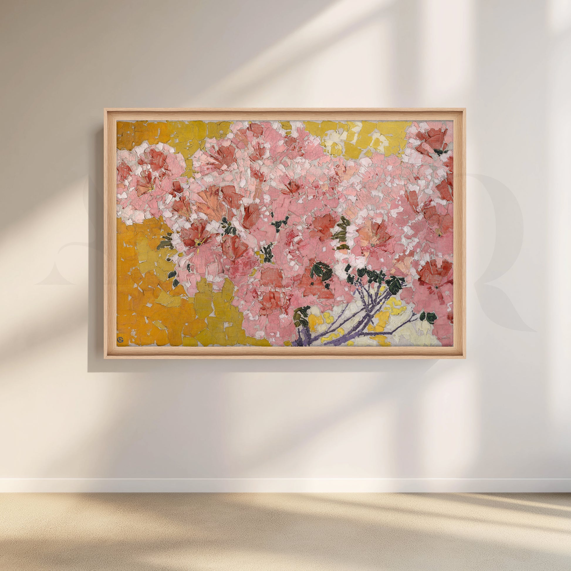 A vibrant floral canvas bursting with blush-pink petals against a warm mustard-gold backdrop. This impressionist bouquet adds a soft, romantic pop of color to modern interiors. Perfect wall décor for the living room, bedroom, or entryway. Premium canvas print featuring textured brushwork, pastel tones, and spring garden vibes. Style it above a sofa or console for instant luxury floral art. Keywords: floral canvas wall art, pink flower painting, modern impressionist print, pastel home décor, living room wall décor, gift for her, spring blossoms artwork.