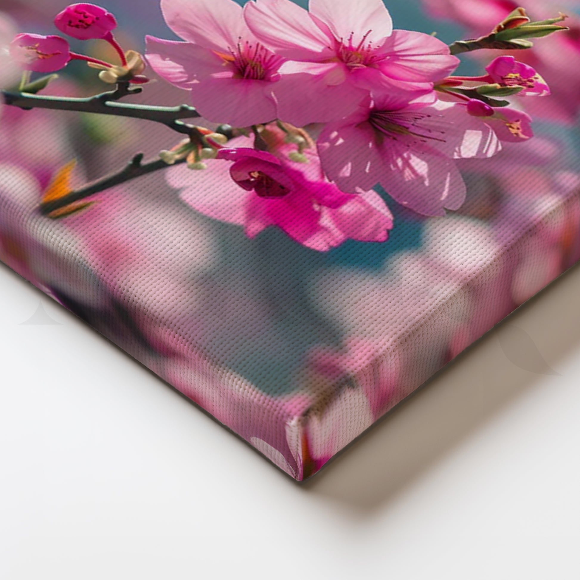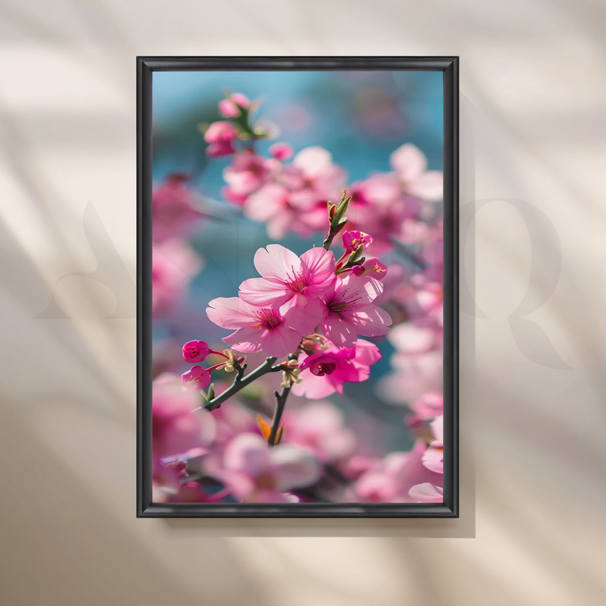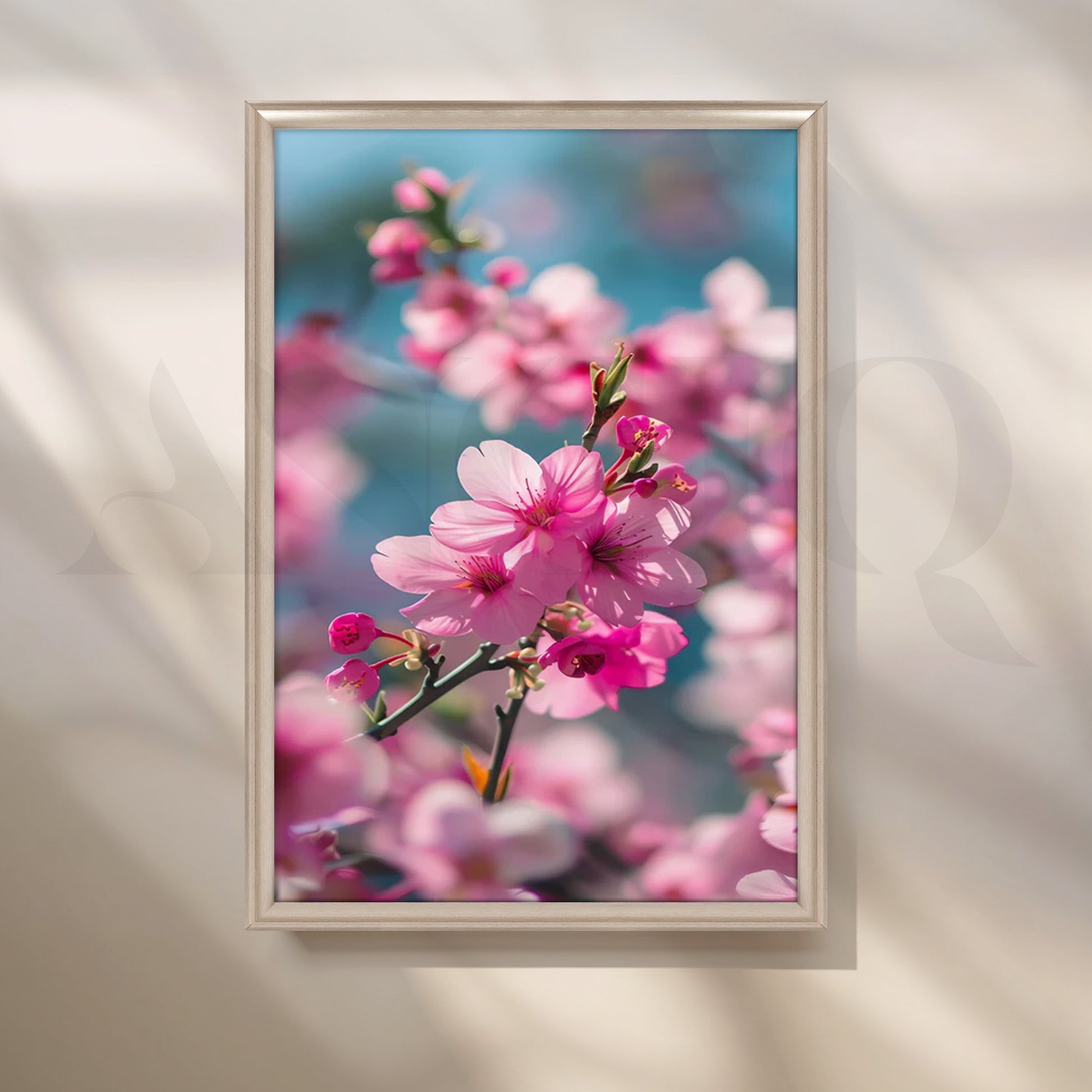 Pink Blossom Spring Wall Poster brings the beauty of cherry blossoms in full bloom. The soft pink petals contrast against a dreamy blue sky, capturing the essence of spring's renewal. Sunlight filters through the delicate flowers, creating a warm and serene atmosphere. This wall poster is perfect for adding a touch of nature and tranquility to any space.