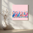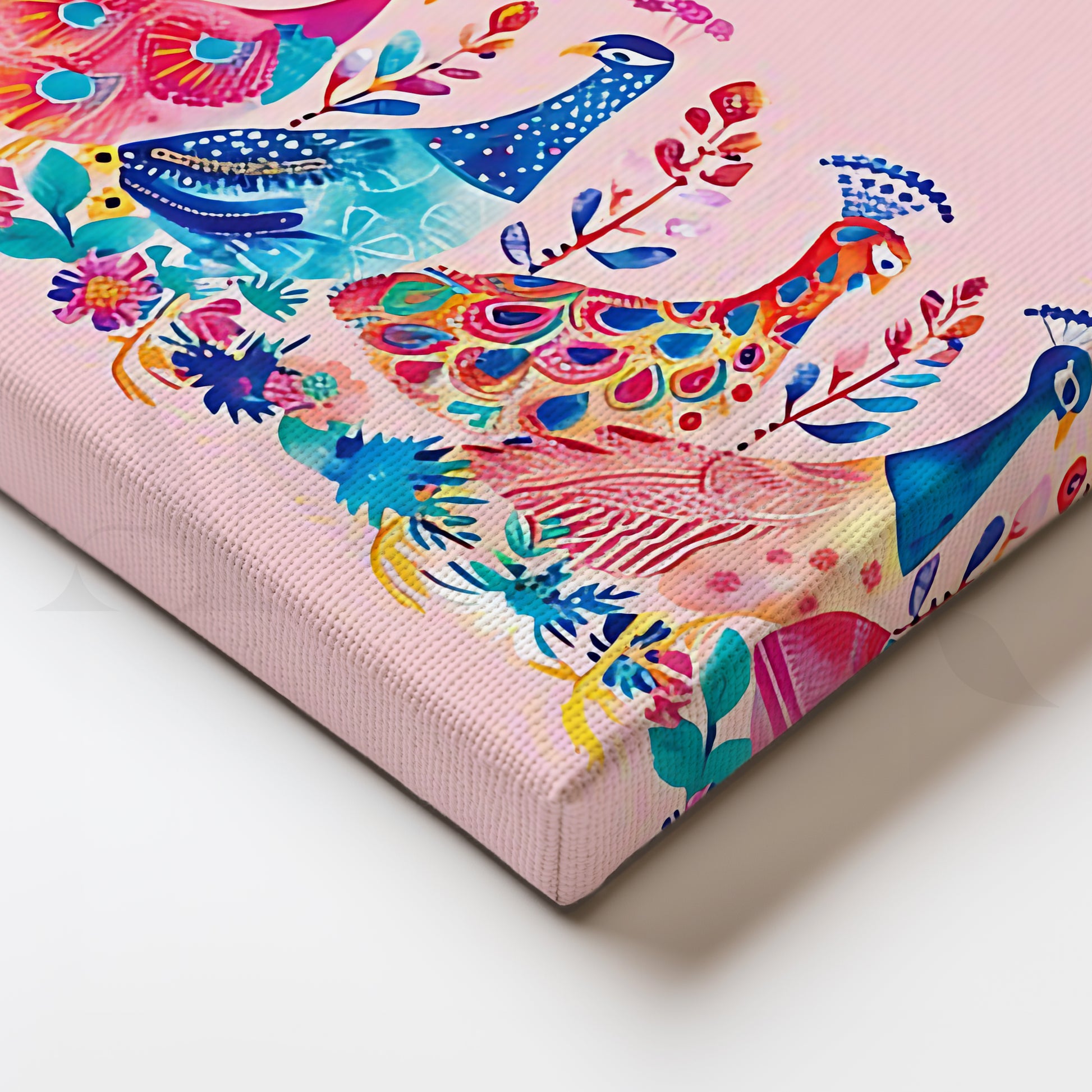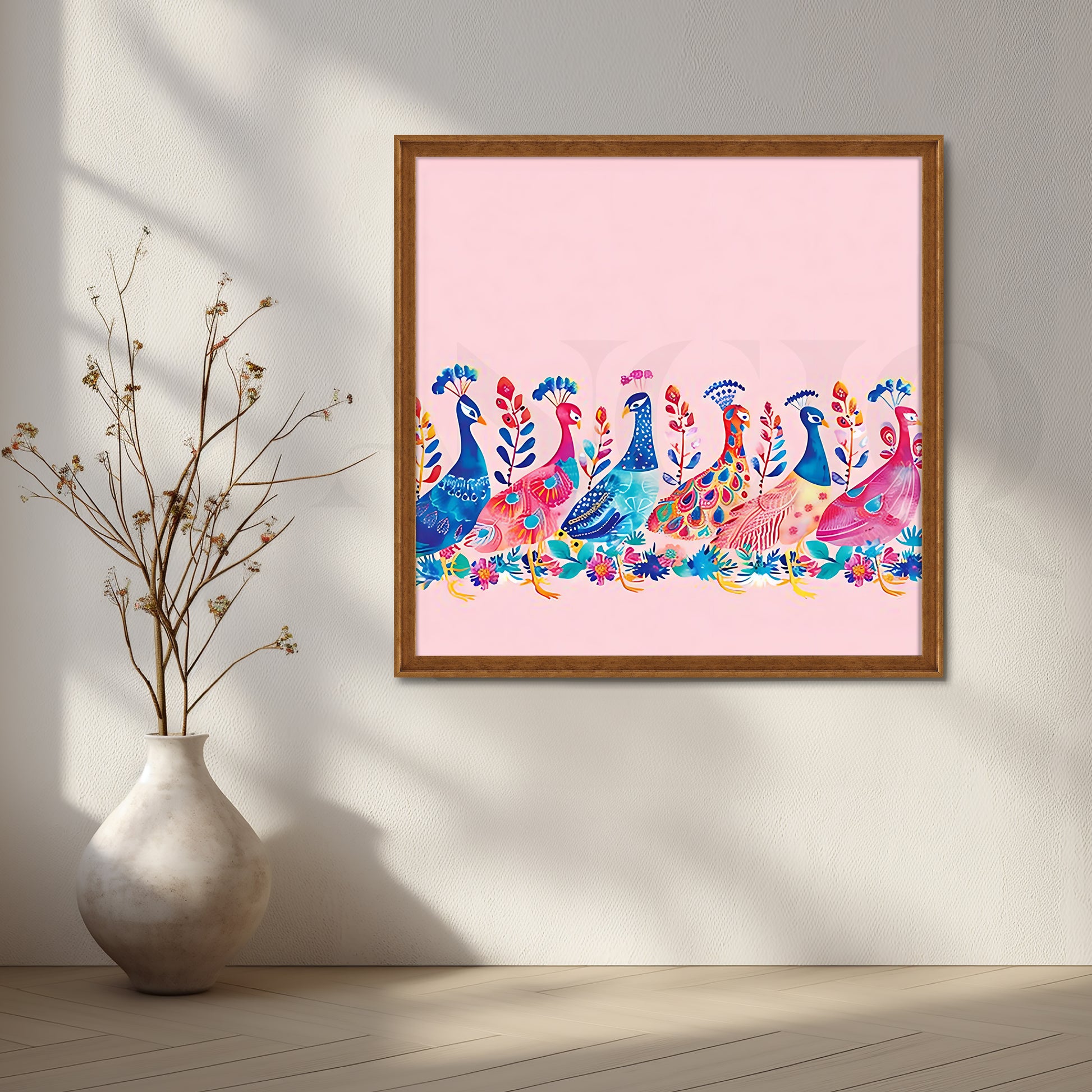 This joyful canvas showcases a row of vibrant peacocks painted in bright blues, pinks and reds on a soft pastel pink background. A refreshing addition to bedrooms, kids' rooms and modern Indian homes. Perfect for keywords like peacock art, pastel wall décor, colourful canvas painting and nature-inspired home décor.