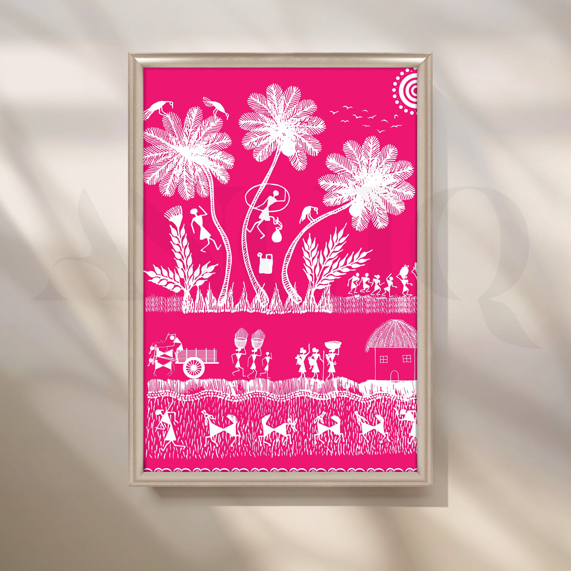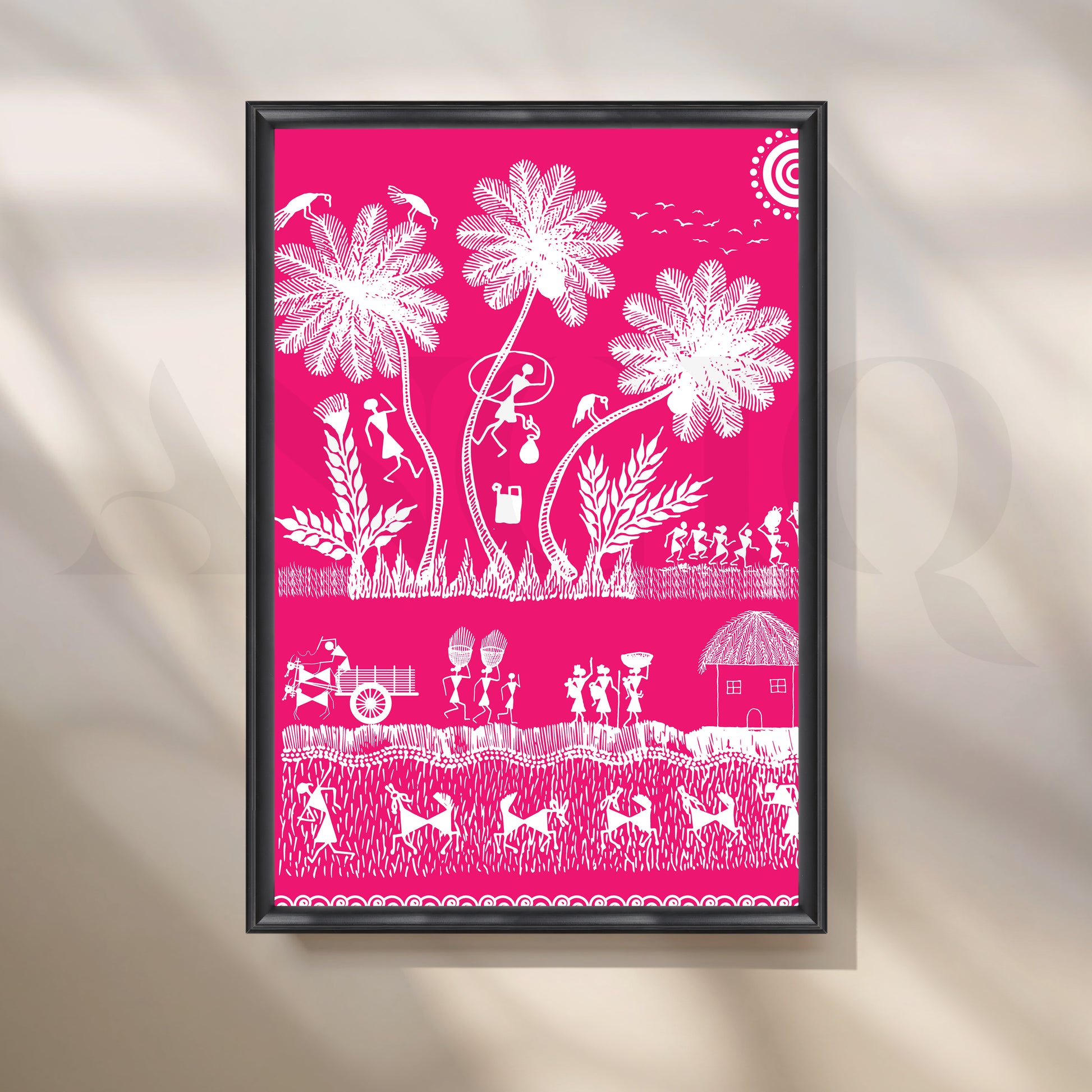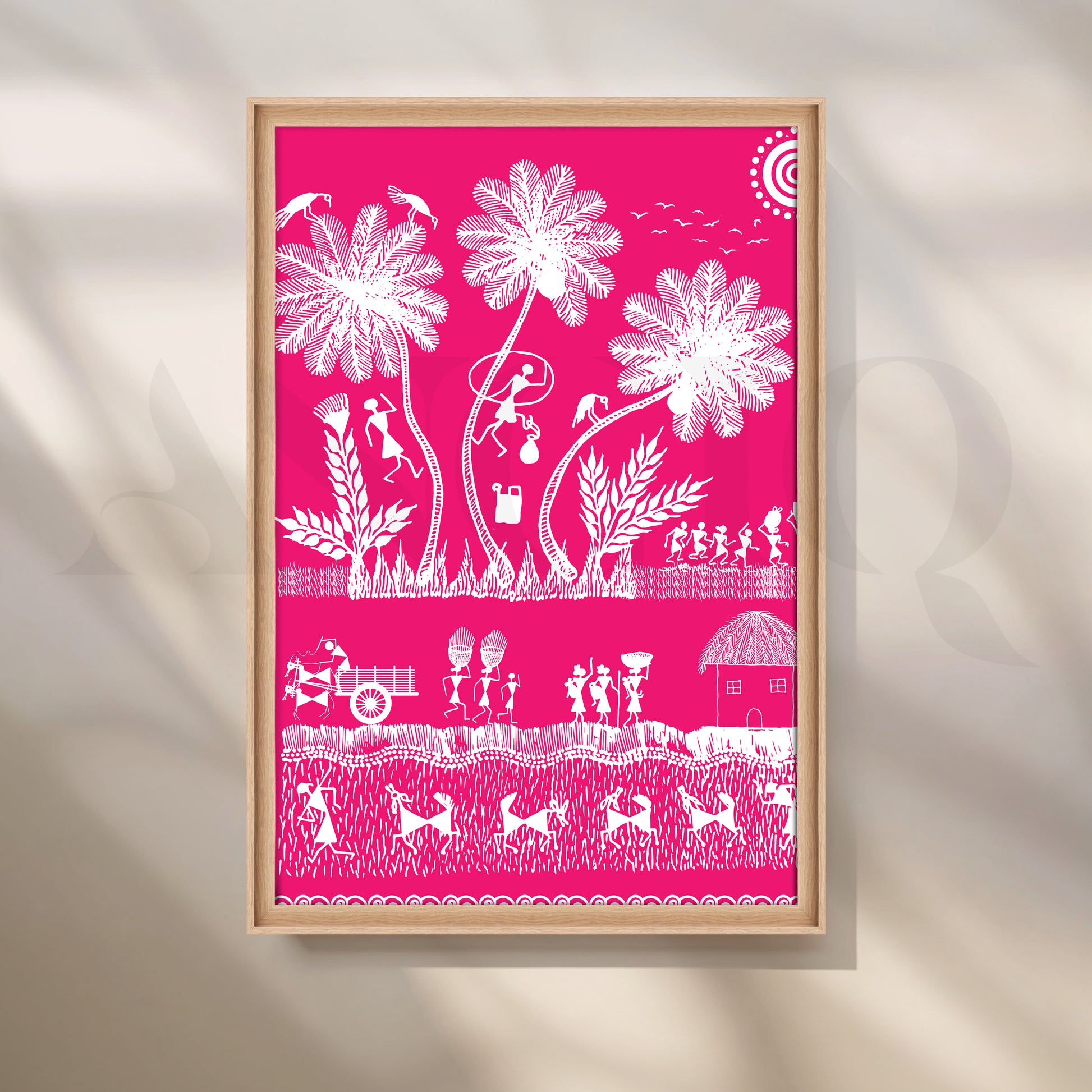‘Pink Warli Village Life’ Canvas Painting for Bedroom & Living Room