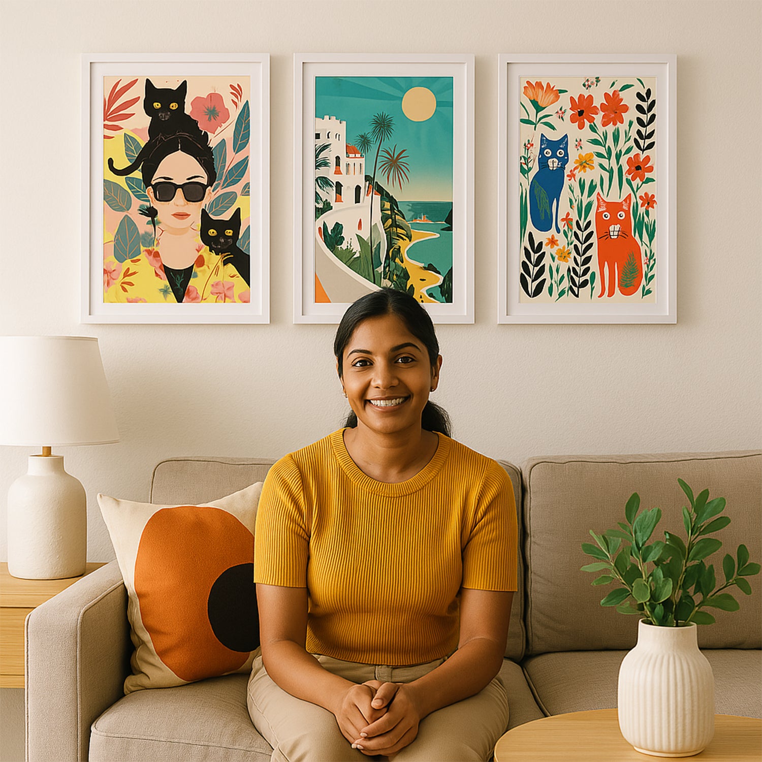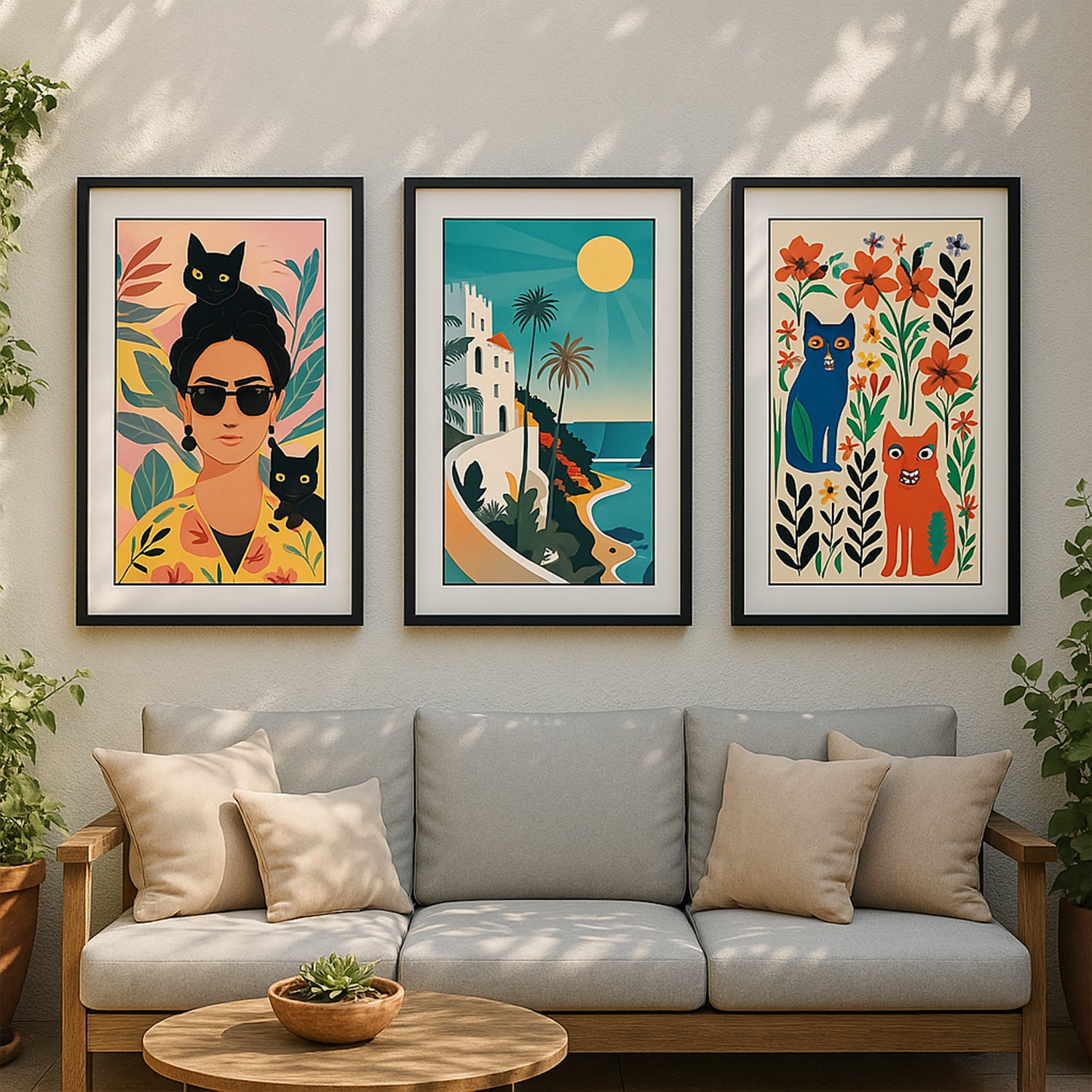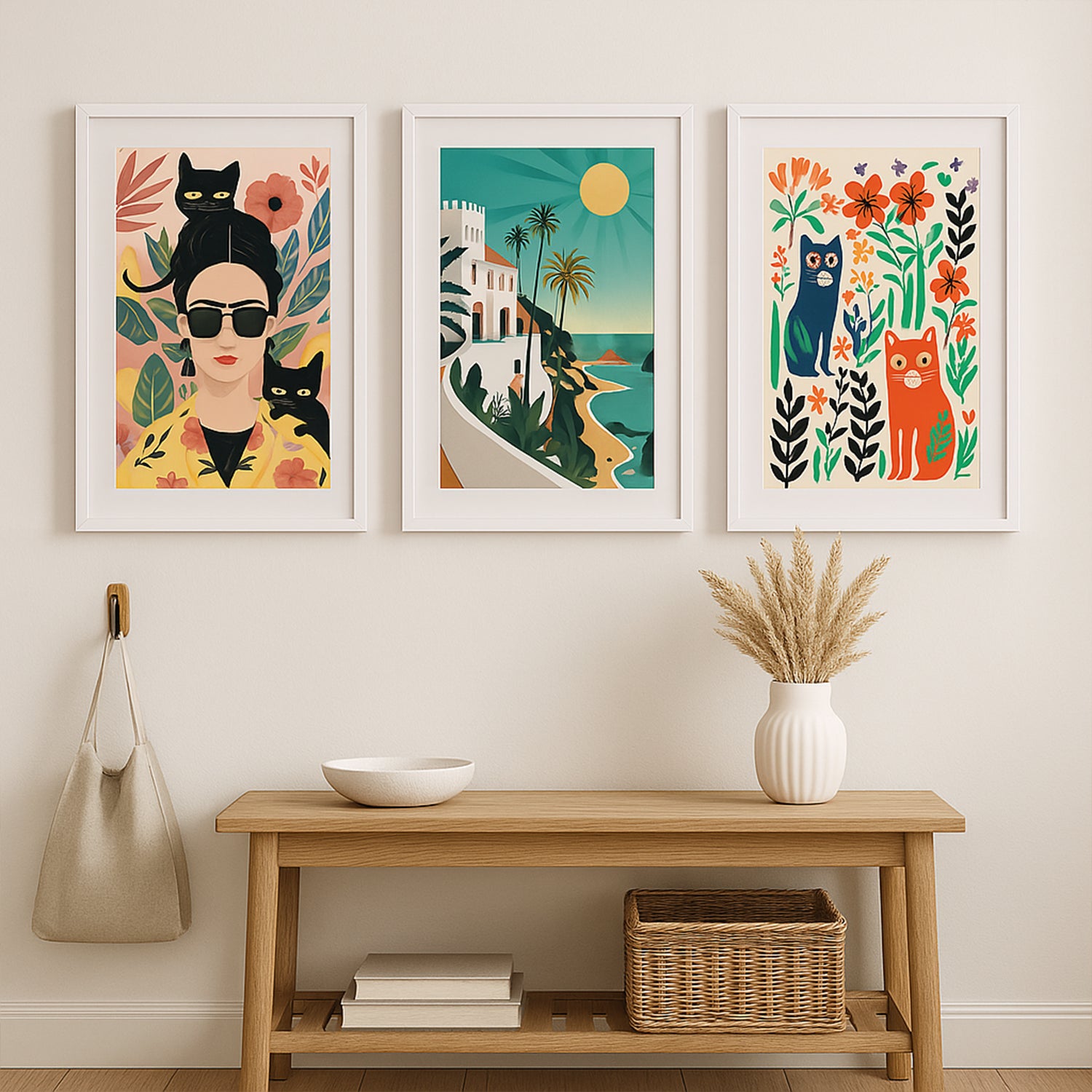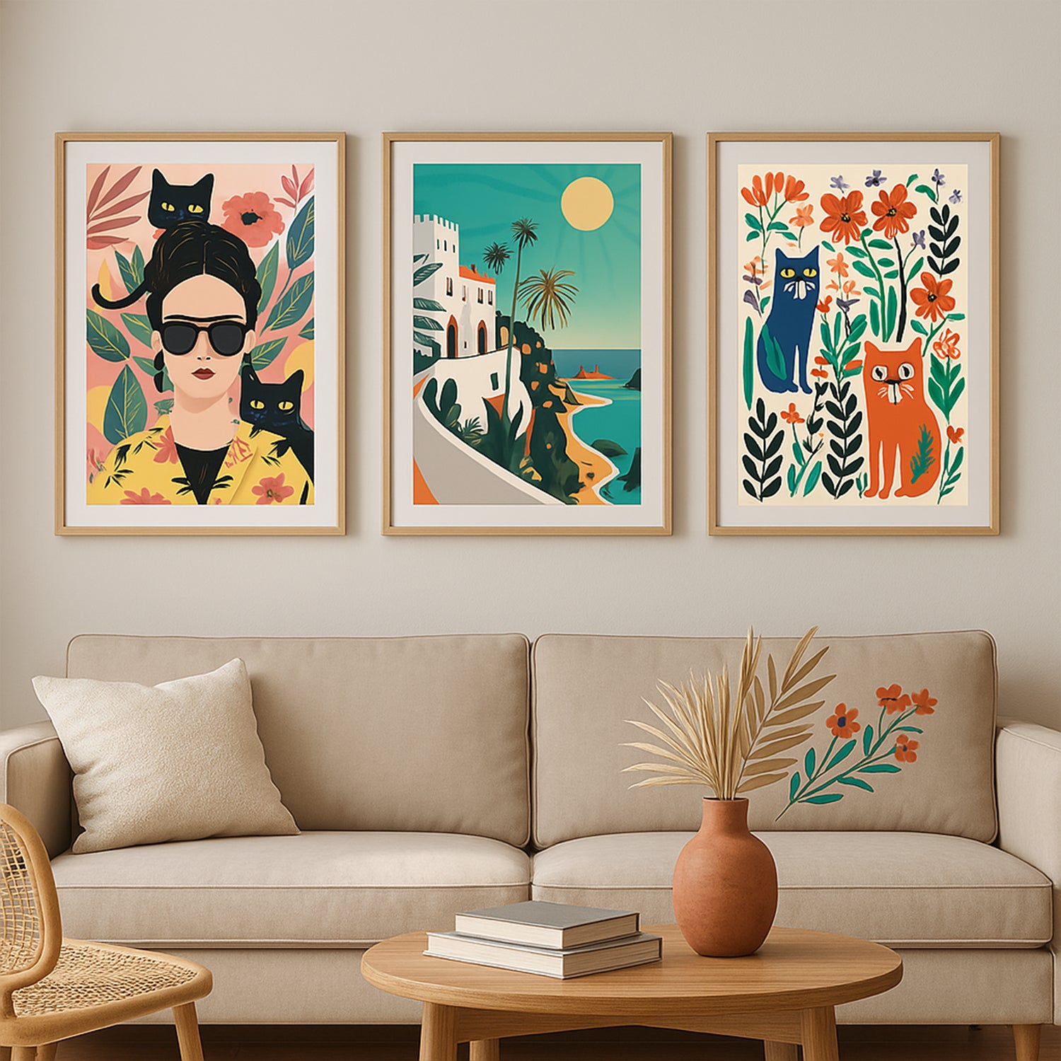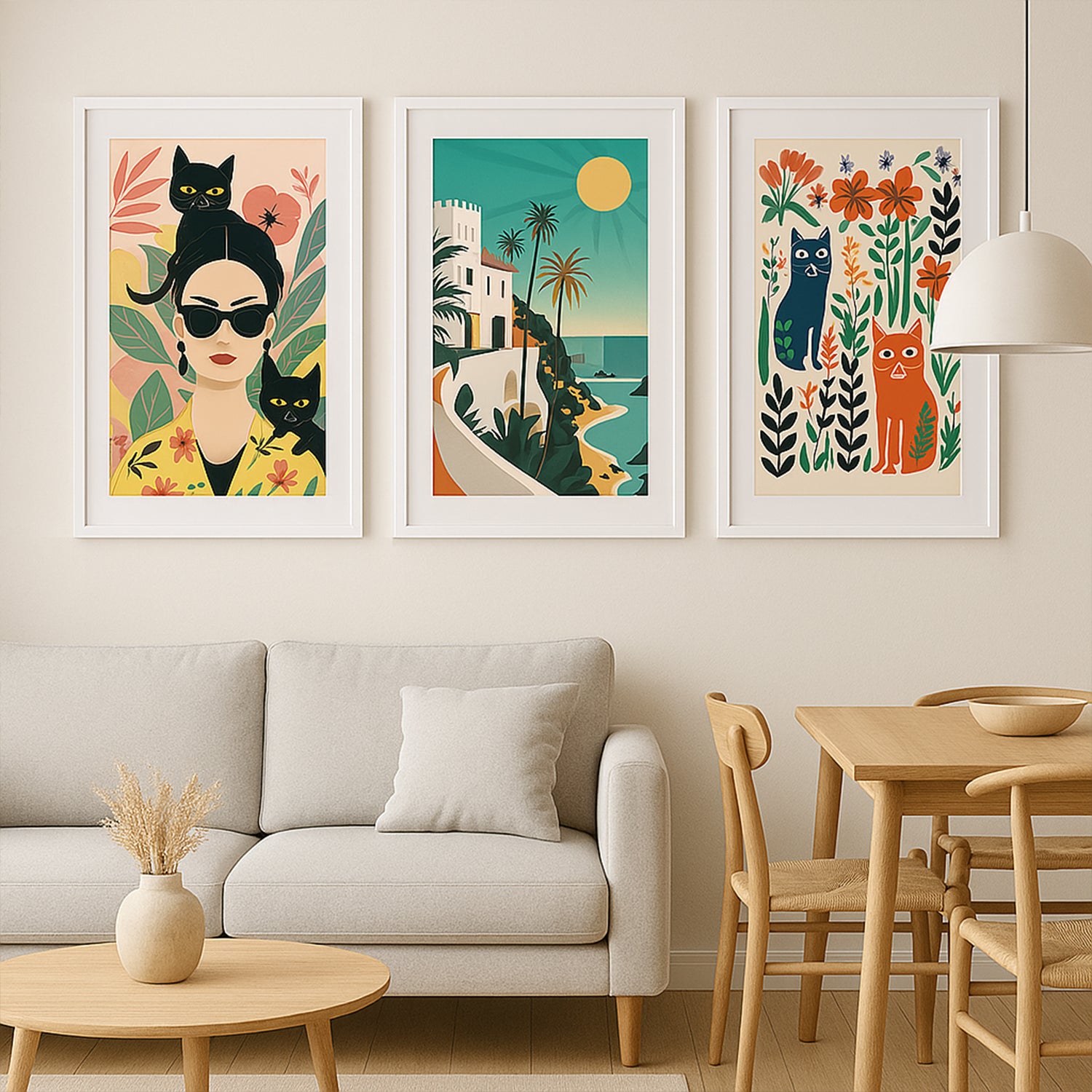 Playful Coastal Charm Gallery Walls mix bold portraits, whimsical cats, and scenic seaside architecture. This Gallery walls set adds personality and artistic flair, perfect for entryways or creative corners in your home.