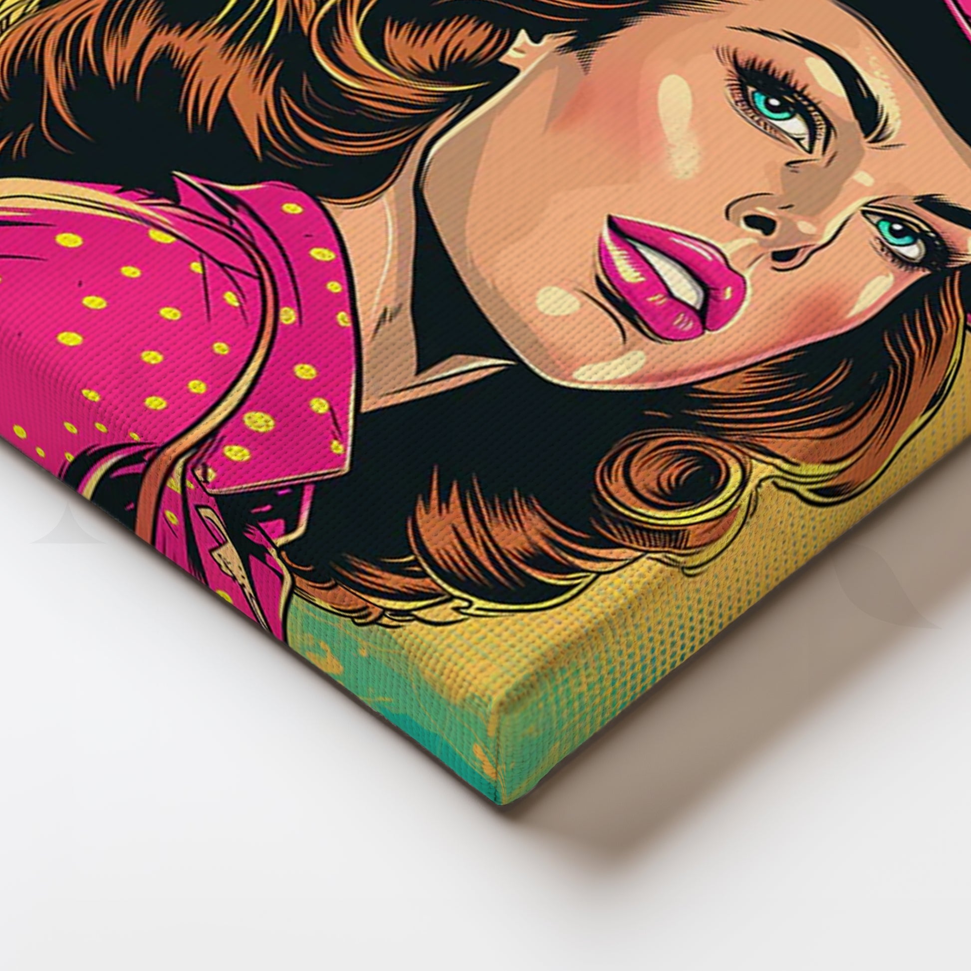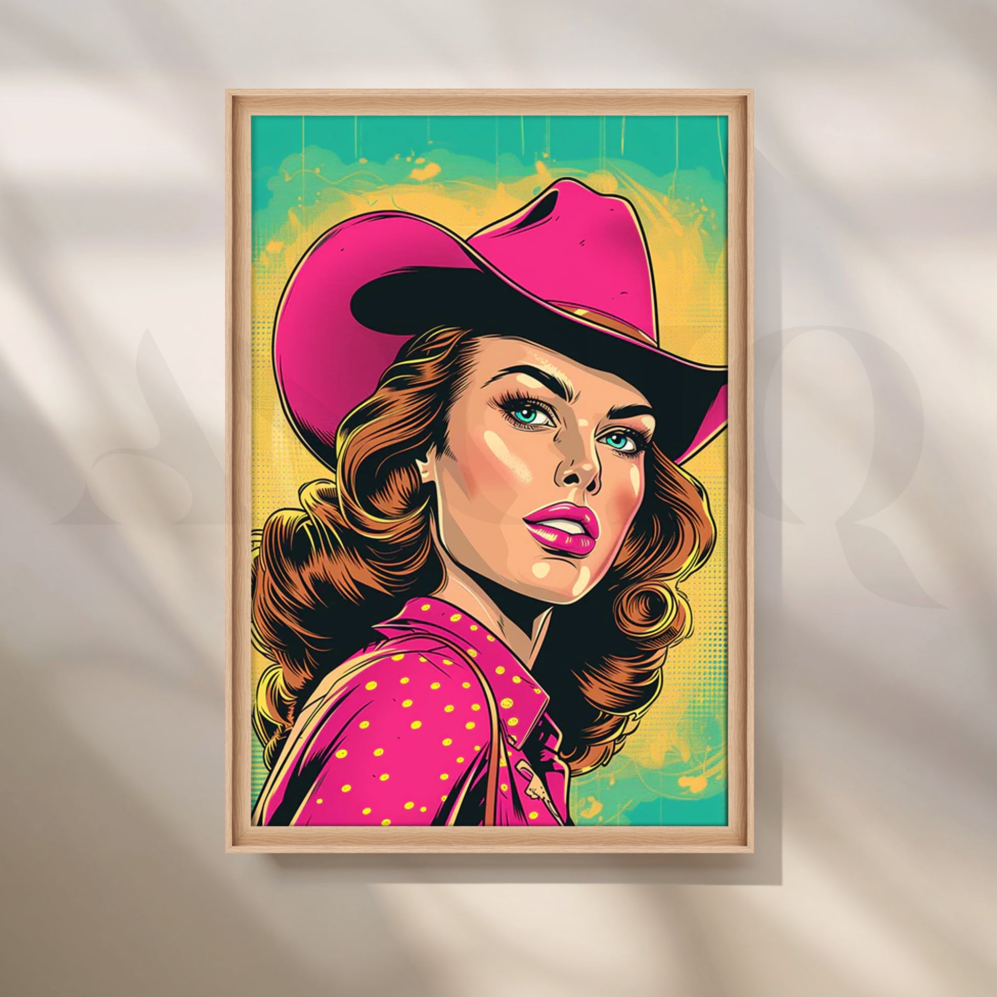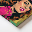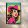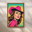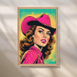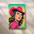 Vibrant comic-style cowgirl in a fuchsia hat and dotted shirt against teal-yellow halftones—retro Western pop that energizes any space. Keywords: cowgirl wall art, pop art portrait canvas, neon pink artwork, retro comic poster, Western pop décor, bold living room statement art.