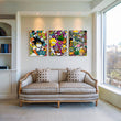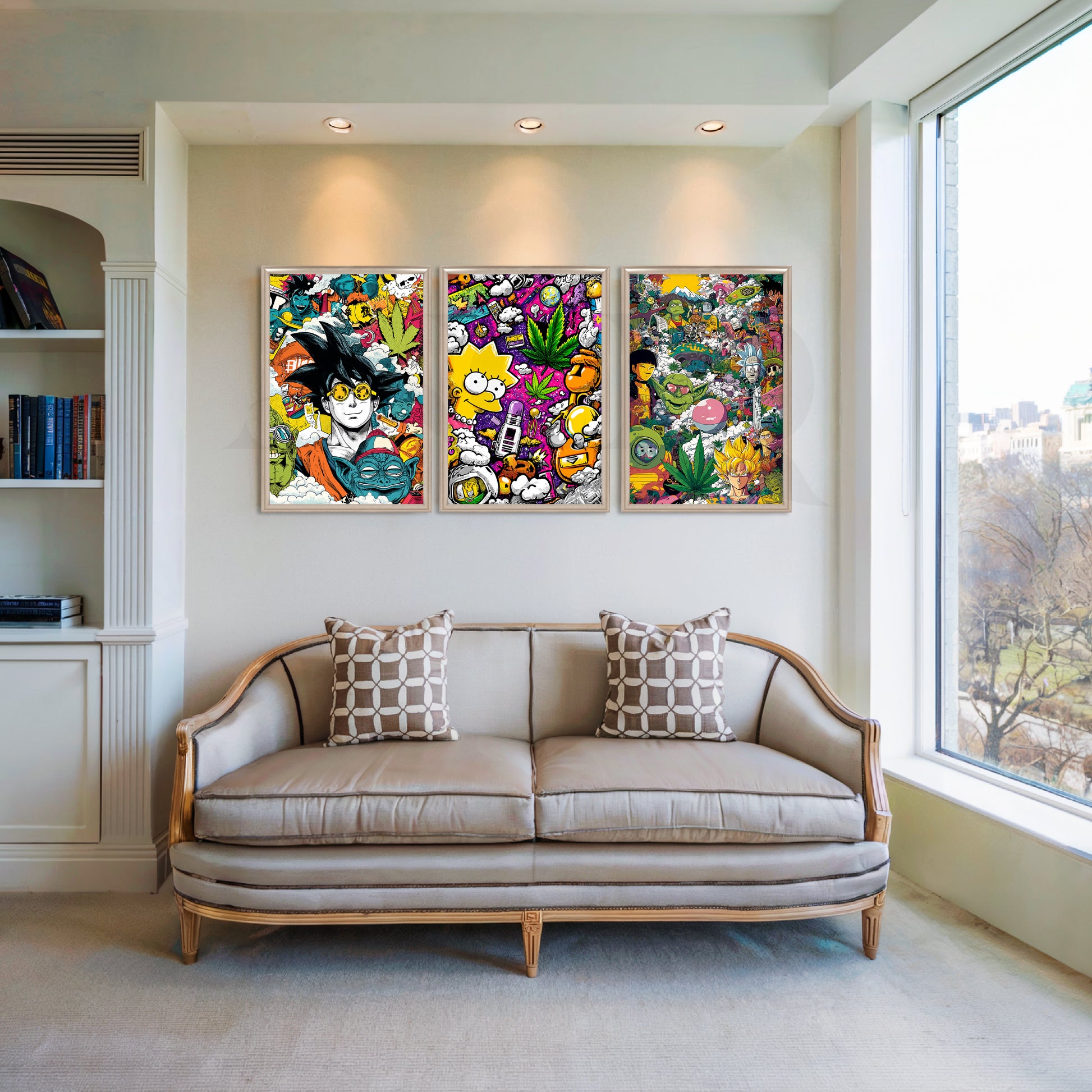 This vibrant pop-culture gallery wall blends graffiti energy, comic-style characters, and bold colour explosions—perfect for adding personality to modern spaces. Ideal for living rooms, gaming rooms, cafés, creative studios, or trendy office corners. The mix of detail and humour instantly becomes a conversation starter while giving your space a fun, youthful, and expressive vibe.