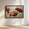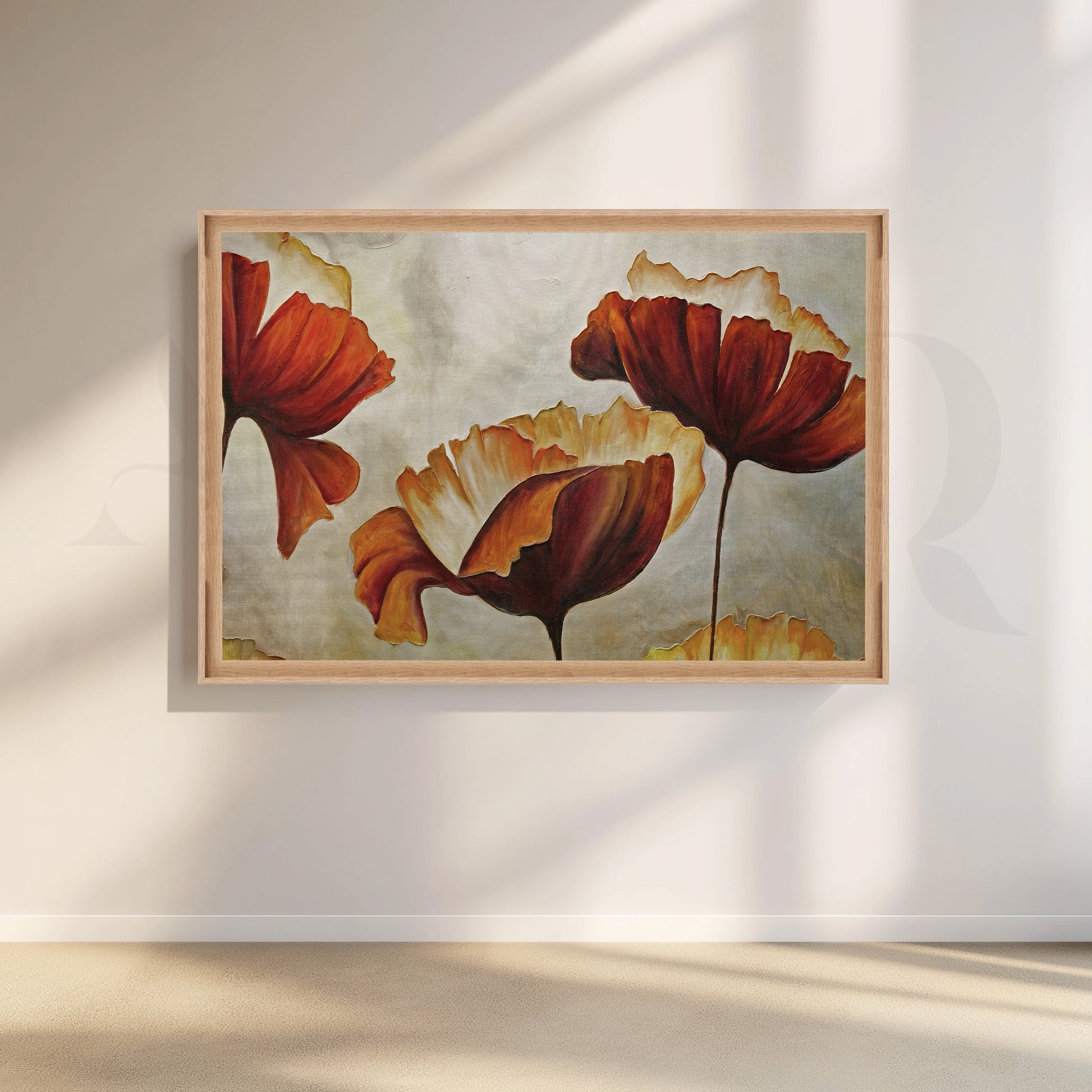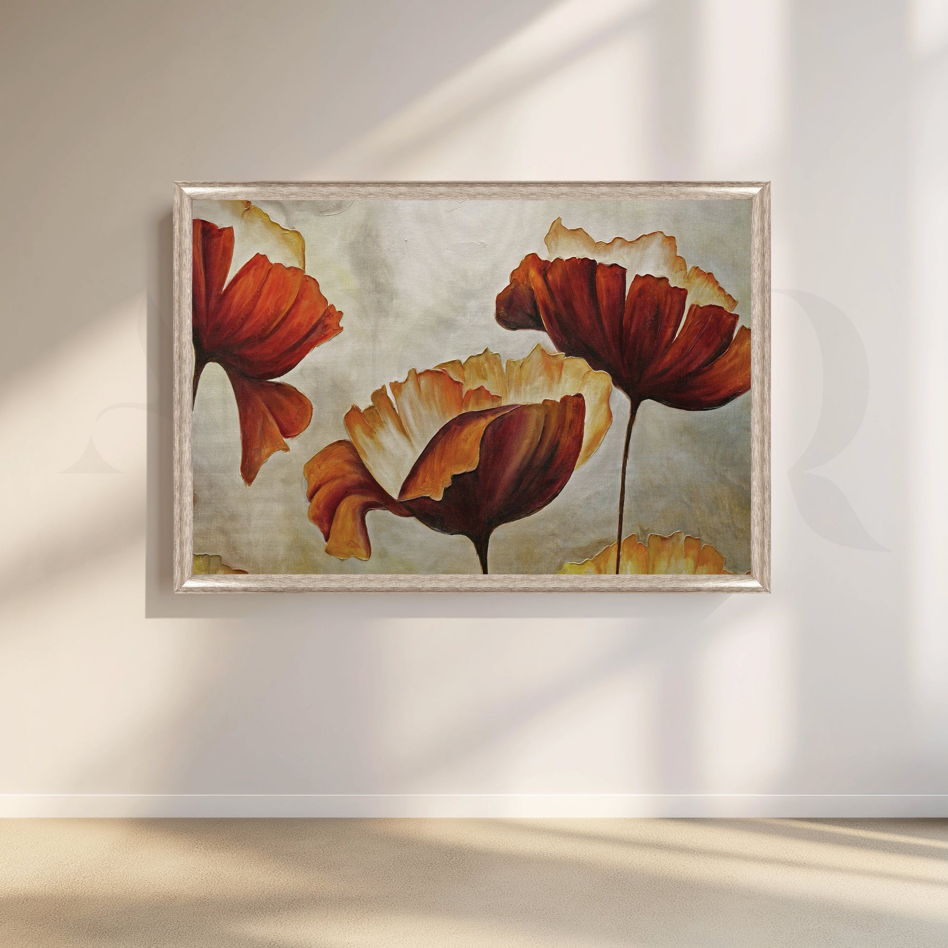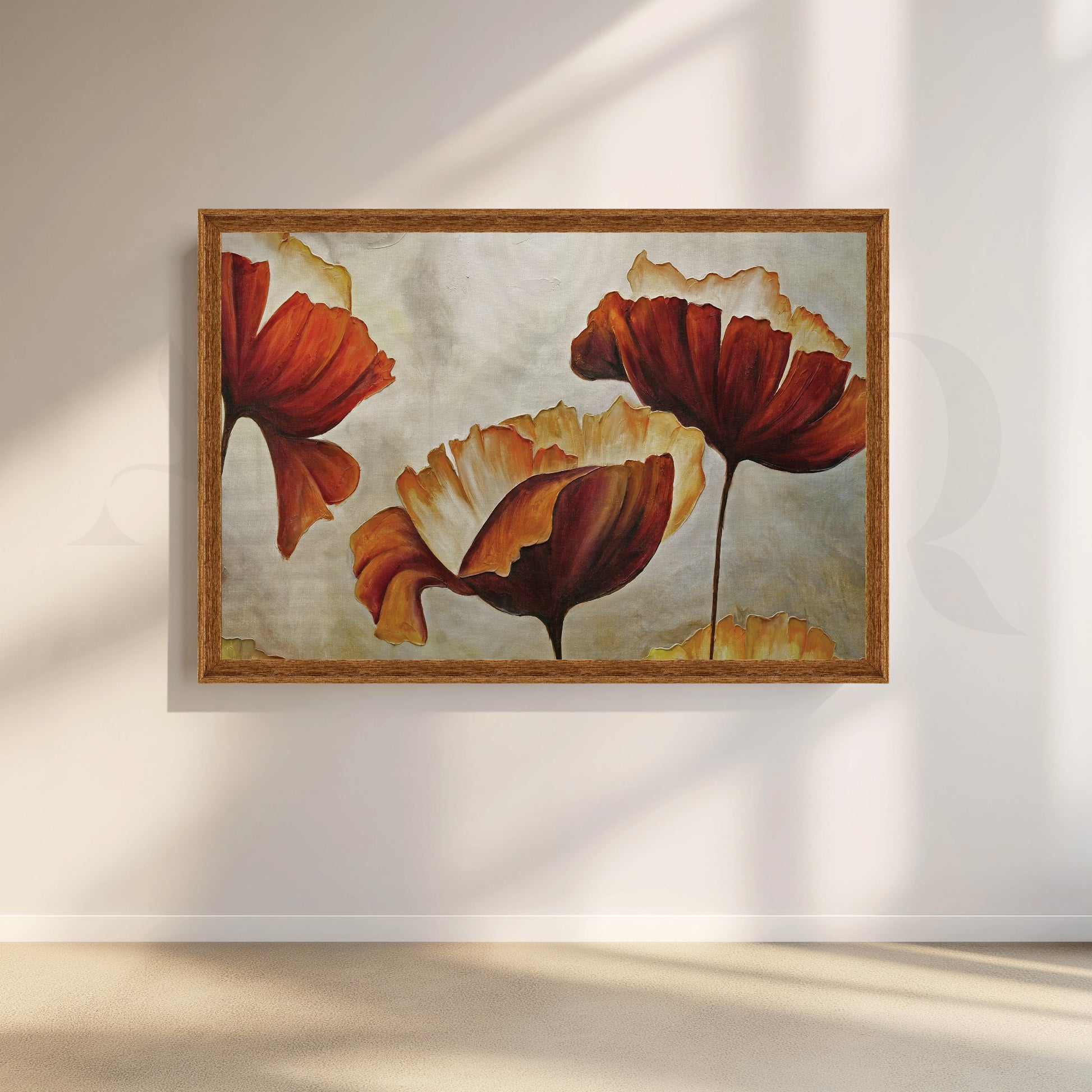 This vibrant painting features a field of red poppies with hints of orange. The flowers are displayed in a close-up view, with their delicate petals and textured centers filling the canvas. The background is a simple wash of white, allowing the poppies to take center stage. This beautiful painting would be a striking addition to any home décor.