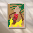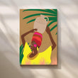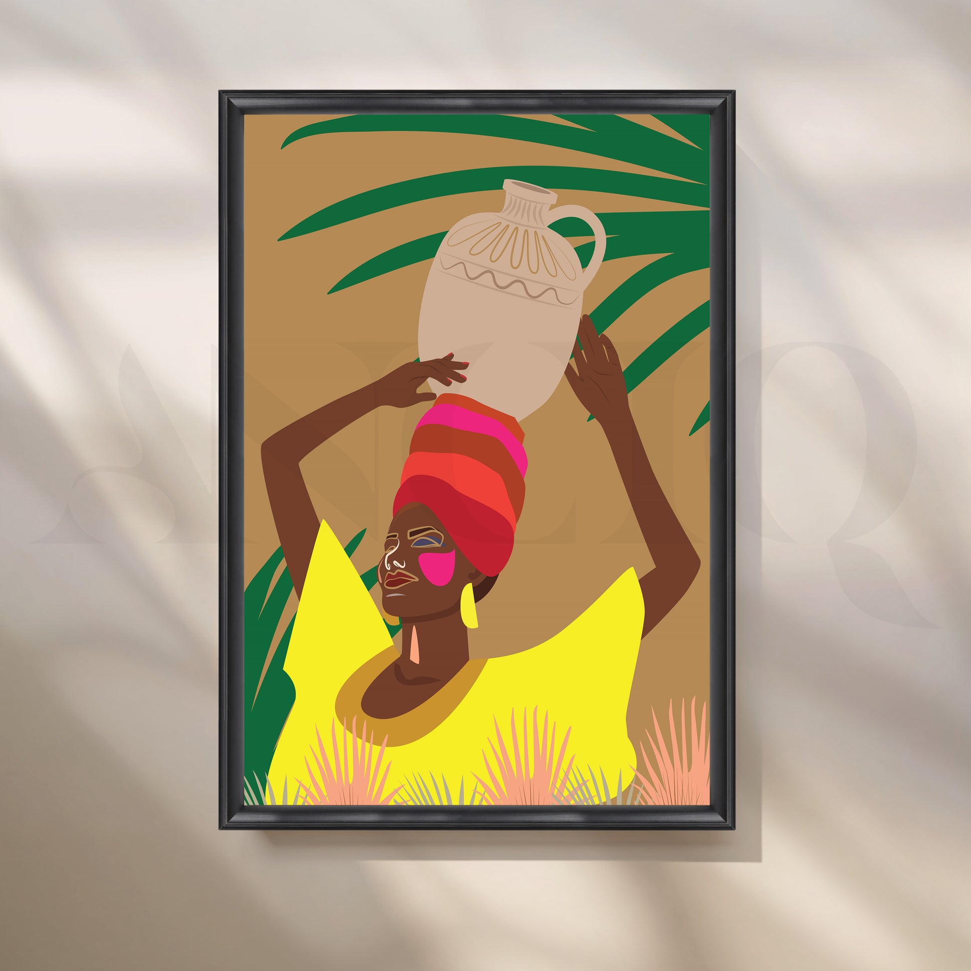 Portrait of an African Woman Carrying a Traditional Jug: Boho Art- This striking illustration portrays an African woman adorned in bold, bright colors. With a jug balanced gracefully on her head, the image reflects cultural traditions. The woman's vivid yellow attire and colorful headwrap stand out against the lush green leaves in the background, emphasizing a connection to nature and heritage. The stylized facial features add a modern touch to this culturally rich artwork.