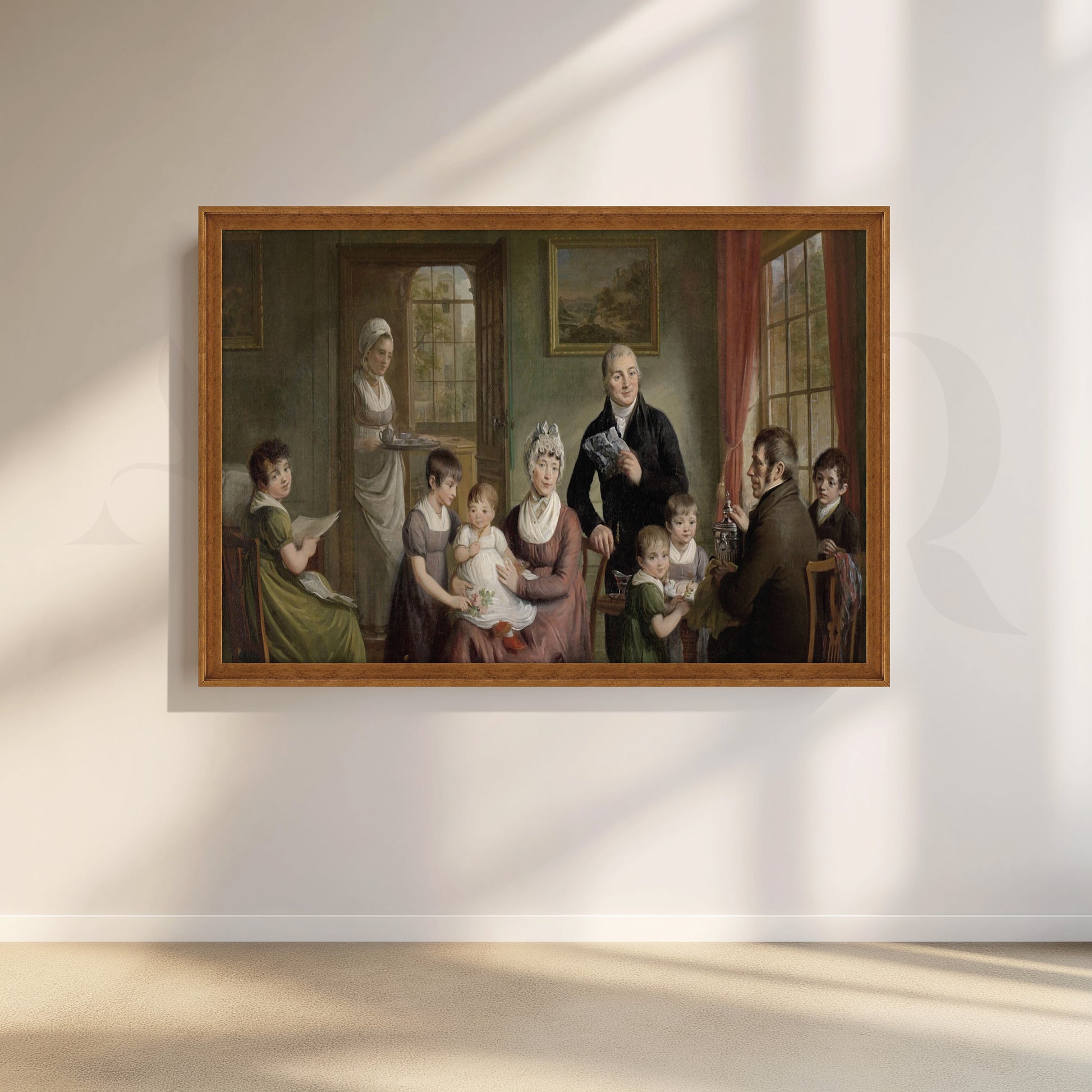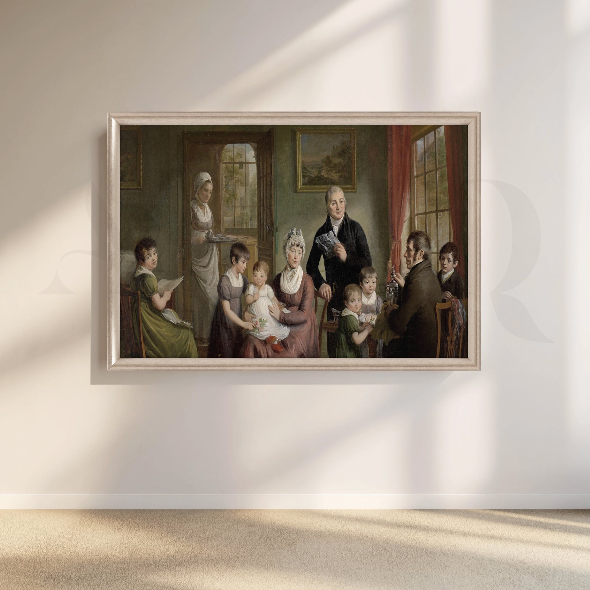 Immerse yourself in this fascinating picture of Dutch domestic life. Adrian de Lely's 1809 masterpiece "Portrait of the Family of Adrianus Bonebakker" presents the silversmith with his family, and friend, in a warm and inviting setting beautiful colors and details that it wonderfully brings the canvas to life, giving us a glimpse of 19th century Amsterdam.