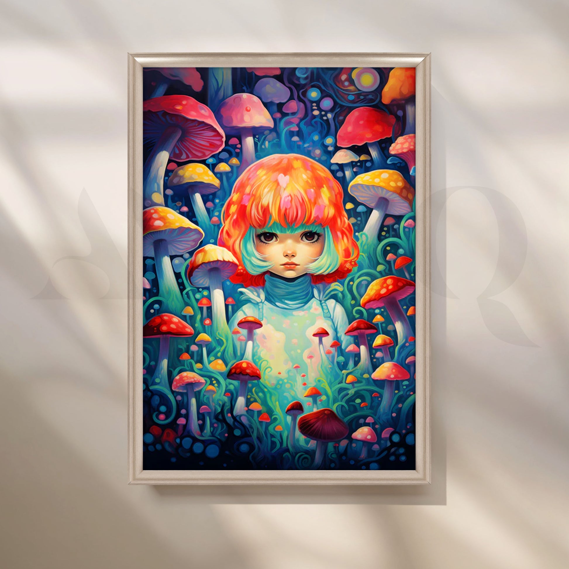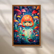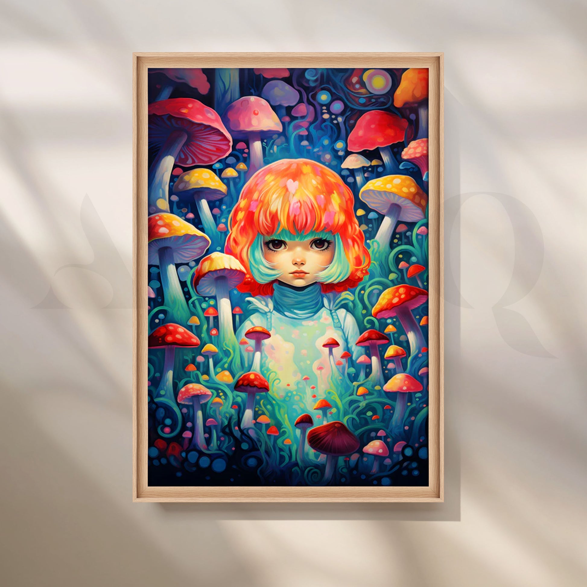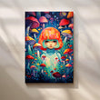 A dreamy pop-surreal portrait of a big-eyed girl with sunset-ombre hair standing in a glowing forest of spotted toadstools—teal, coral and sunshine tones on a deep midnight backdrop. This kawaii fantasy artwork brings cozy magic to bedrooms, nurseries and creative studios. Keywords: mushroom girl wall art, kawaii canvas print, pop surrealism painting, anime-inspired illustration, toadstool forest artwork, big eyes art, pastel nursery décor, whimsical kids room decor, teal and coral wall art, cottagecore fantasy poster.