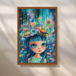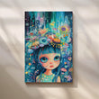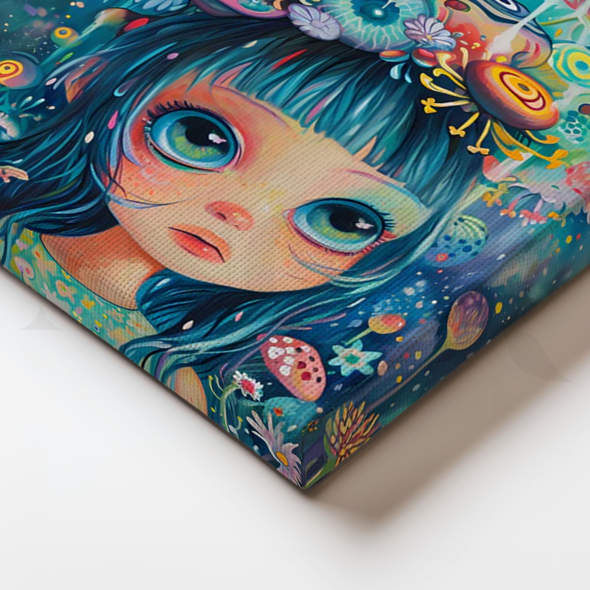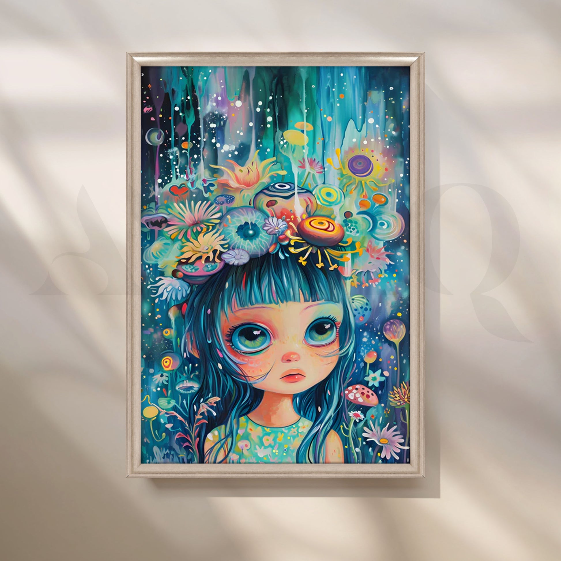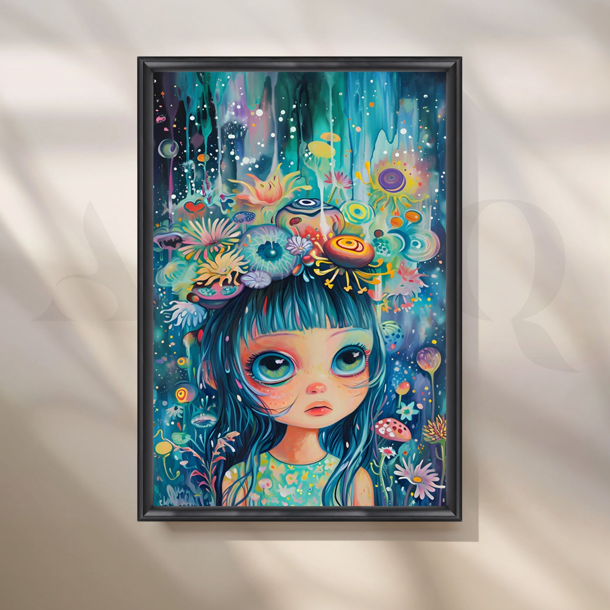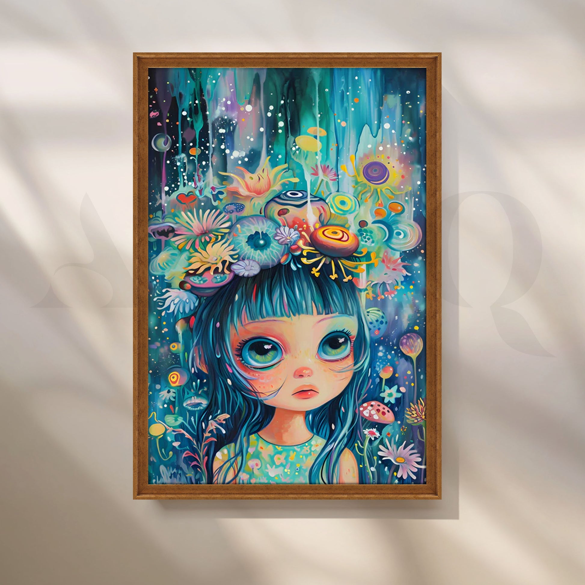 A dreamy pop-surreal portrait of a big-eyed girl with teal hair crowned by swirling cosmic florals—stars, orbs, and dripped galaxy textures in aqua, coral and yellow. This kawaii fantasy artwork brings whimsical, boho charm to bedrooms, nurseries and creative studios. Keywords: pop surrealism wall art, big eyes girl canvas, floral crown portrait, cosmic galaxy art, kawaii poster, teal bedroom décor, whimsical nursery print, colorful fantasy illustration, modern boho wall art.
