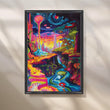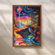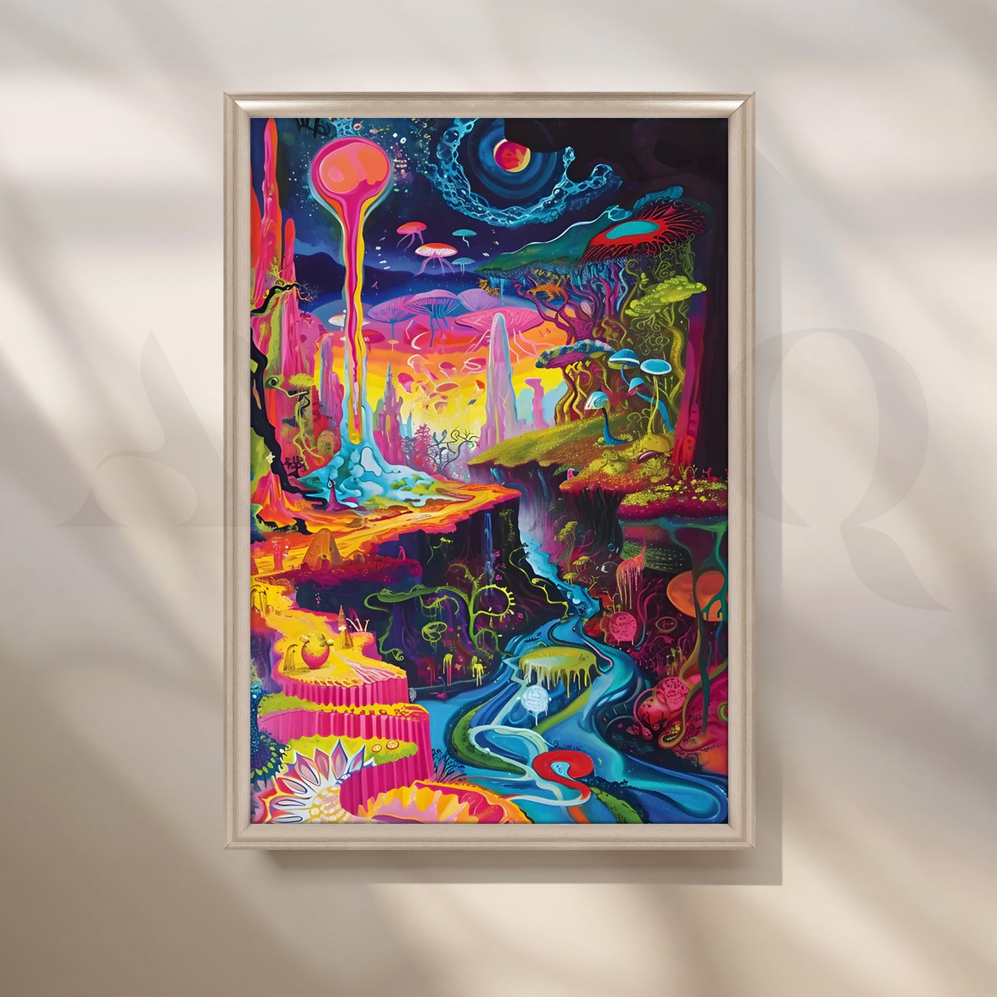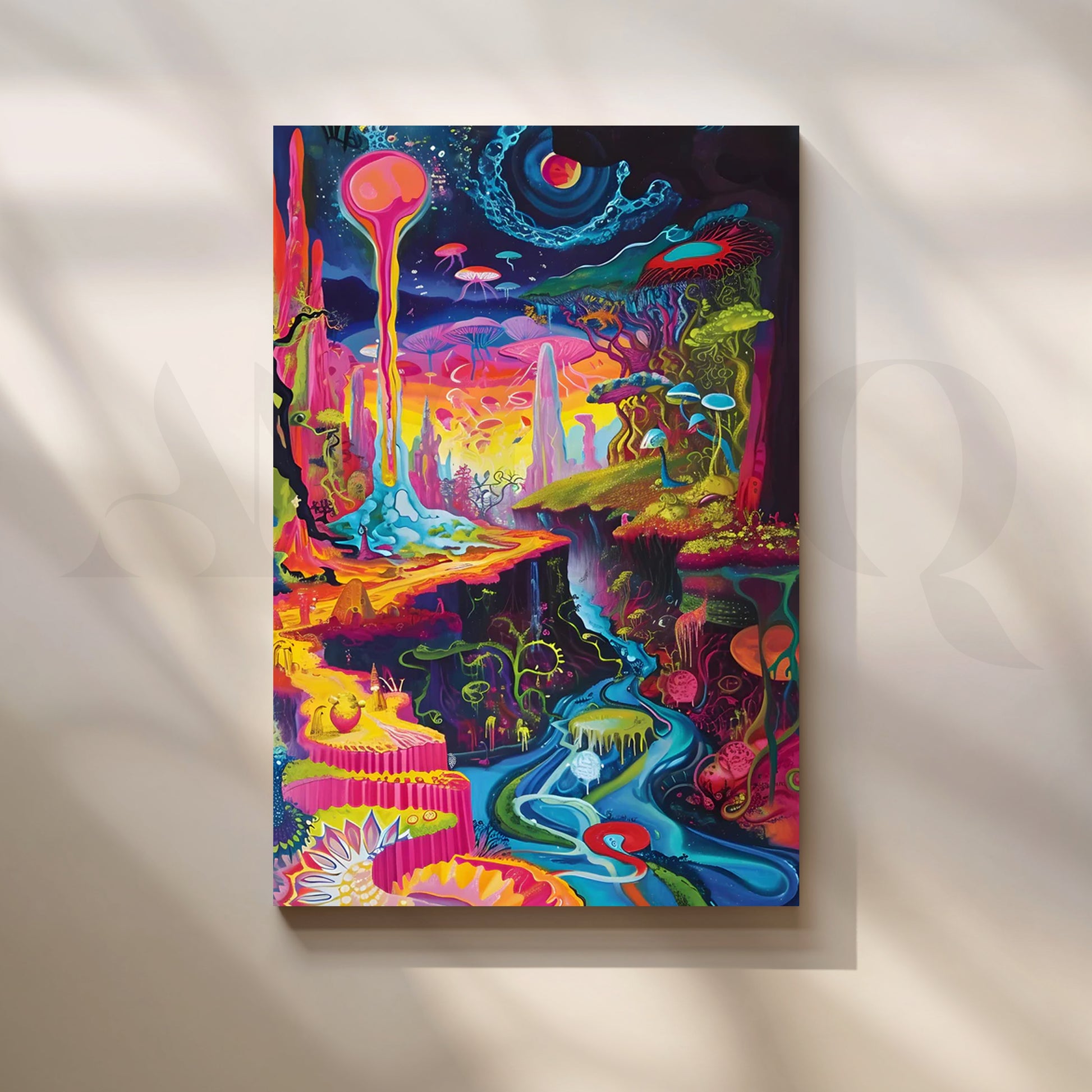 Dripping planets, liquid horizons, and candy-bright color fields collide in this cosmic abstract—equal parts pop-surrealism and psychedelic art. The glossy, high-contrast palette (magenta, turquoise, lemon, and night-sky blue) energizes a home office, studio, or lounge while staying sleek as modern wall art. Perfect for searchers of “trippy canvas painting,” “colorful abstract art,” and “statement wall décor."