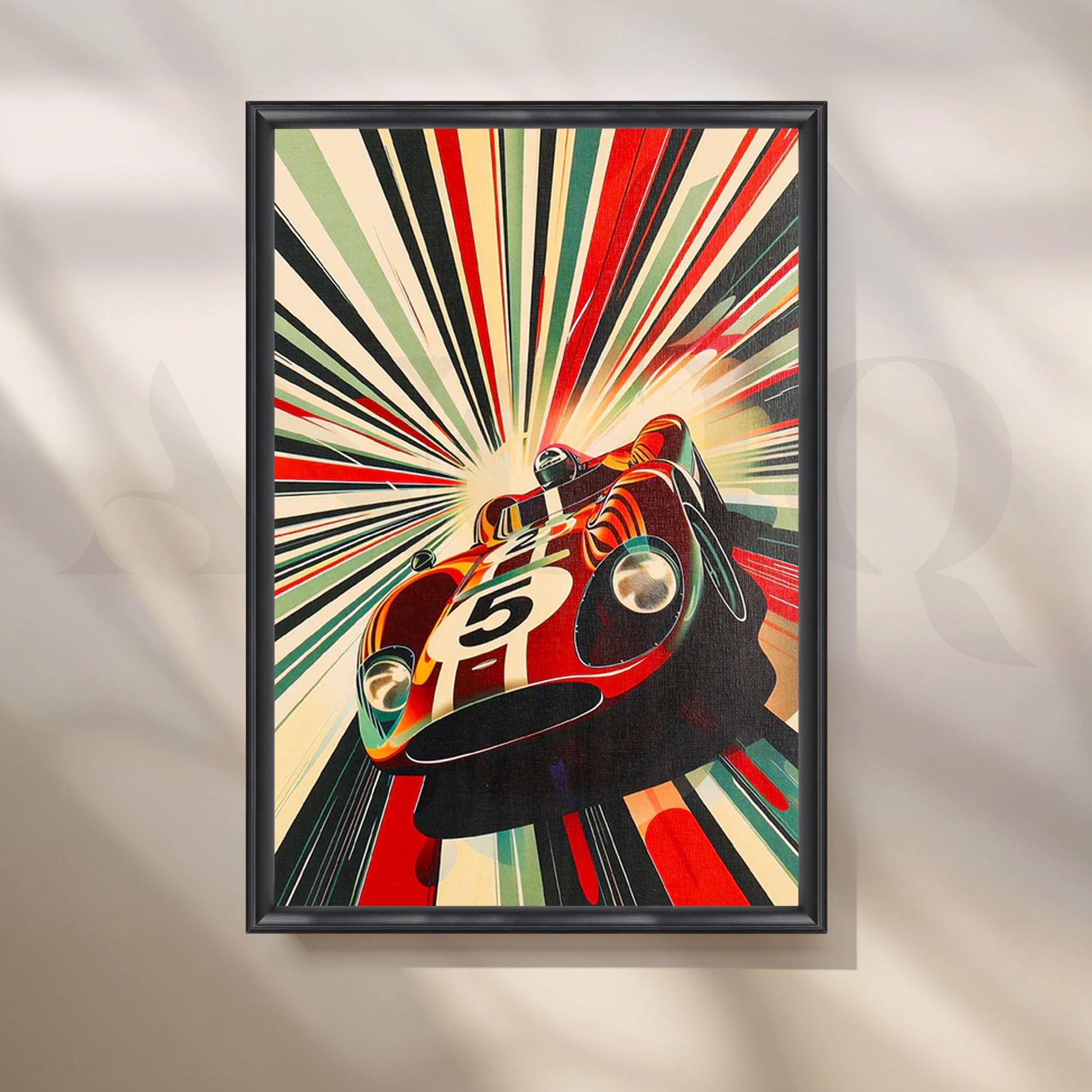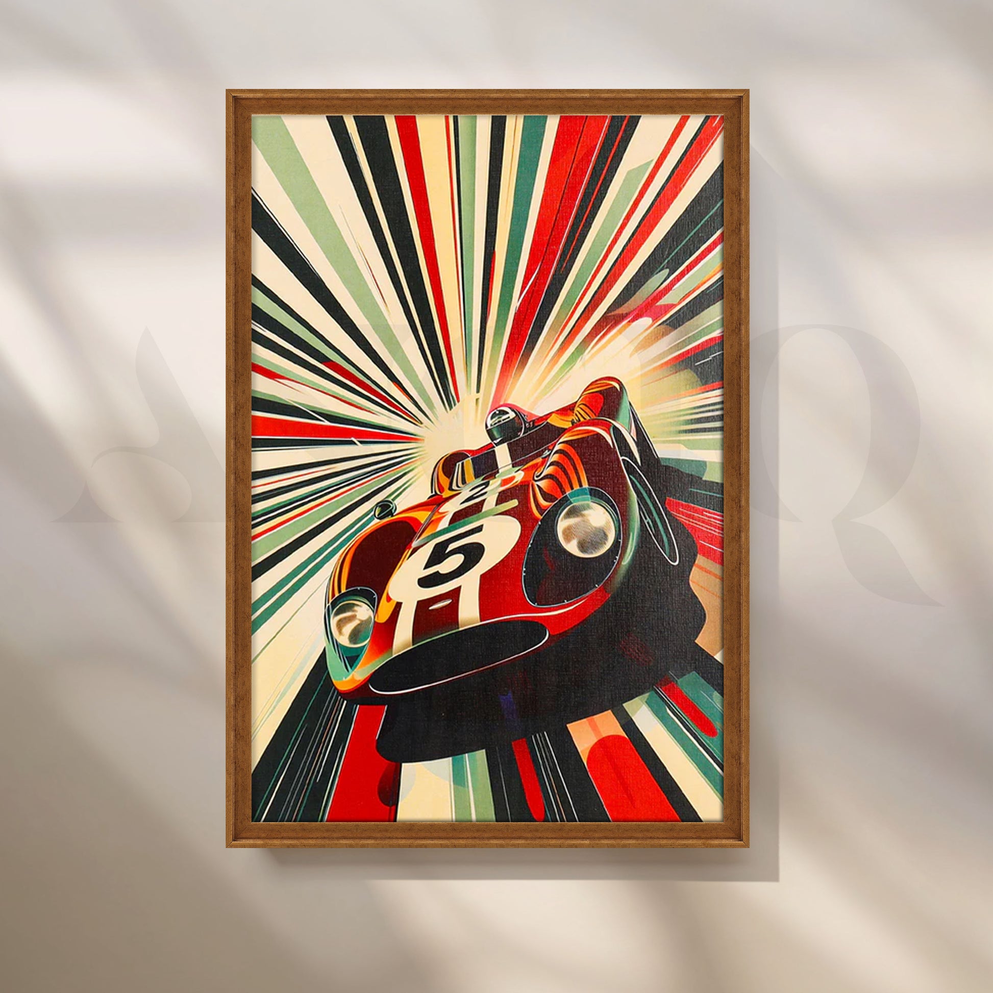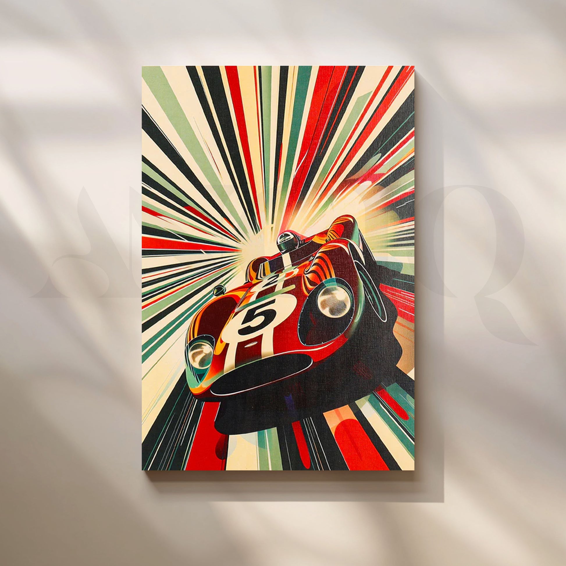 High-energy vintage motorsport artwork: a red race car with bold number 5 explodes from dynamic radial speed lines in cream, teal and scarlet. Perfect statement piece for game rooms, garages and man caves. Keywords: racing car wall art, vintage race poster, retro motorsport canvas, red sports car painting, speed lines artwork, garage décor, boys room art, adrenaline wall decor, classic racing print.