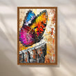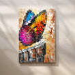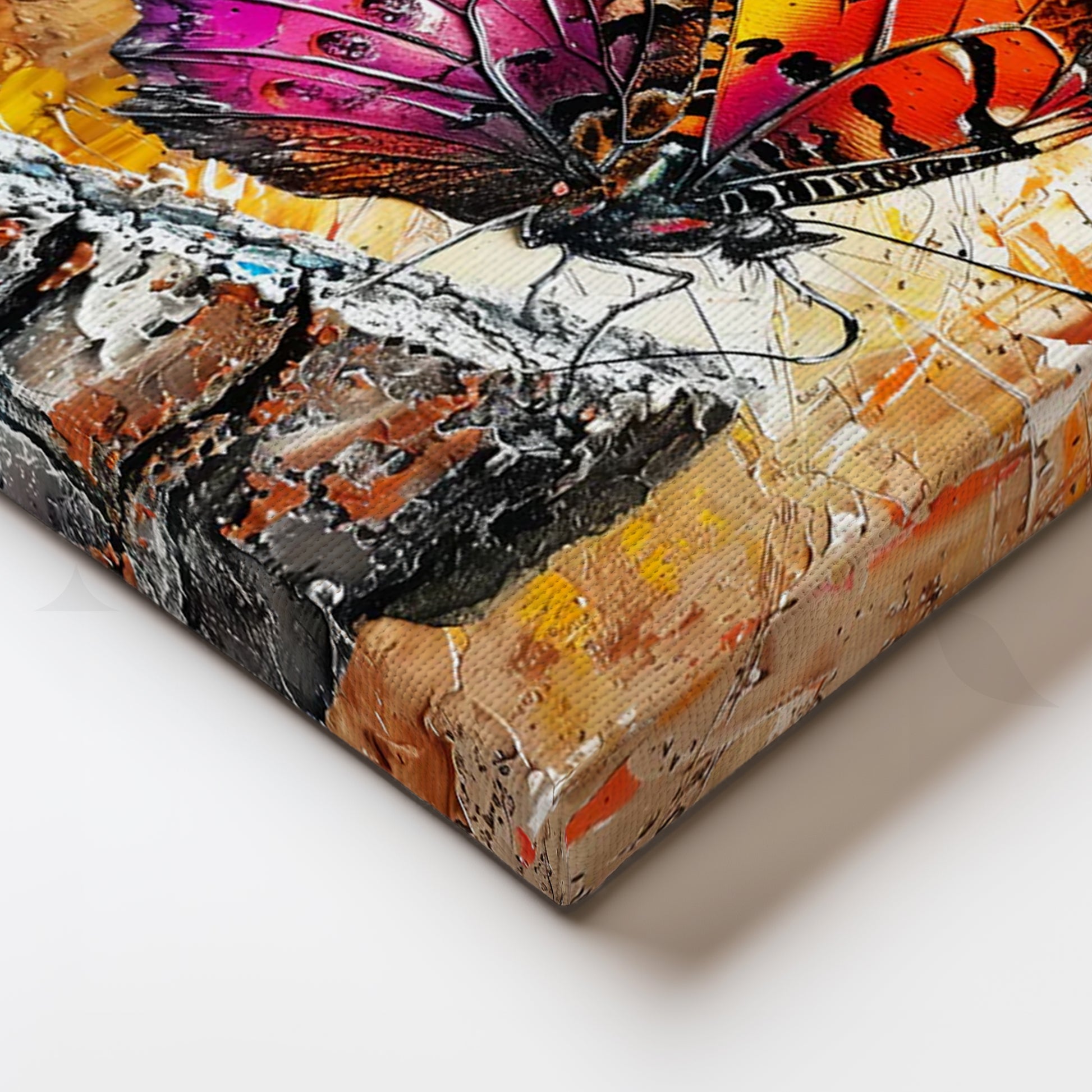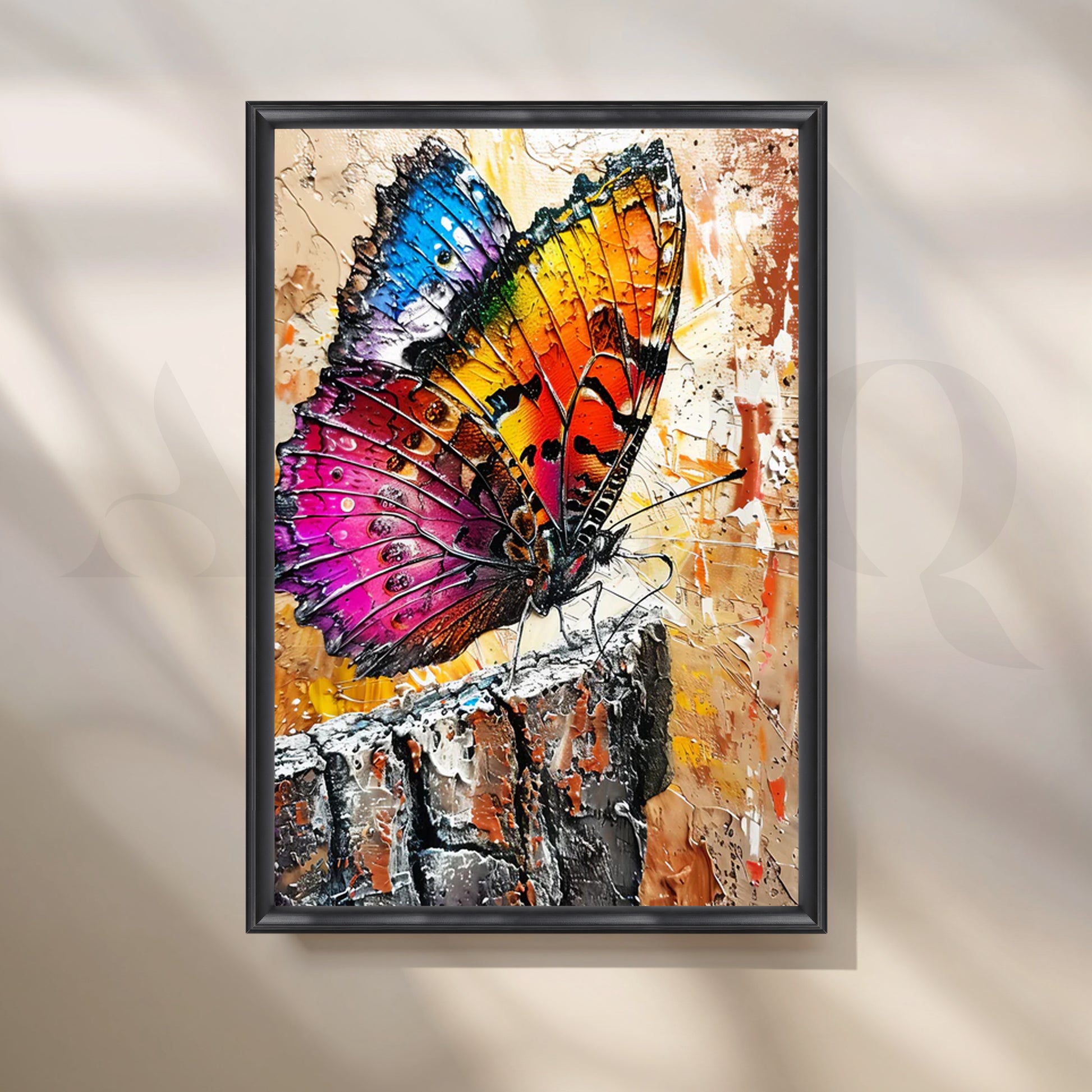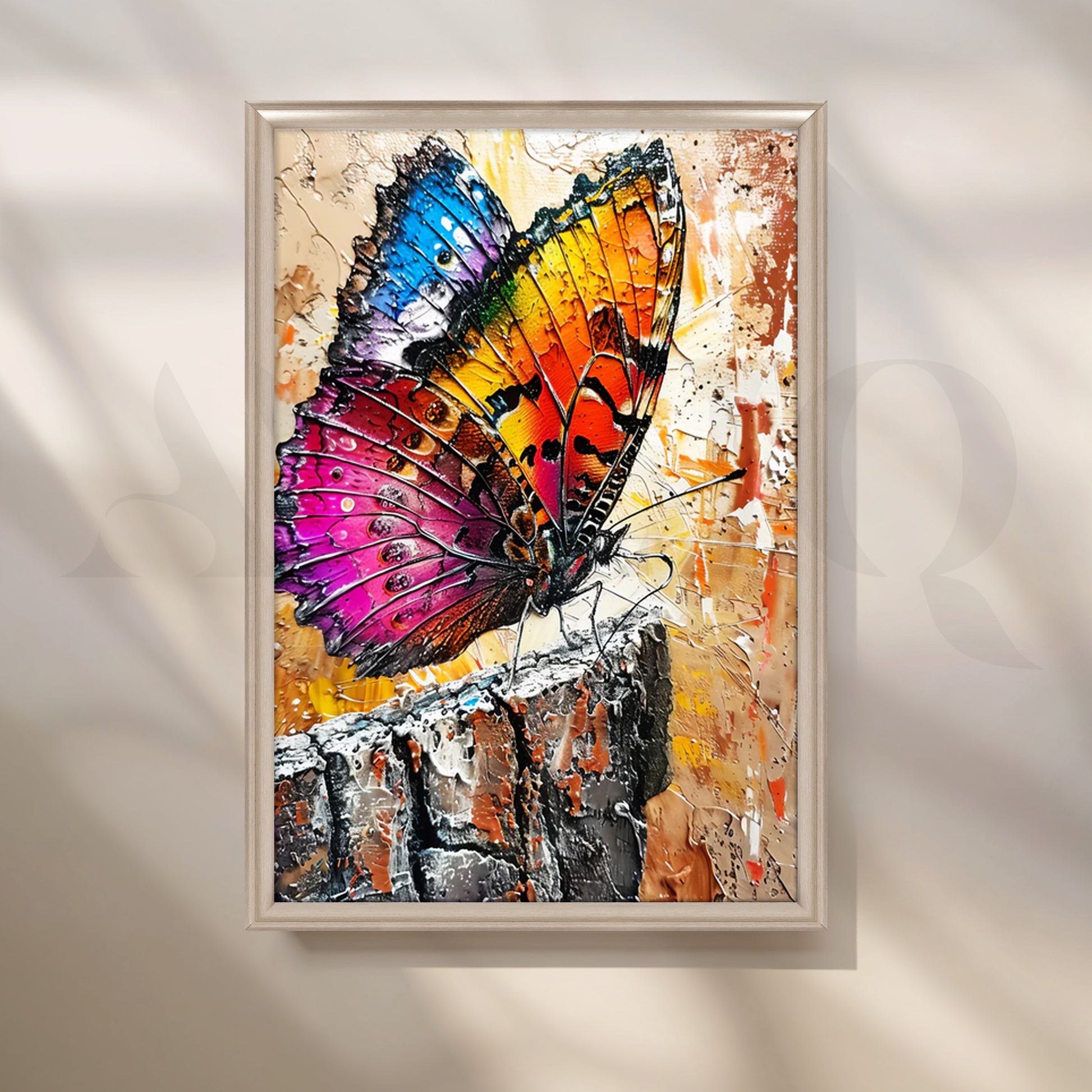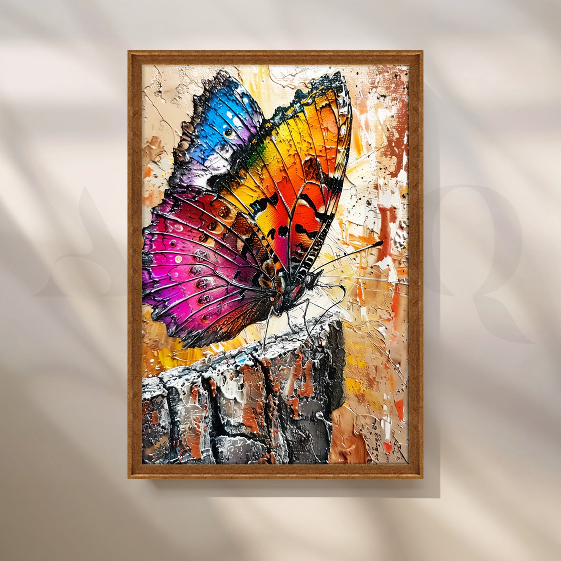 Vibrant butterfly wall art in layered, impasto texture—magenta, orange, yellow, and electric blue wings perched on stone—adds a bold pop of color to modern living rooms. This contemporary canvas painting brings uplifting, nature-inspired energy and works beautifully as large living room art, entryway statement décor, or above-sofa focal piece. Perfect for bright, modern wall art lovers and giftable for boho bedroom décor or creative office spaces.