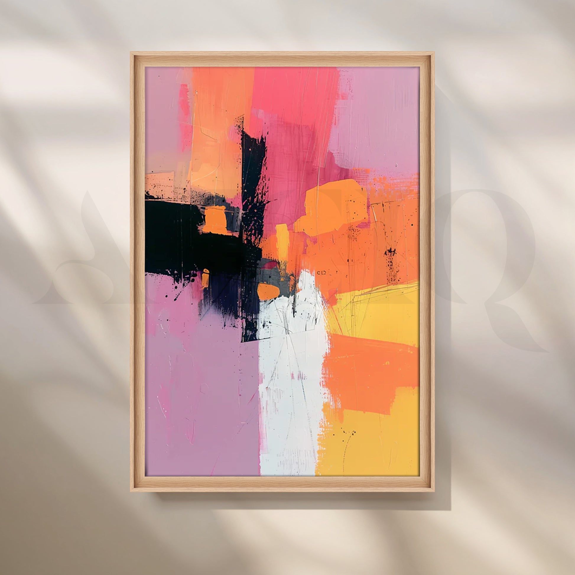 “Sunset Fragments” is a warm, contemporary abstract canvas painting with palette-knife textures in coral, tangerine, blush pink, lilac, mustard yellow, deep charcoal, and a crisp white swipe. Bold color blocks and expressive brushwork create a vibrant focal point that energizes a modern living room, open-plan space, or creative office. This modern wall art works beautifully as large living room art above the sofa, minimalist abstract canvas for entryway décor, or boho bedroom décor—perfect for anyone seeking colorful abstract wall art, geometric canvas painting, or statement neutral-meets-bright home décor.